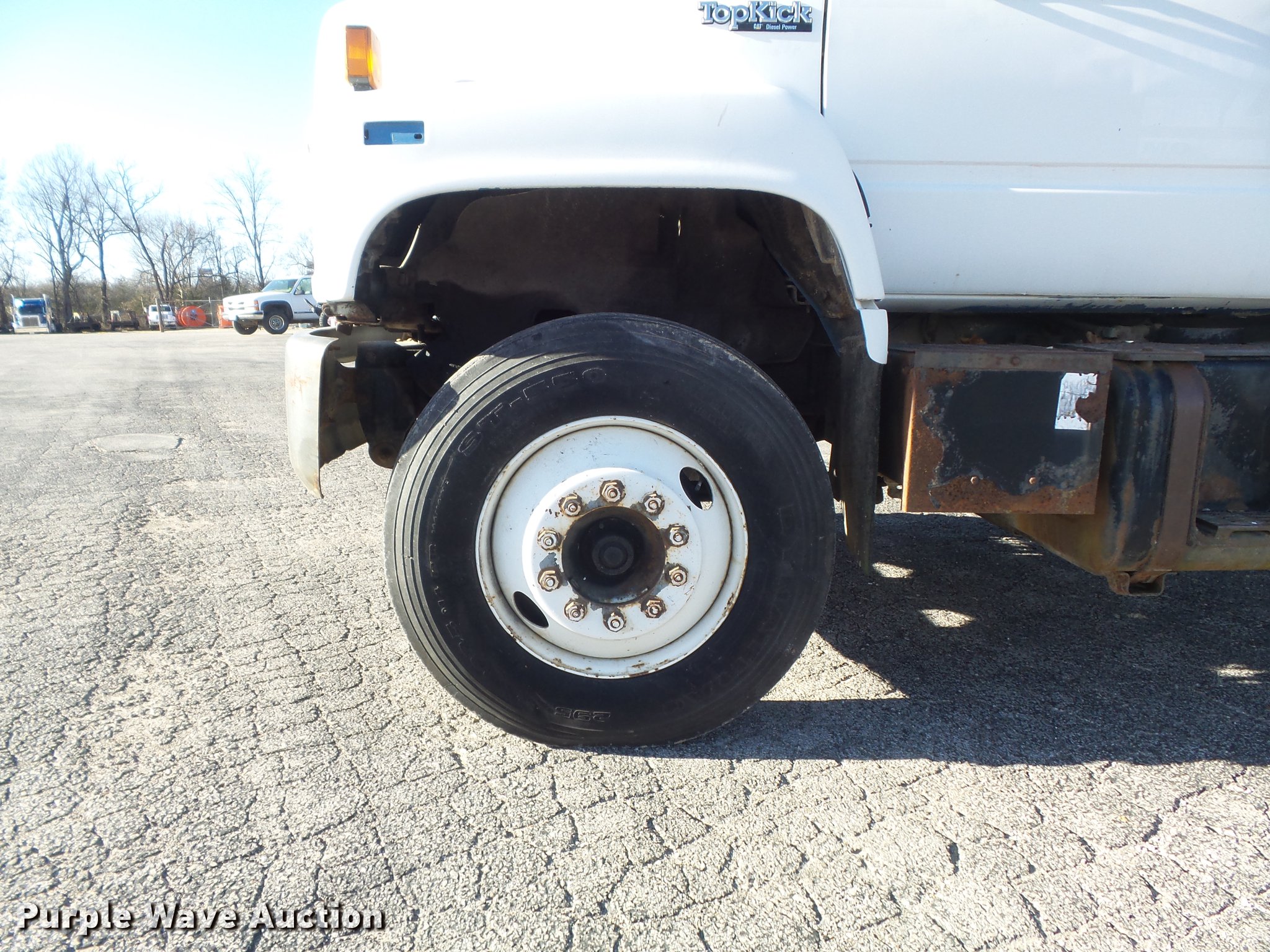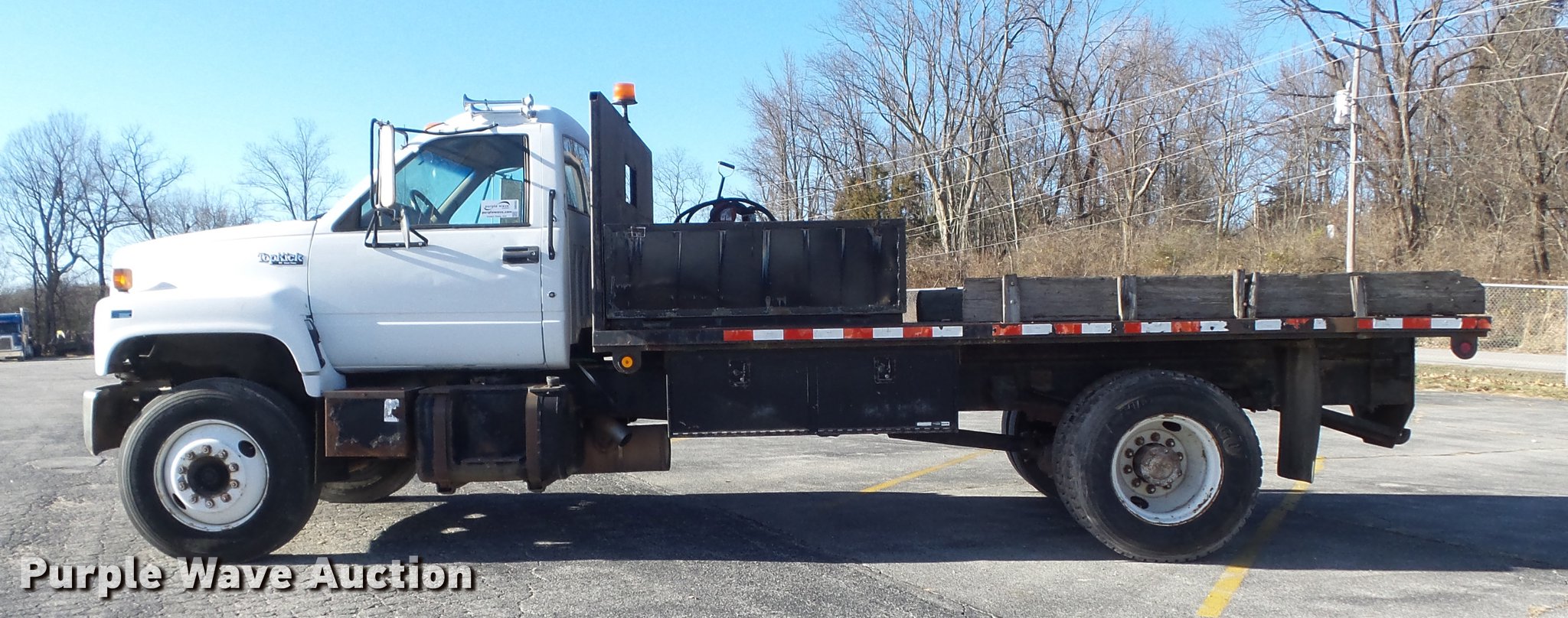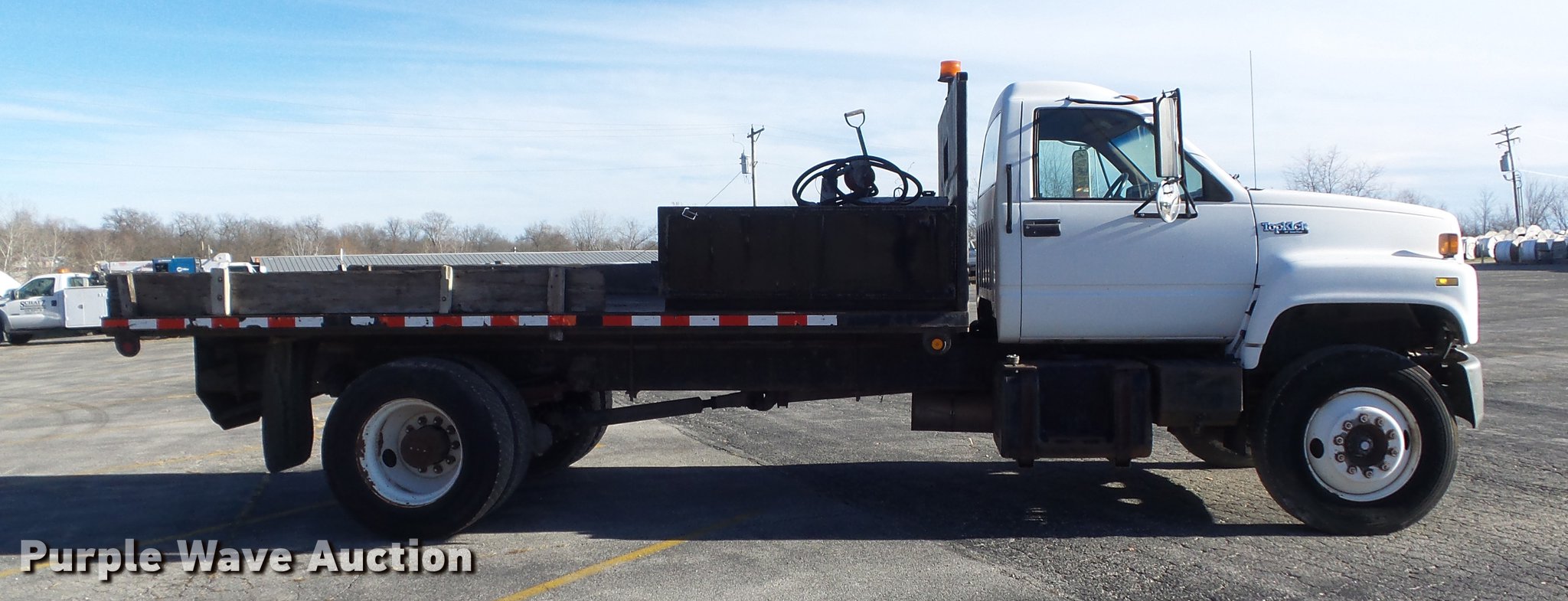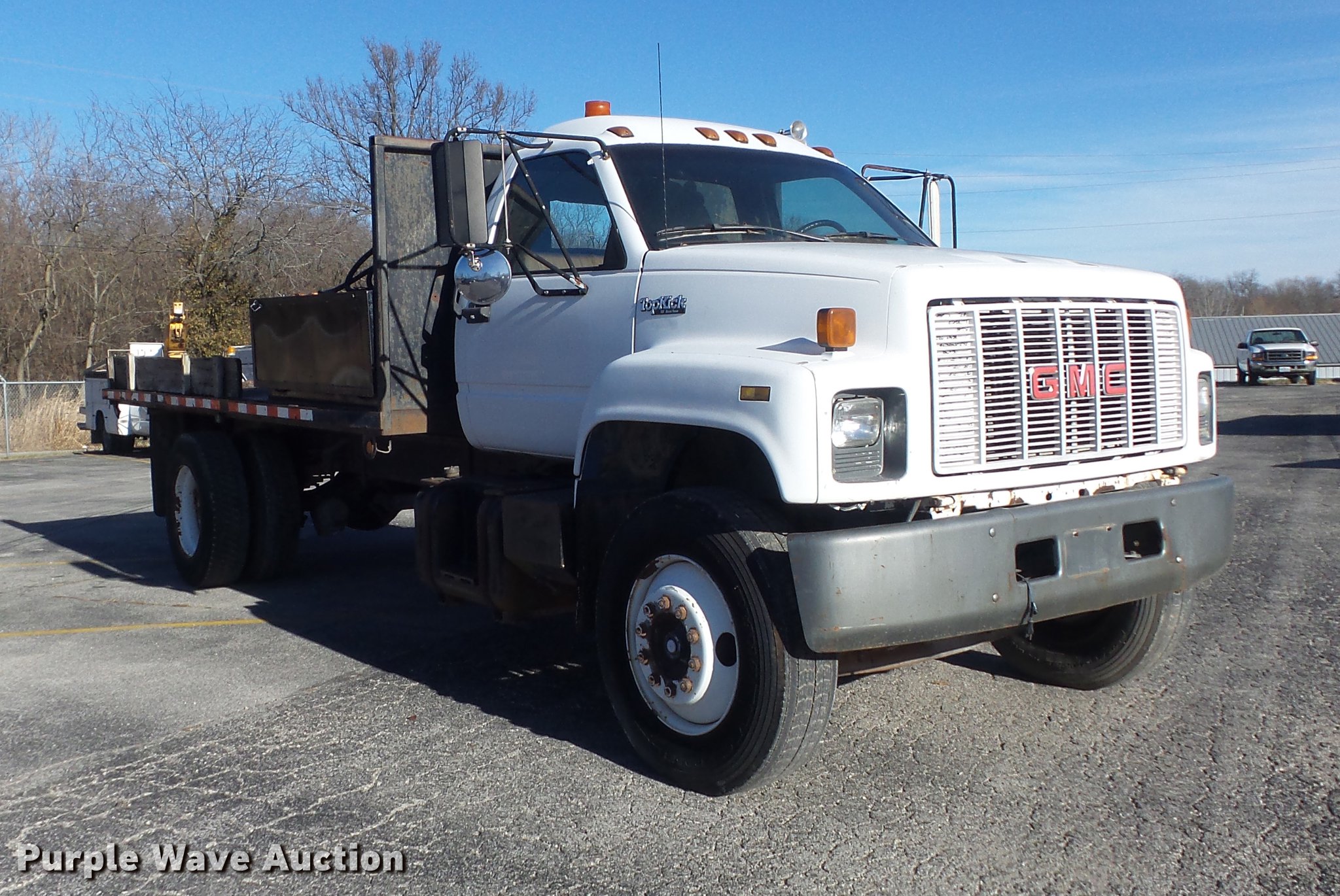 Purple Wave is selling a used Flat Bed Truck in Missouri. This item is a 1992 GMC TopKick flatbed truck with the following: 429,767 miles on odometer, Caterpillar 3116 6.6L six cylinder turbo diesel engine, 215 HP, Serial 7HJ04376, Six speed manual transmission, Single axle, AC, AM/FM/cassette, Air suspension seat, Brake controller, Beacon light, 15'L x 96"W flatbed, Steel floor, Stake pockets, Removable sides, Toolbox, Delta fuel tank, 50 gallon capacity, Hand pump,, Dual fuel tanks, Pintle hitch, Trailer wiring, Spring suspension, Air brakes, 198" wheelbase, 295/75R22.5 front tires, 275/80R22.5 rear tires, GVWR 30,000 lbs