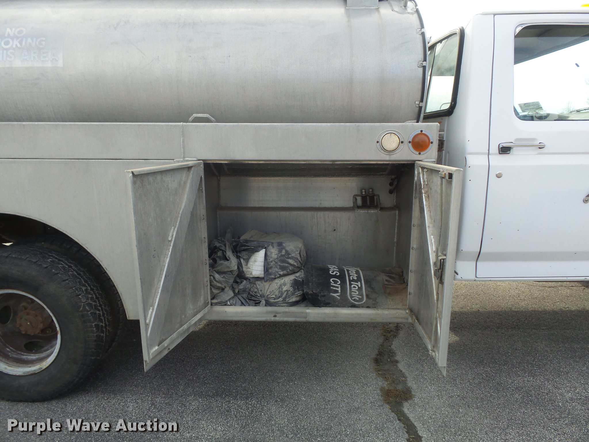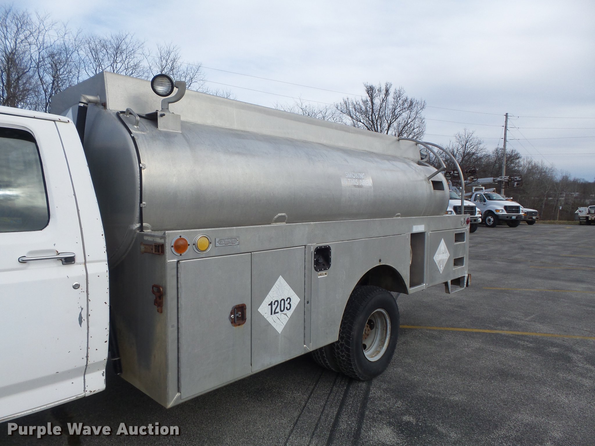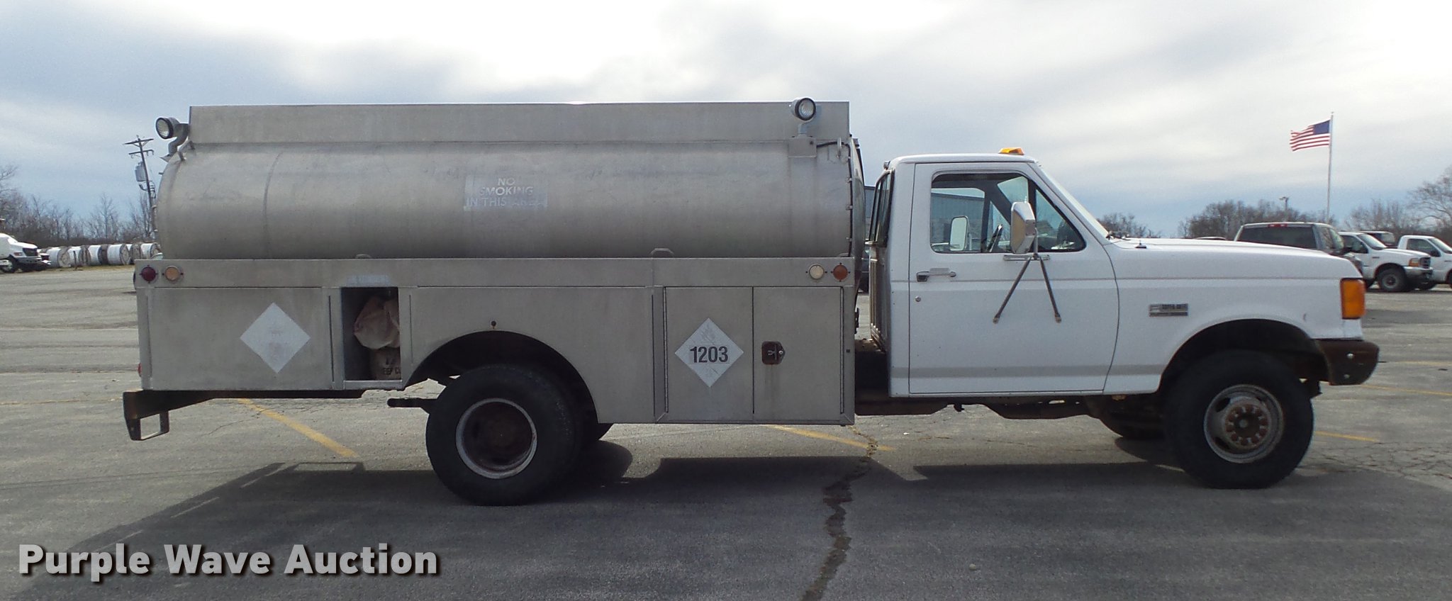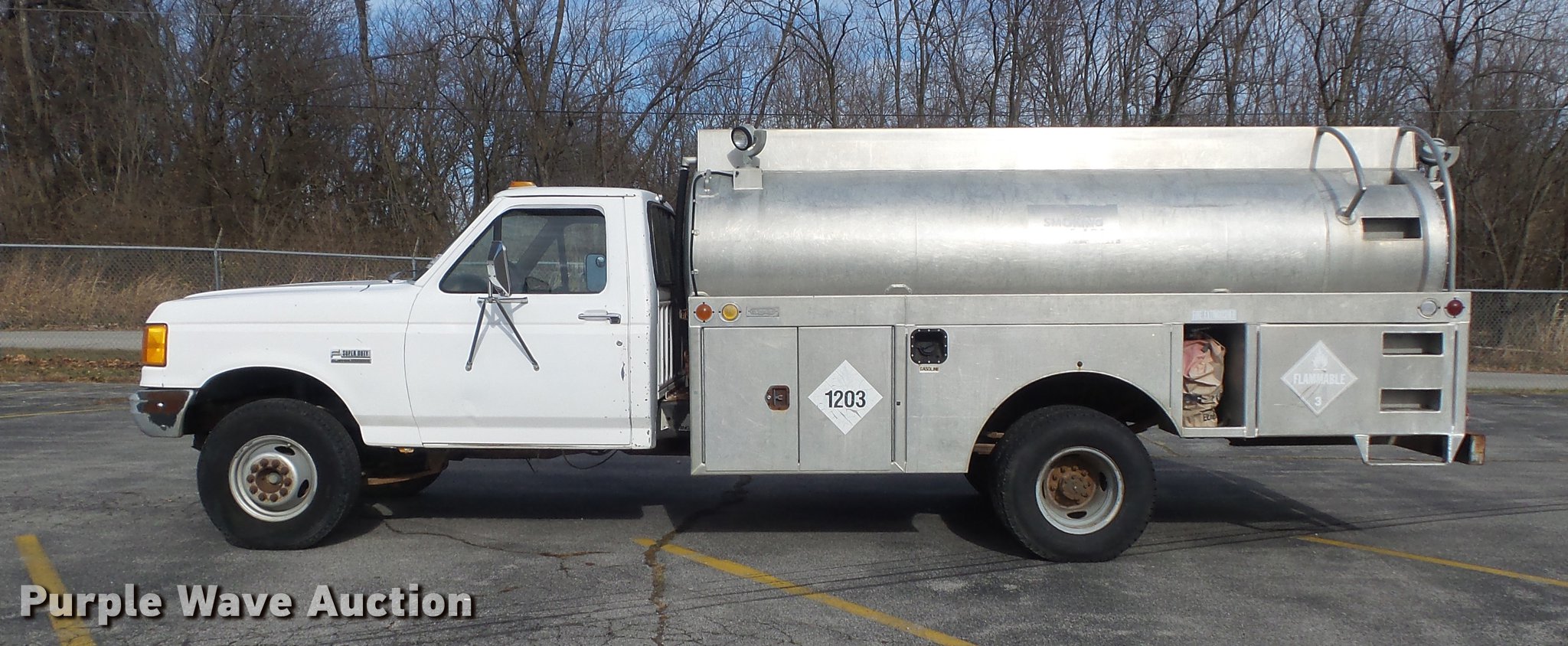Purple Wave is selling a used Fuel Truck in Missouri. This item is a 1991 Ford F450 Super Duty fuel truck with the following: 4,700 miles on odometer, 7.5L V8 gas engine, Five speed manual transmission, Single axle, Heat, PTO, Tri-State Tank Co. A-582 fuel bed, (2) compartments, 500 gallon capacity, 300 gallon capacity, (2) hose reels, 1.5" hose, (2) Tokheim metered pumps, Nozzles,, Single fuel tank, Spring suspension, Hydraulic brakes, 161" wheelbase, LT235/85R16 tires, GVWR 14,500 lbs