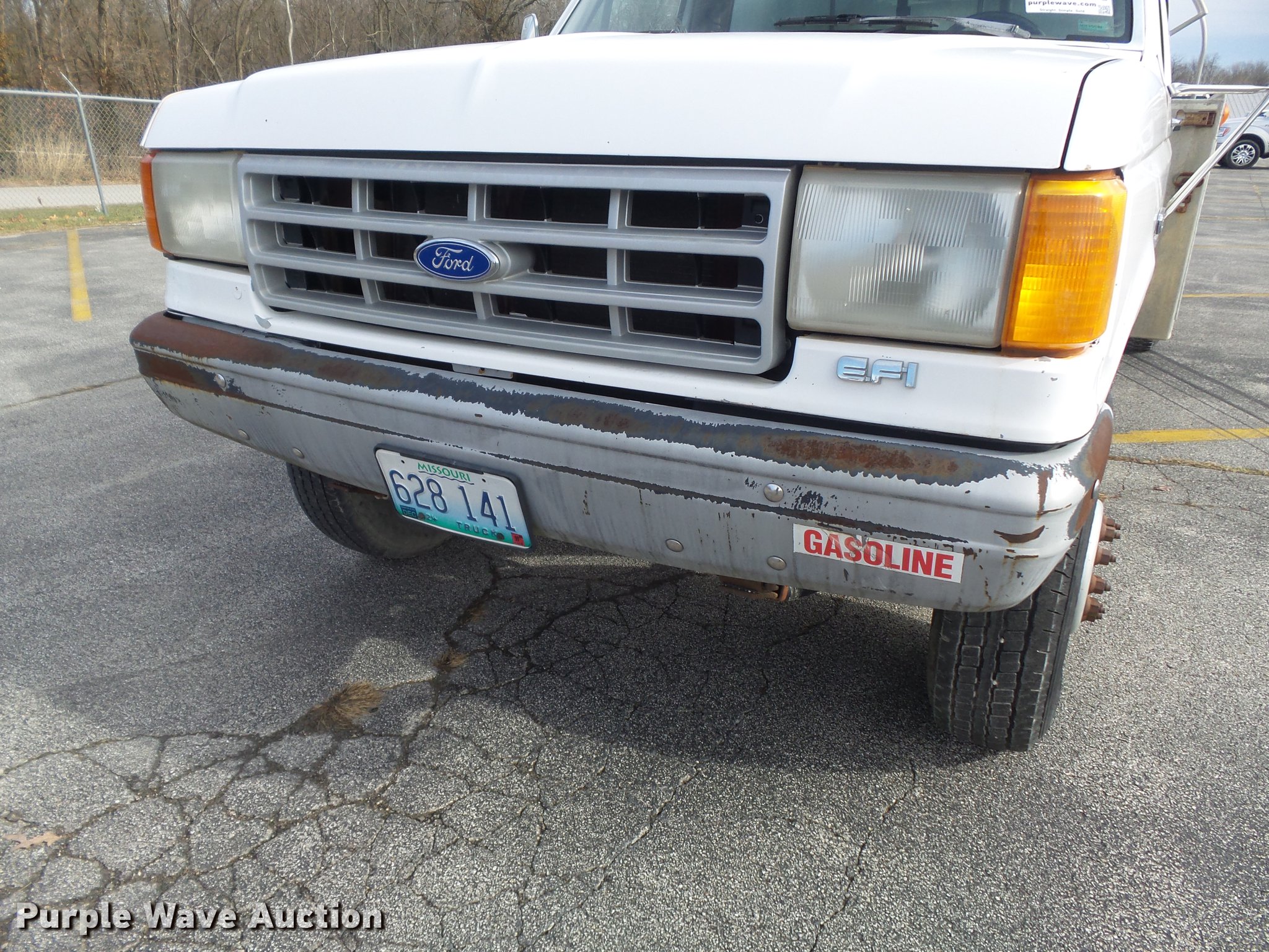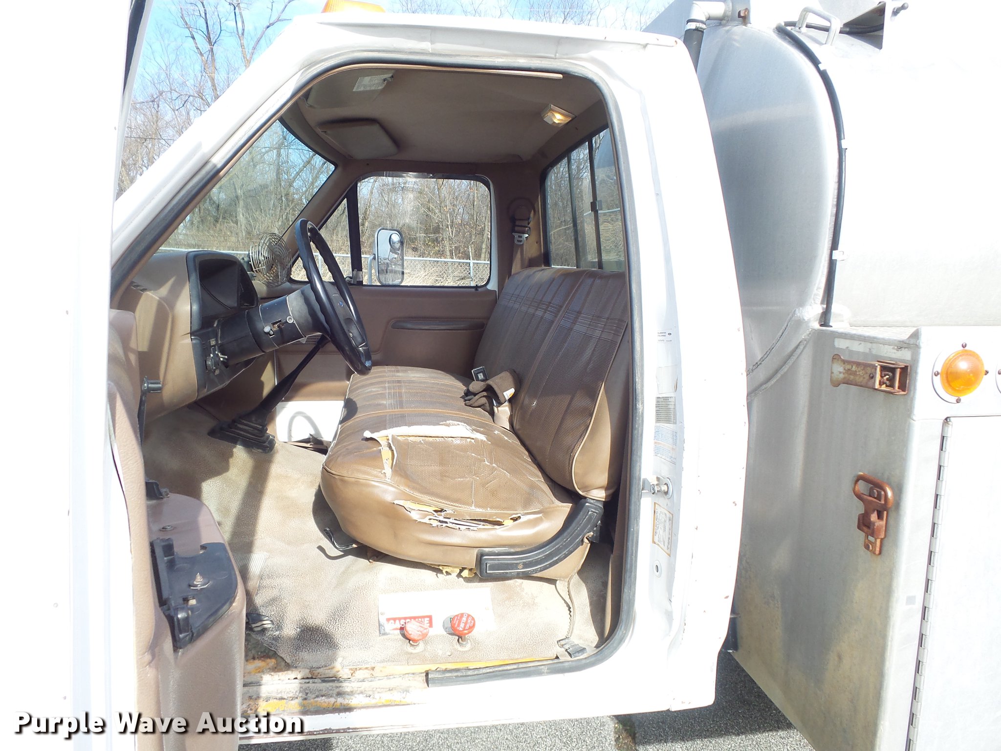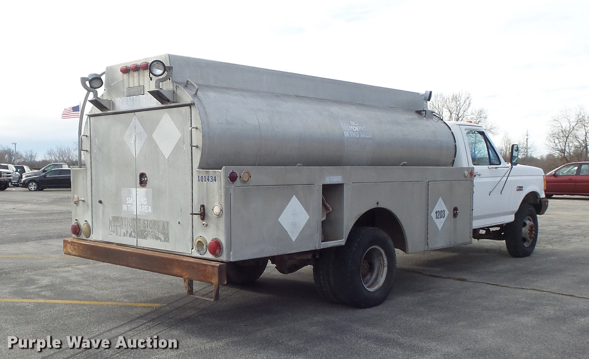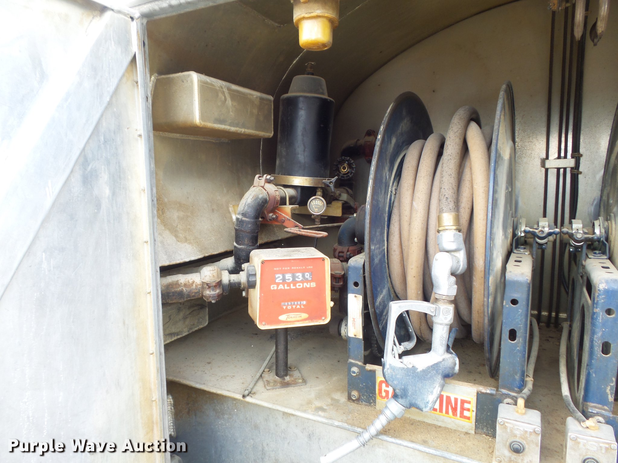 Purple Wave is selling a used Fuel Truck in Missouri. This item is a 1991 Ford F450 Super Duty fuel truck with the following: 4,700 miles on odometer, 7.5L V8 gas engine, Five speed manual transmission, Single axle, Heat, PTO, Tri-State Tank Co. A-582 fuel bed, (2) compartments, 500 gallon capacity, 300 gallon capacity, (2) hose reels, 1.5" hose, (2) Tokheim metered pumps, Nozzles,, Single fuel tank, Spring suspension, Hydraulic brakes, 161" wheelbase, LT235/85R16 tires, GVWR 14,500 lbs