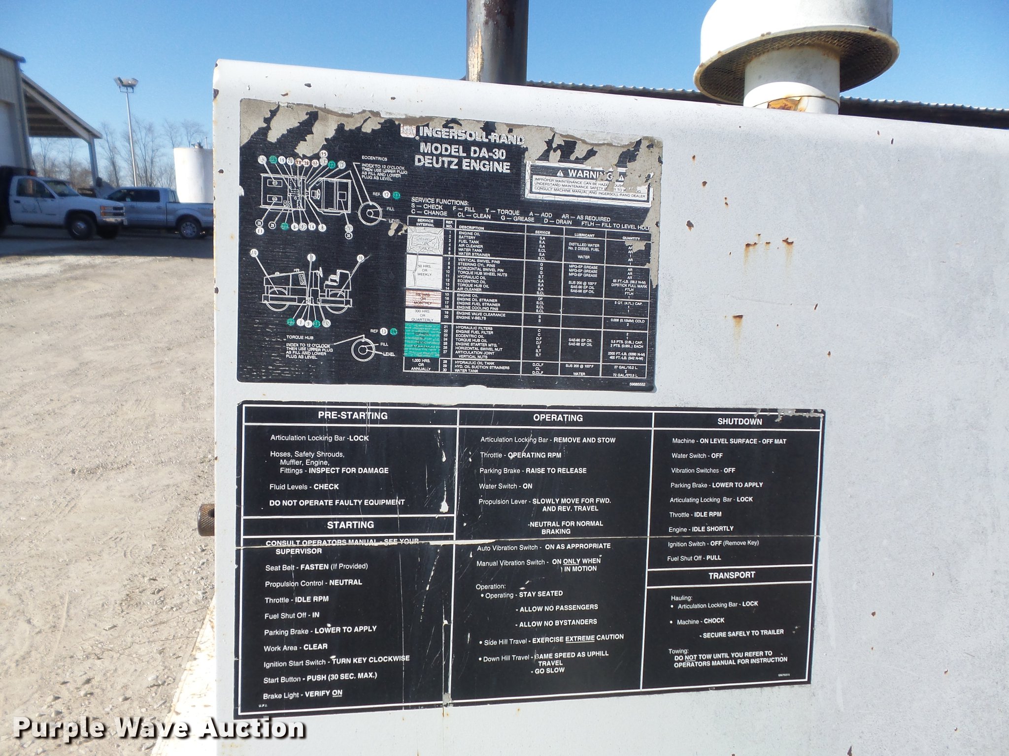 1979 Ingersoll Rand DA30 double drum vibratory roller. 653 hours on meter, Deutz F2L912 two cylinder diesel engine 32 HP, Hydrostatic transmission, Vandal cover, 40"W x 30" diameter smooth drums, Double vibratory system, Front and rear drum scrapers, Front and rear water application, Non-operational vibratory system, Non-operational tachometer/hour meter, Serial 5628. K.J. Unnerstall Construction. Washington, MO 63090