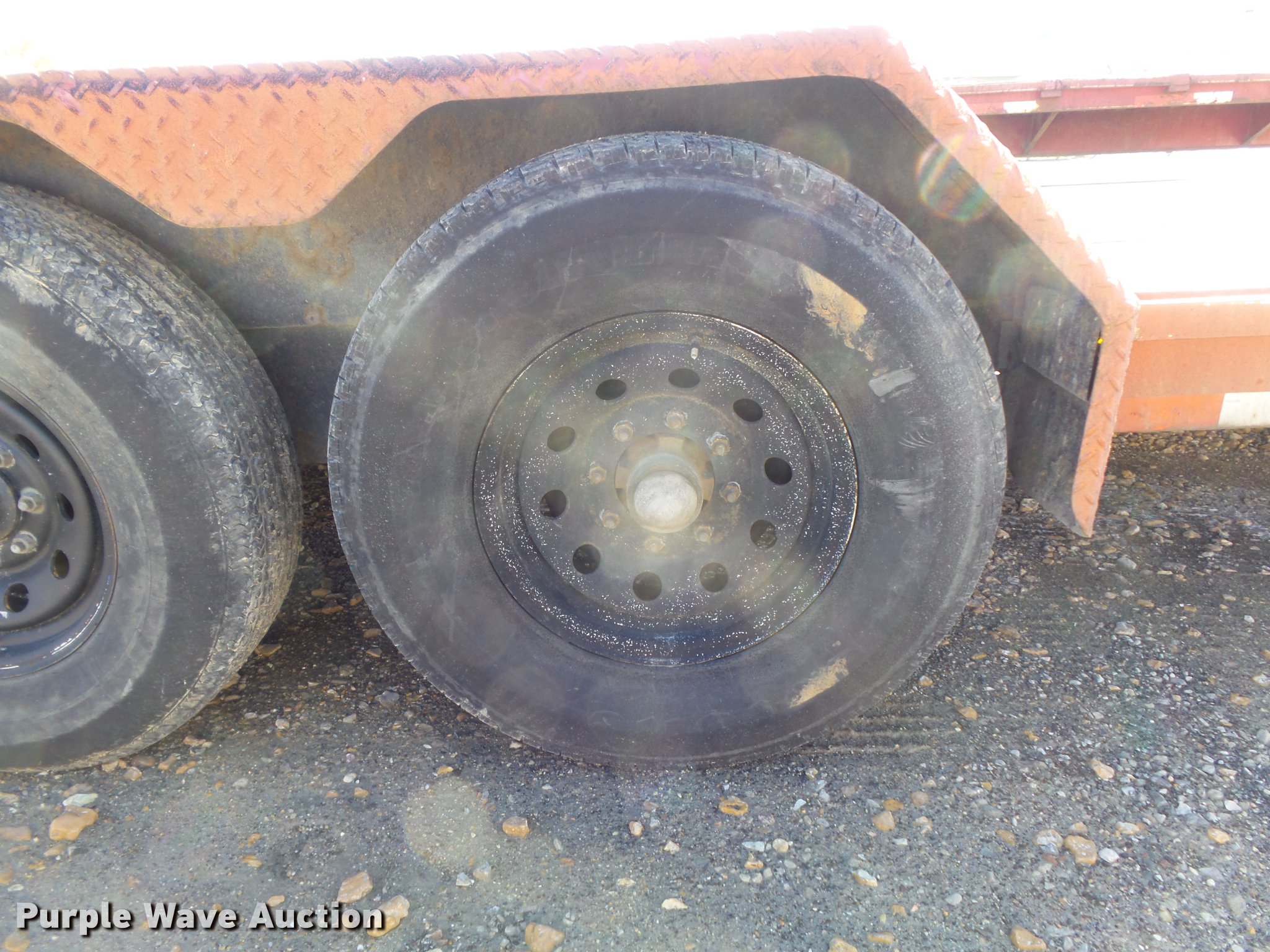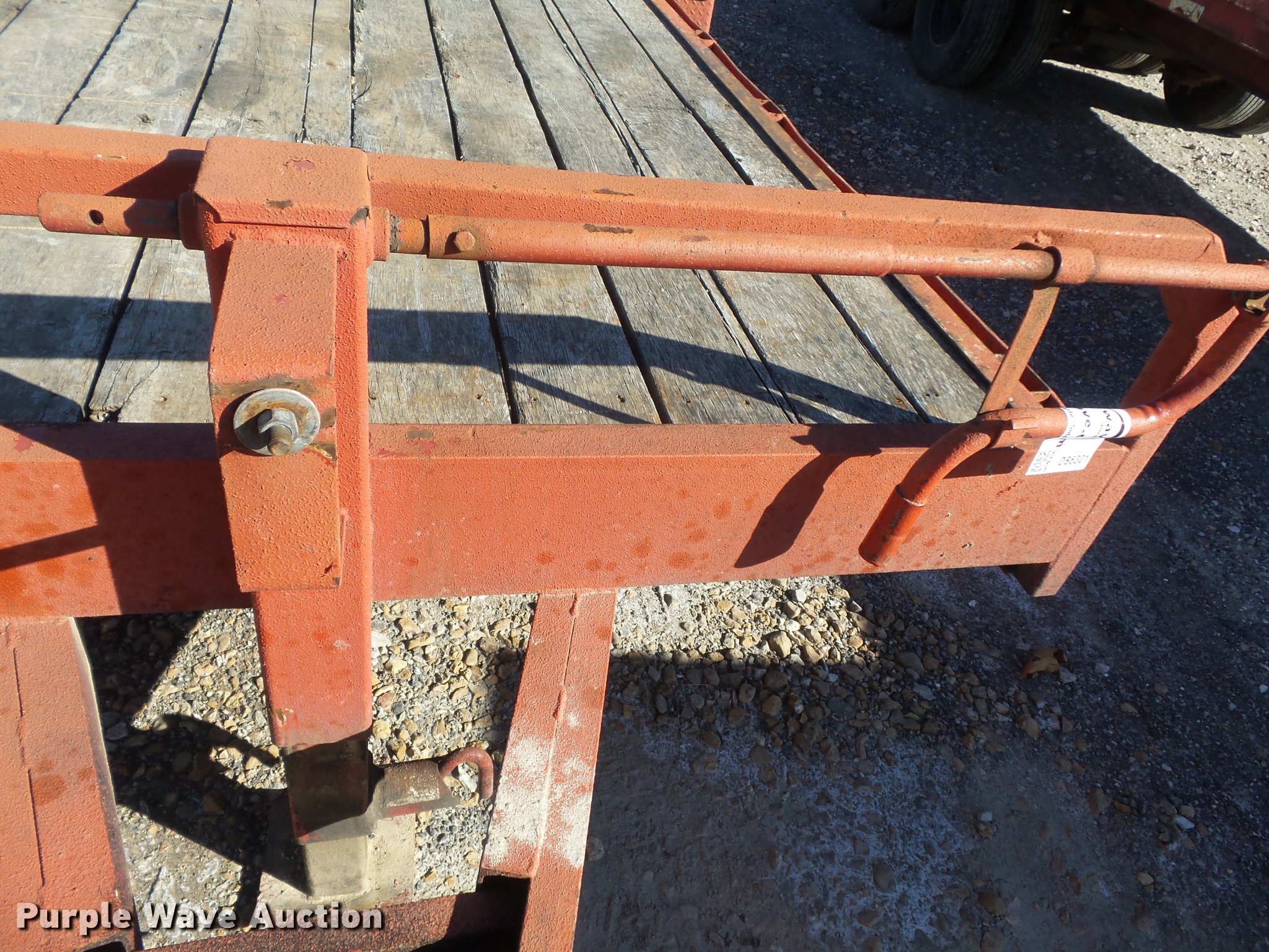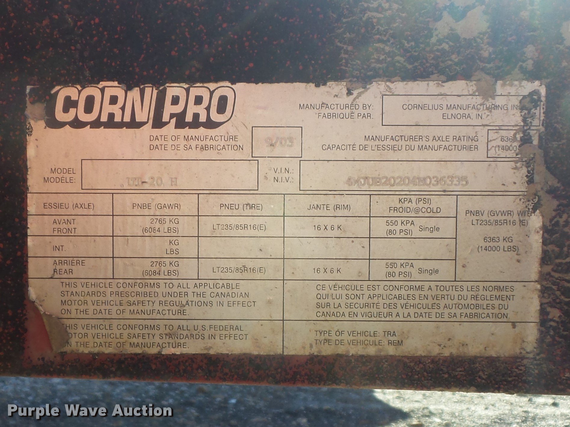 Purple Wave is selling a used Equip. Trailer in Missouri. This item is a 2004 Corn Pro UT-20H equipment trailer with the following: 18'L x 80"W wood deck, 22" floor height, 24"L beavertail, 54"L ramps, Stake side pockets, Single leg landing gear, 2 5/16" ball hitch, Torque flex suspension, Electric brakes, Steel wheels, ST235/80R16 tires, GVWR 14,000 lbs, GAWR 7,000 lbs
