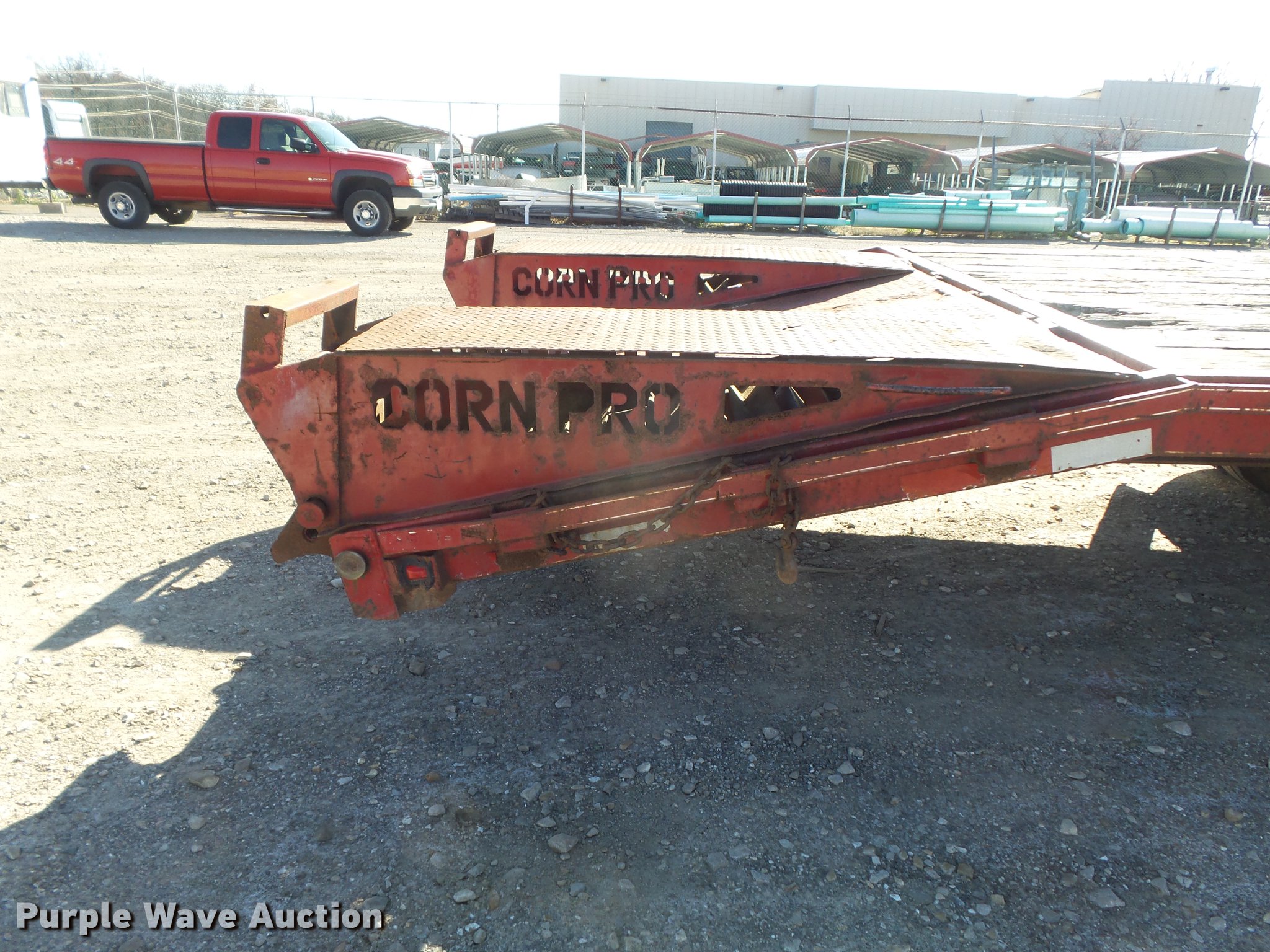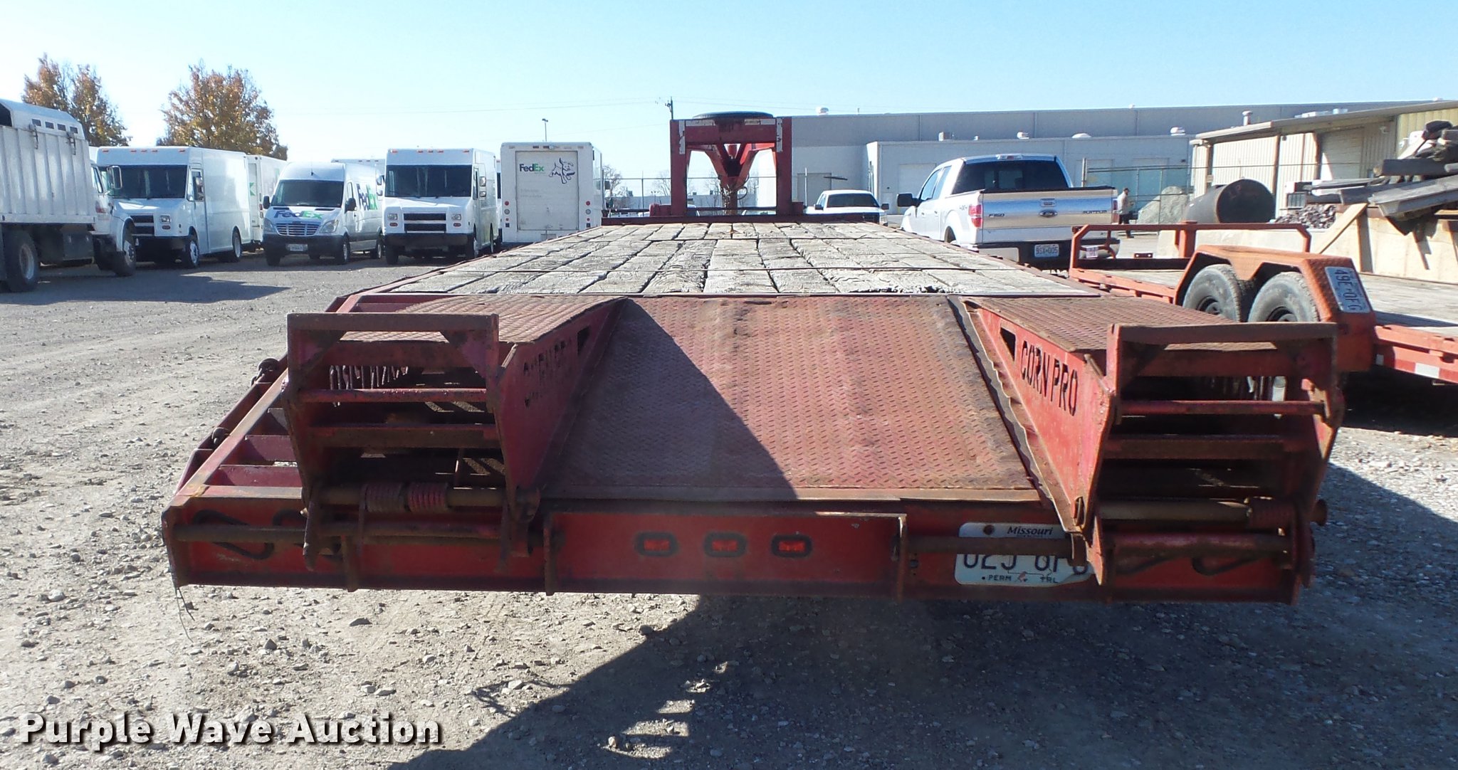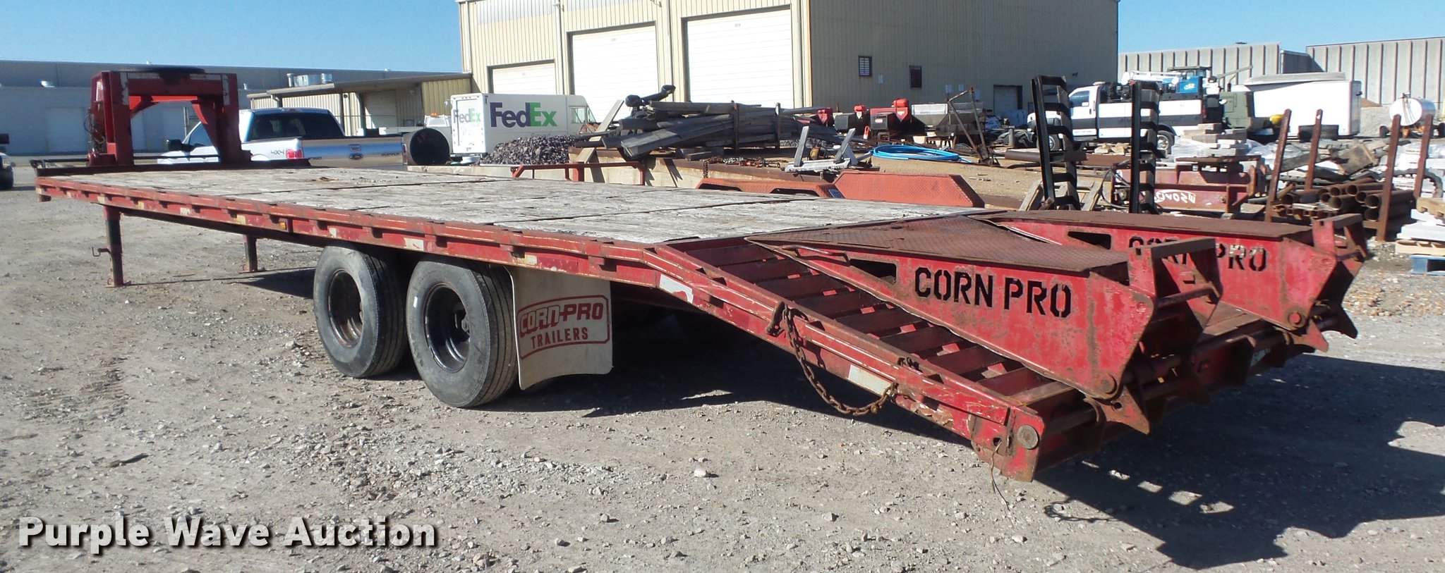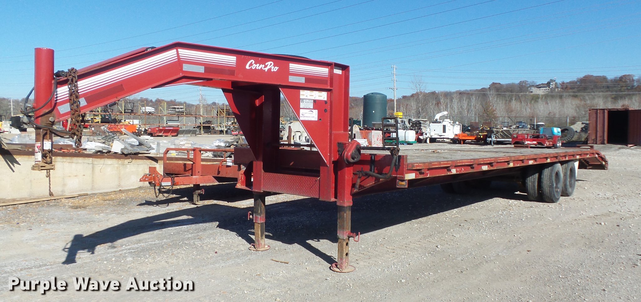Purple Wave is selling a used Equip. Trailer in Missouri. This item is a 2006 Corn Pro 28+512K equipment trailer with the following: 28'L x 102"W wood deck, 36" floor height, 5'L beavertail, 65"L ramps, Stake side pockets, Dual leg landing gear, 2 5/16" gooseneck hitch, Spring suspension, Electric brakes, Steel wheels, ST235/85R16 tires, GVWR 24,000 lbs, GAWR 12,000 lbs