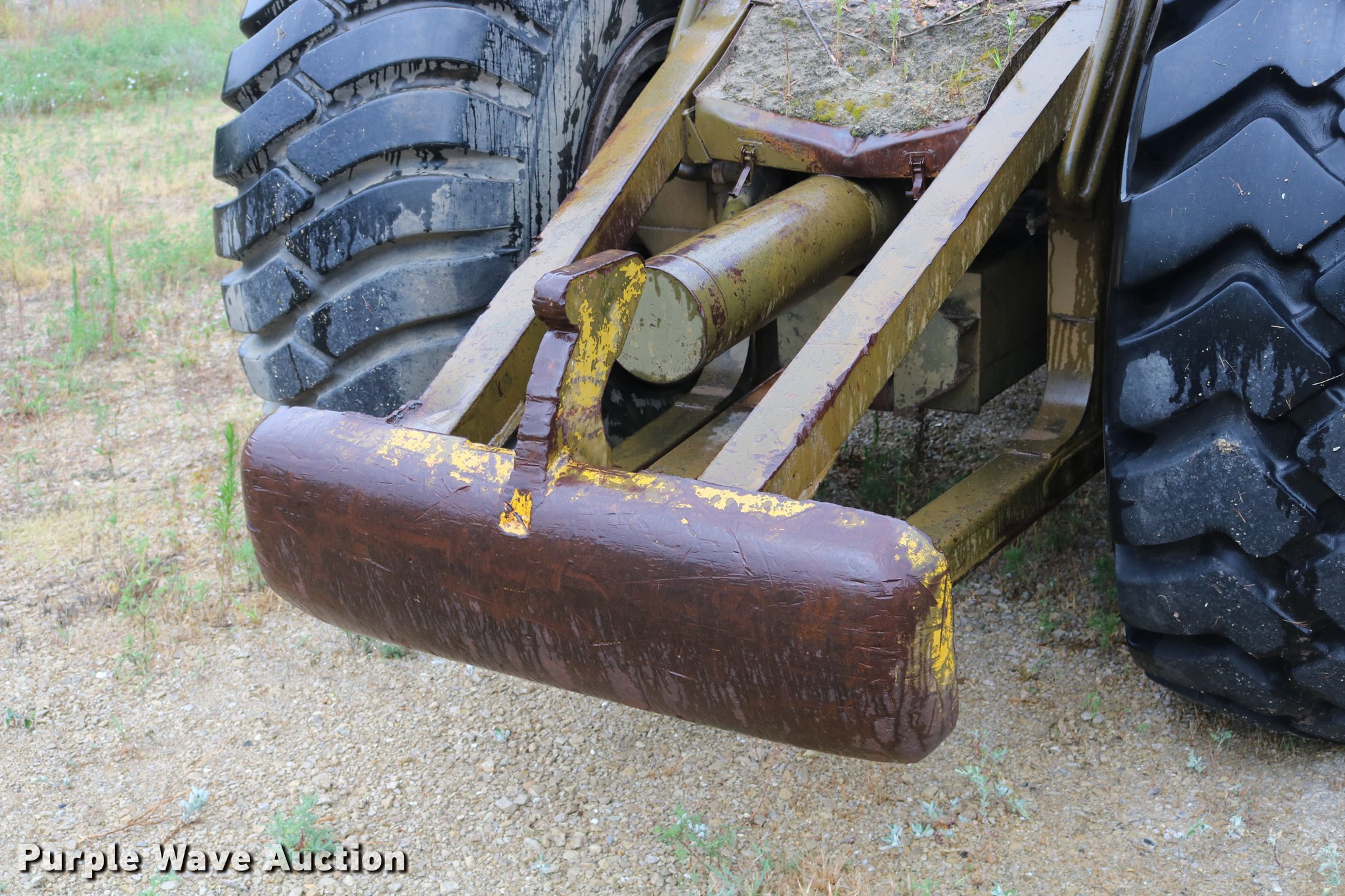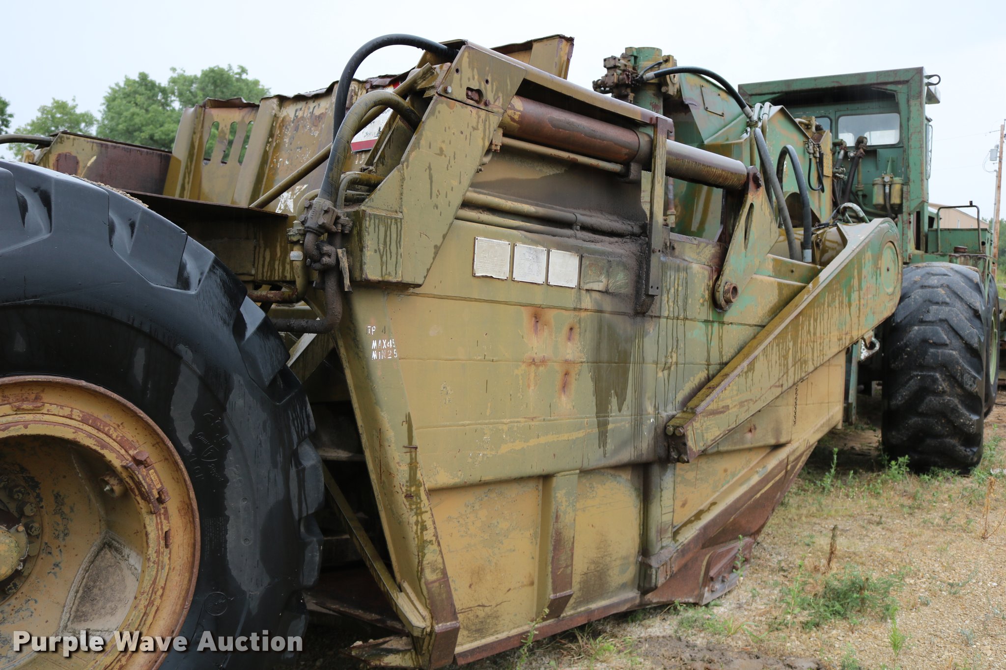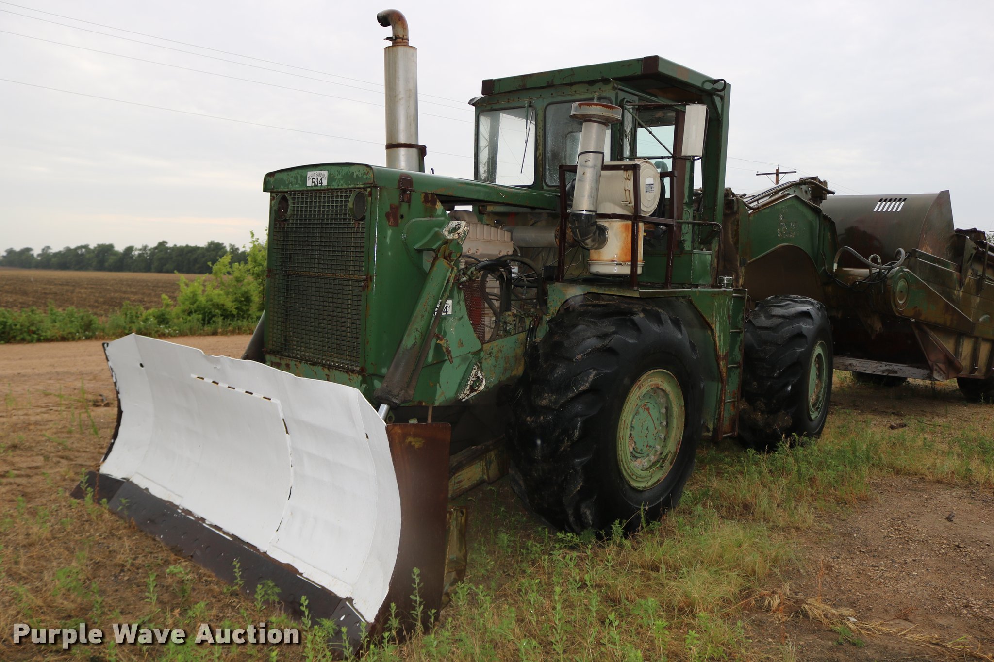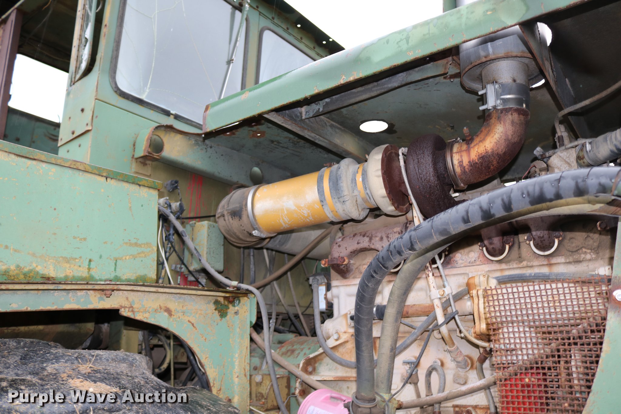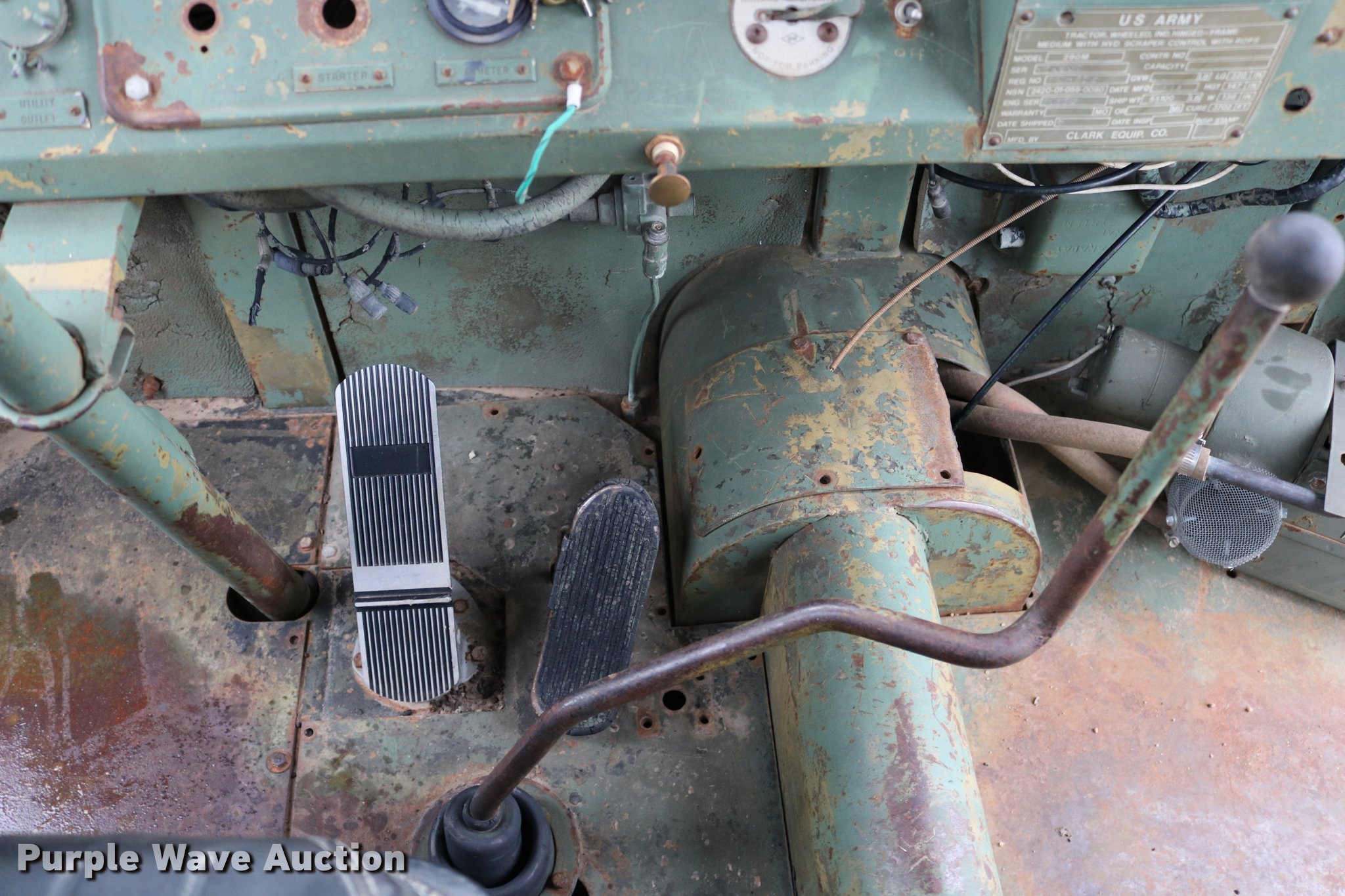 Purple Wave is selling a used Conventional Scraper in Kansas. This item is a Clark 290M conventional scraper with the following: 3,017 hours on meter, Hour meter replaced, Approximately 2,005 hours on replaced meter, Cummins 360 six cylinder turbo diesel engine, Manual transmission, 4F-2R gears, Four wheel drive, Enclosed cab, Heat, Suspension seat, Wipers, Backup alarm, Model CT4 bowl, 9' bowl width, 18 cu.yd. bowl capacity, Hydraulic lift, Serial S-64588-CT4, Three lever controls, 136"W blade, Bolt-on cutting edge, Rear push block, Air brakes, 29.5-29 tires, Serial 61373