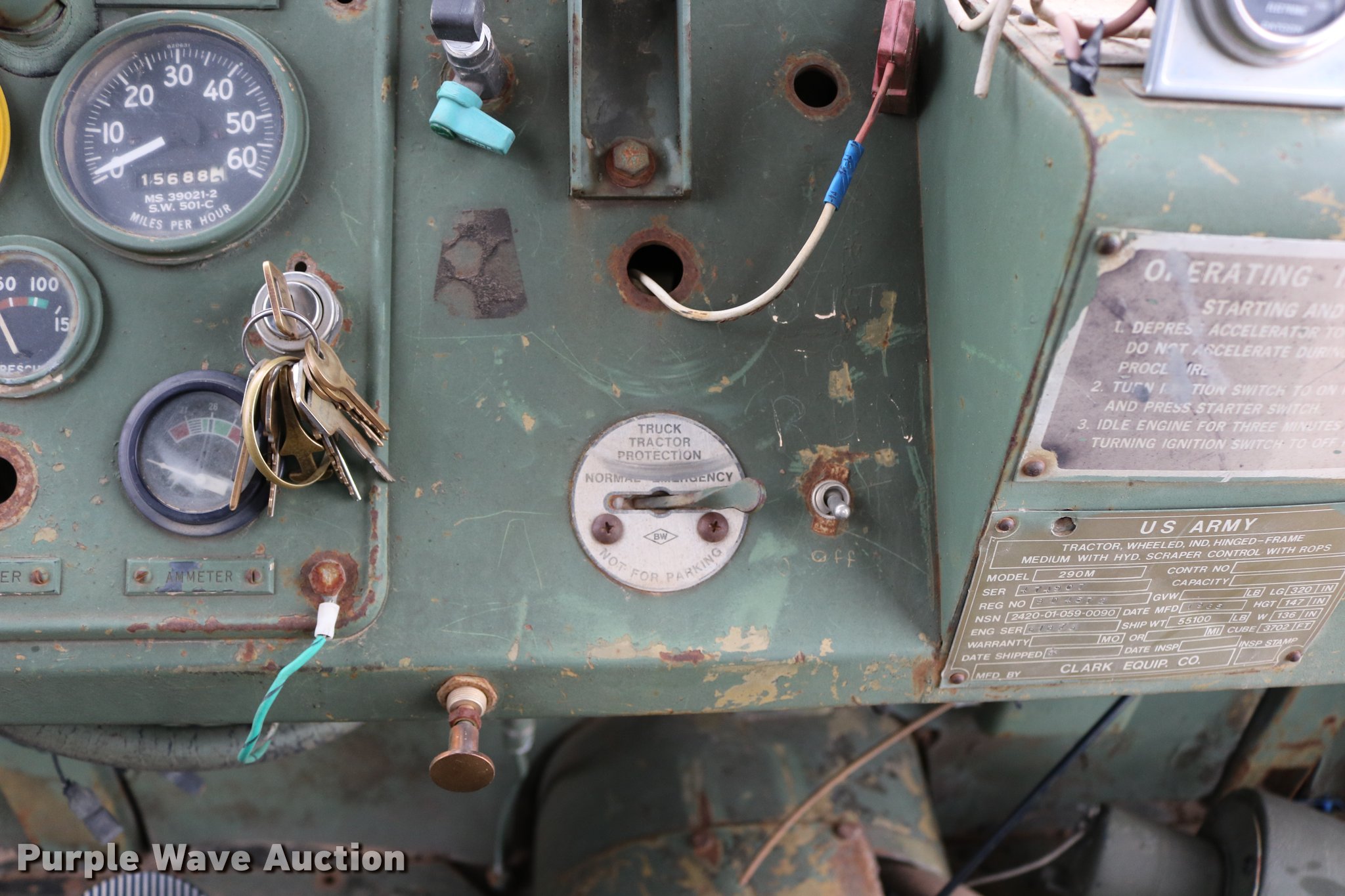 Clark 290M conventional scraper. 3,017 hours on meter, Hour meter replaced Approximately 2,005 hours on replaced meter, Cummins 360 six cylinder turbo diesel engine, Manual transmission 4F-2R gears, Four wheel drive, Enclosed cab, Heat, Suspension seat, Wipers, Backup alarm, Model CT4 bowl 9' bowl width, 18 cu.yd. bowl capacity, Hydraulic lift, Serial S-64588-CT4, Three lever controls, 136"W blade Bolt-on cutting edge, Rear push block, Air brakes, 29.5-29 tires, Serial 61373. Salina, KS 67401