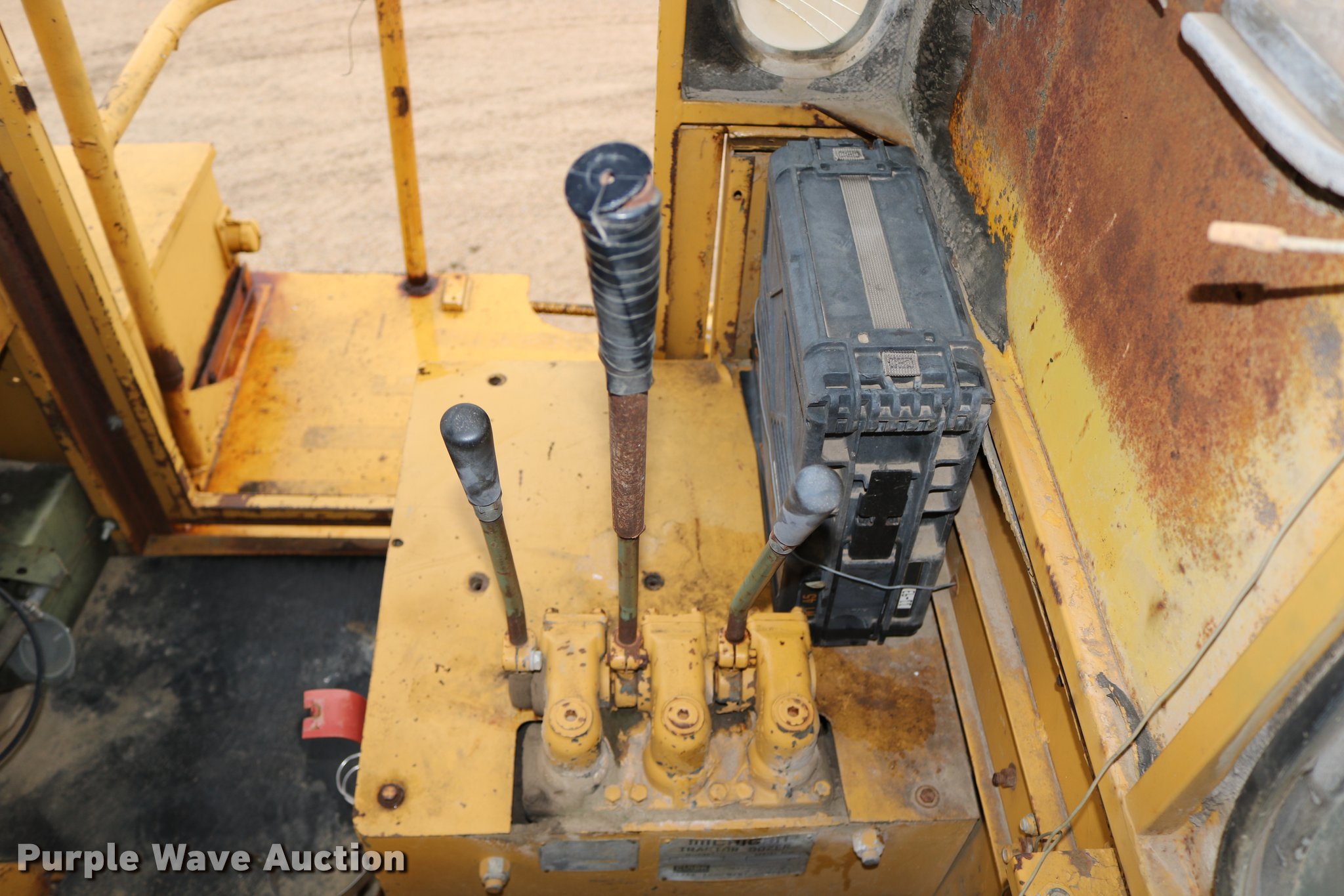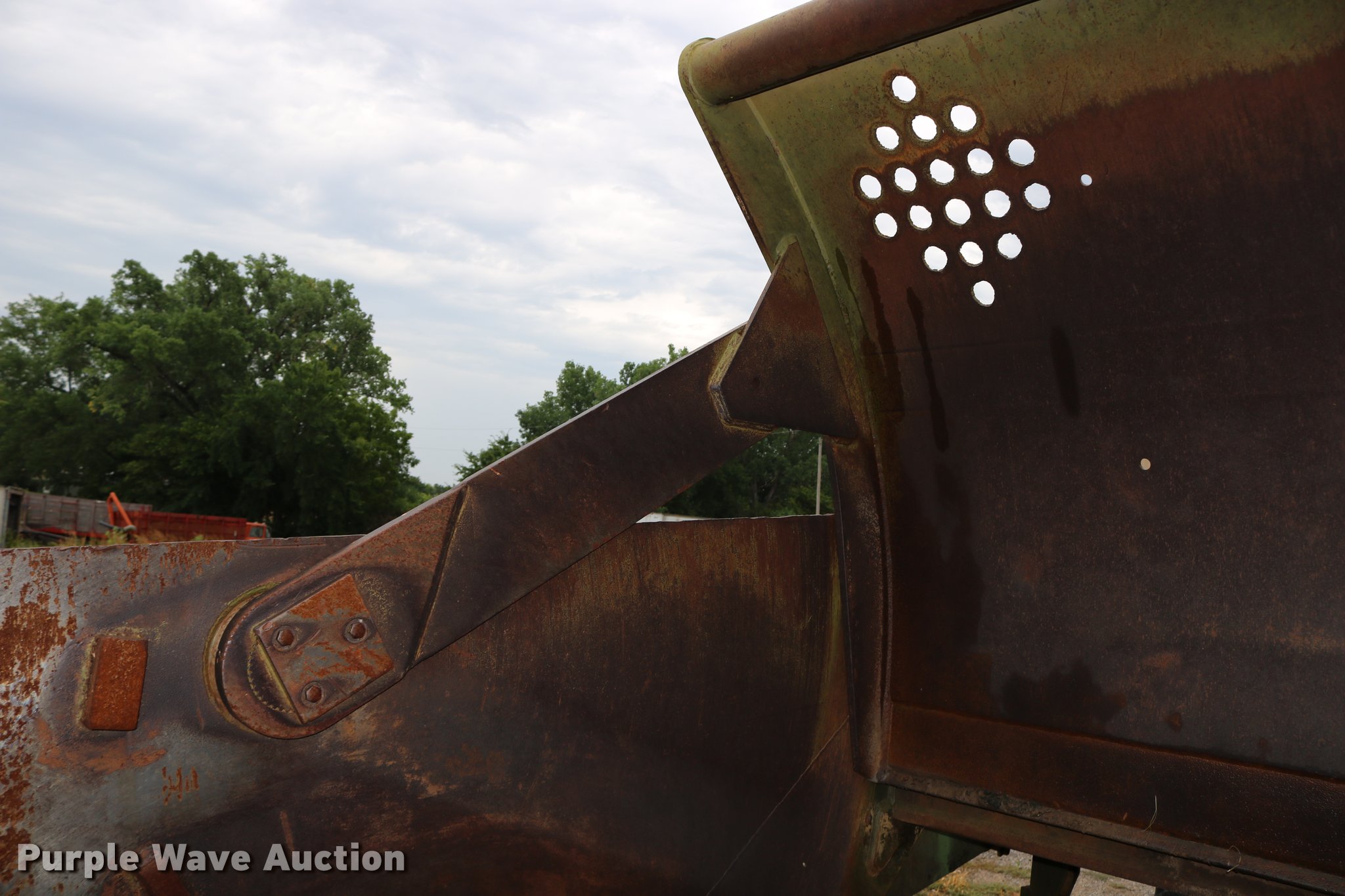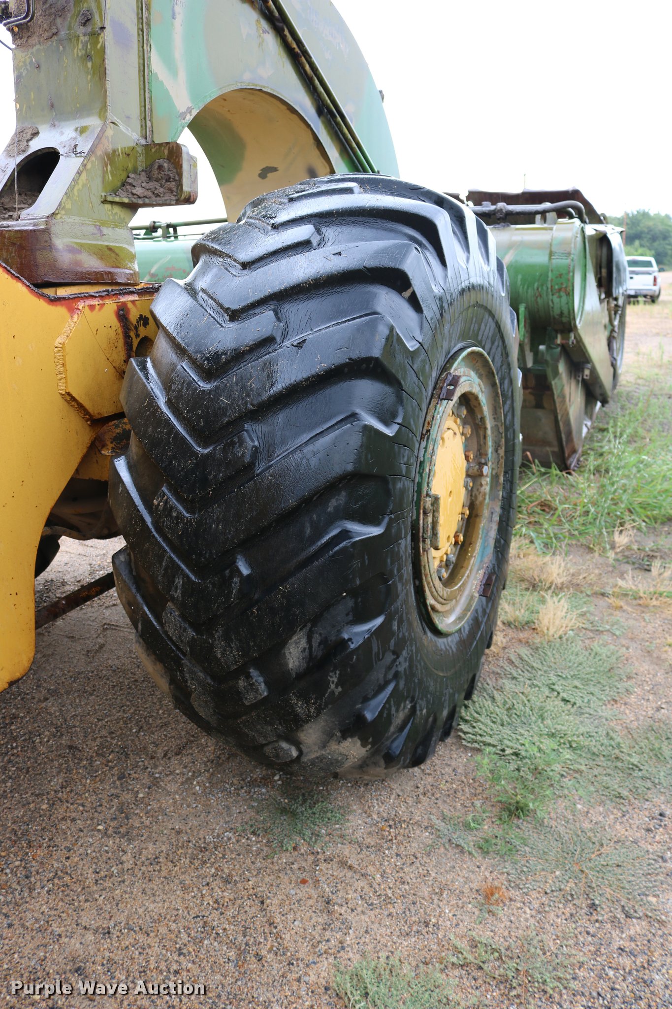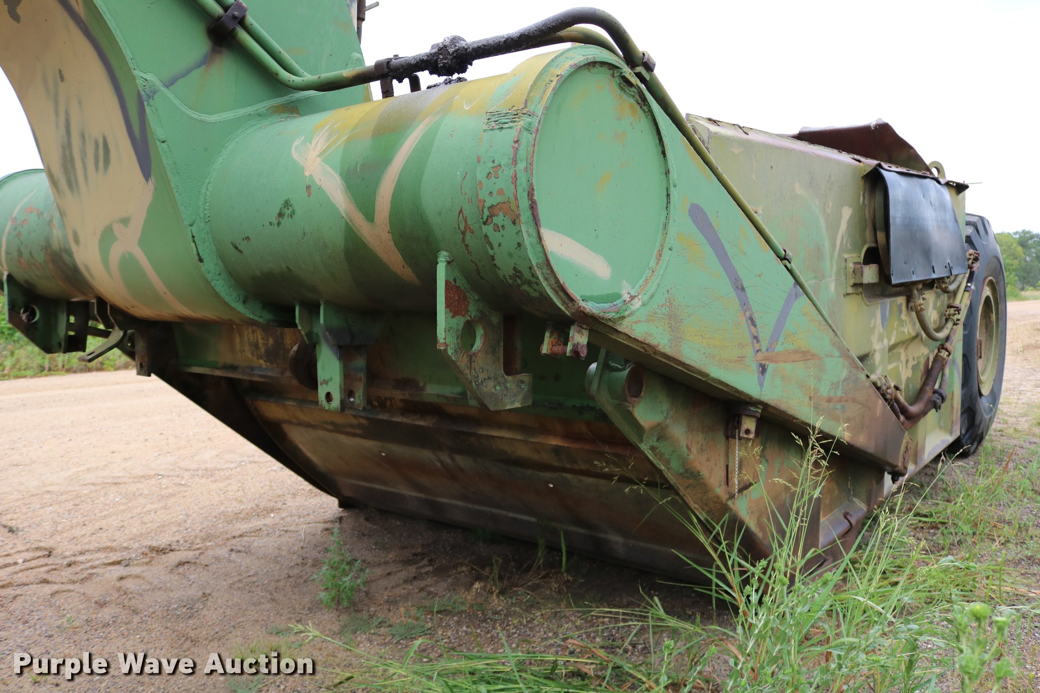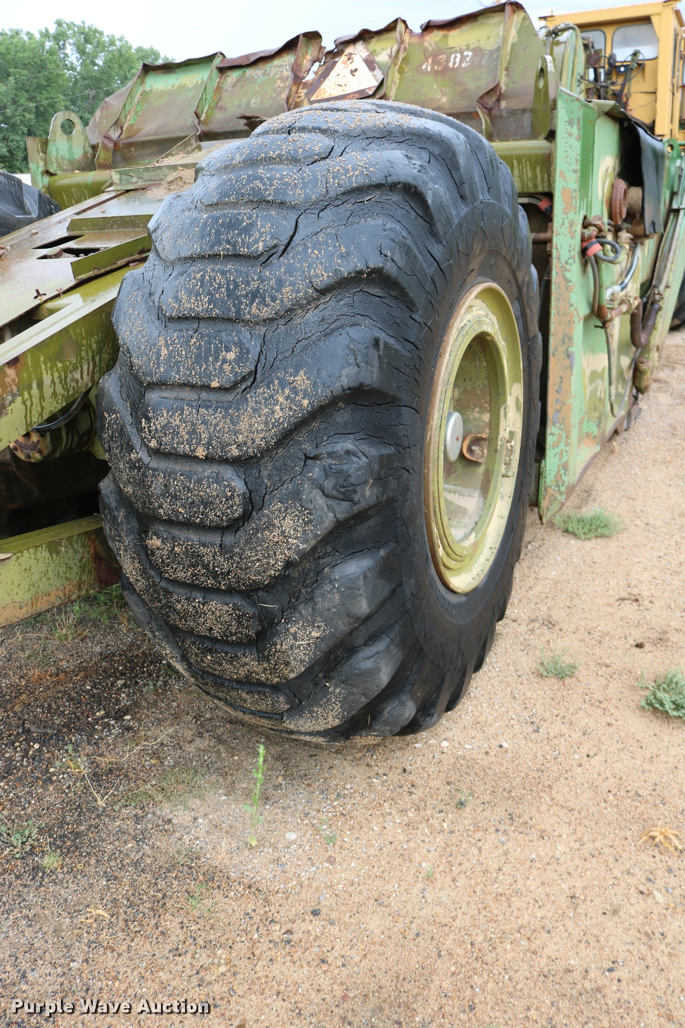 Purple Wave is selling a used Conventional Scraper in Kansas. This item is a Clark 290M conventional scraper with the following: 21,825 miles on odometer, Hour meter replaced, 2,701 hours on meter, 1,452 hours on replaced meter, Cummins 400 six cylinder turbo diesel engine, Manual transmission, 4F-2R gears, Four wheel drive, Enclosed cab, Heat, Suspension seat, Wipers, Backup alarm, 9' bowl width, 18 cu.yd. capacity, Hydraulic lift, Three lever controls, 134" blade, Bolt-on cutting edge, 29.5-29 tires, Windows cracked, Bolt on cutting edges missing, Serial 60523
