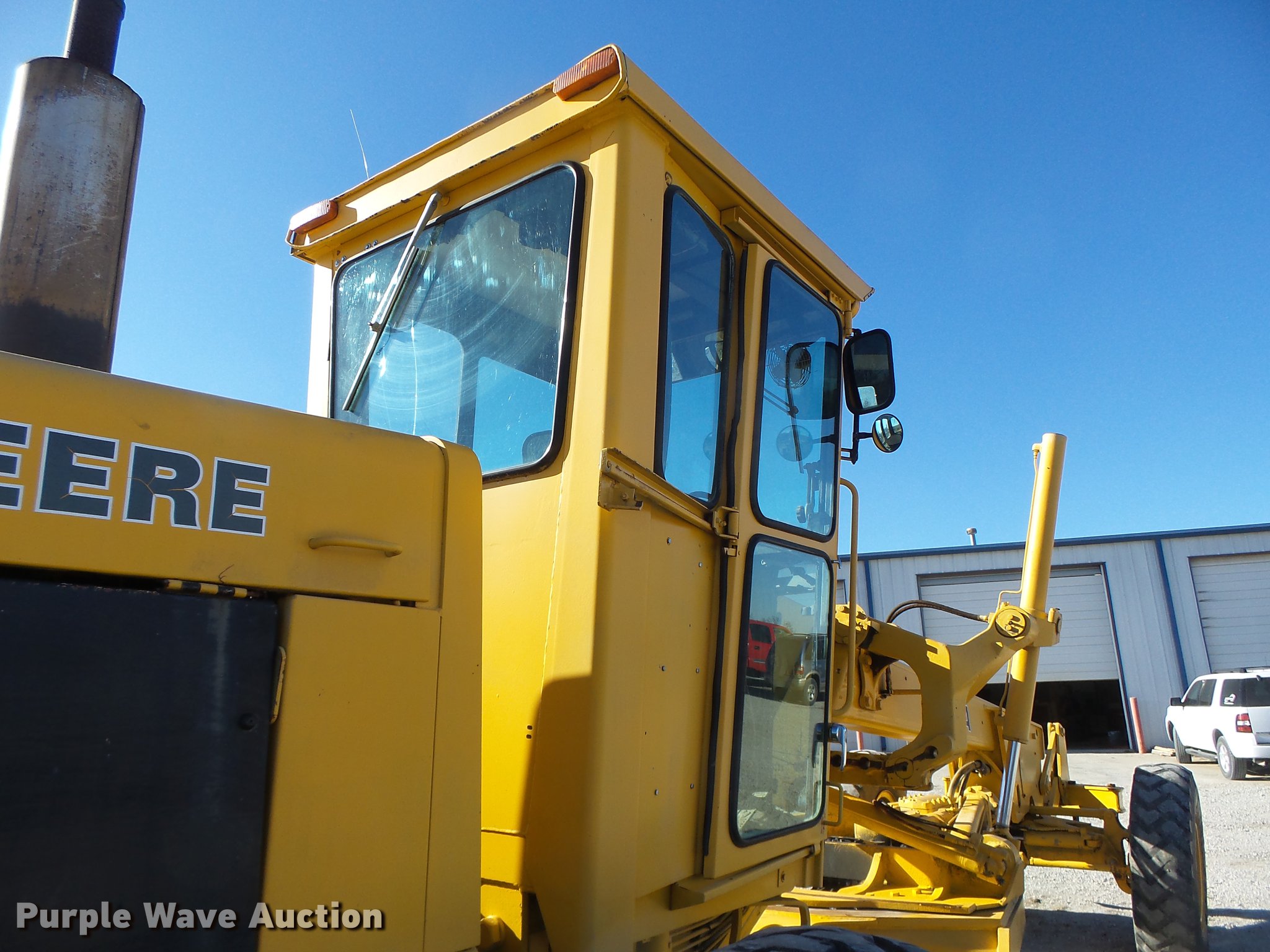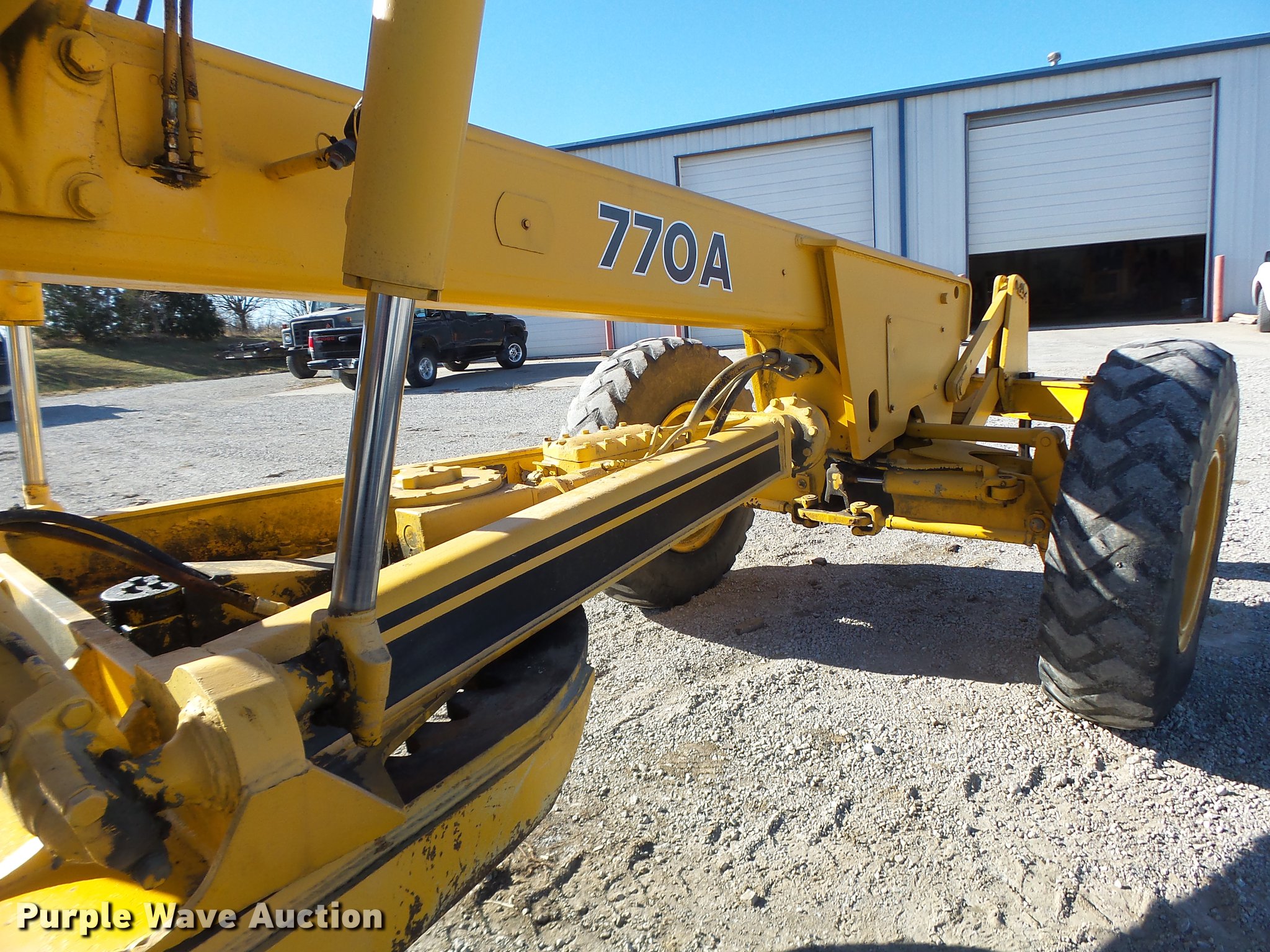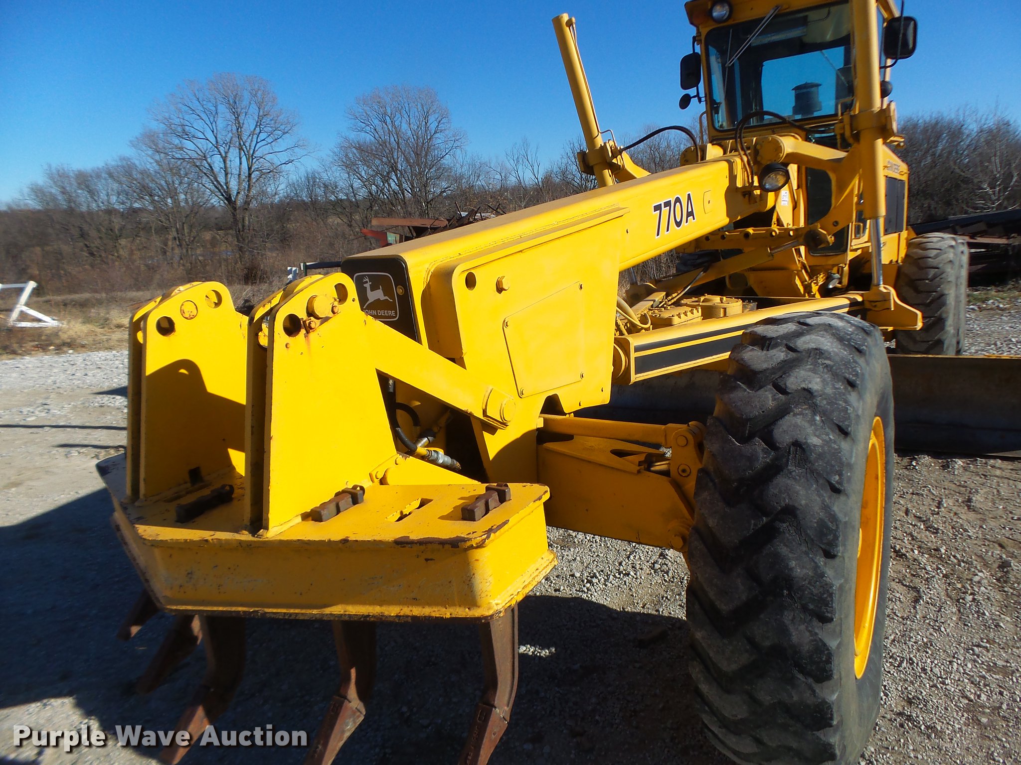 Purple Wave is selling a used Motor Grader in Missouri. This item is a 1981 John Deere 770A motor grader with the following: 6,196 hours on meter, John Deere six cylinder diesel engine, 8F-4R gears, Heat, Suspension seat, Front work lights, 14'W moldboard, Tip control, Side shift, Front mounted lift group, Front mounted scarifier, (5) teeth, 14.00-24 tires, Serial 402691D