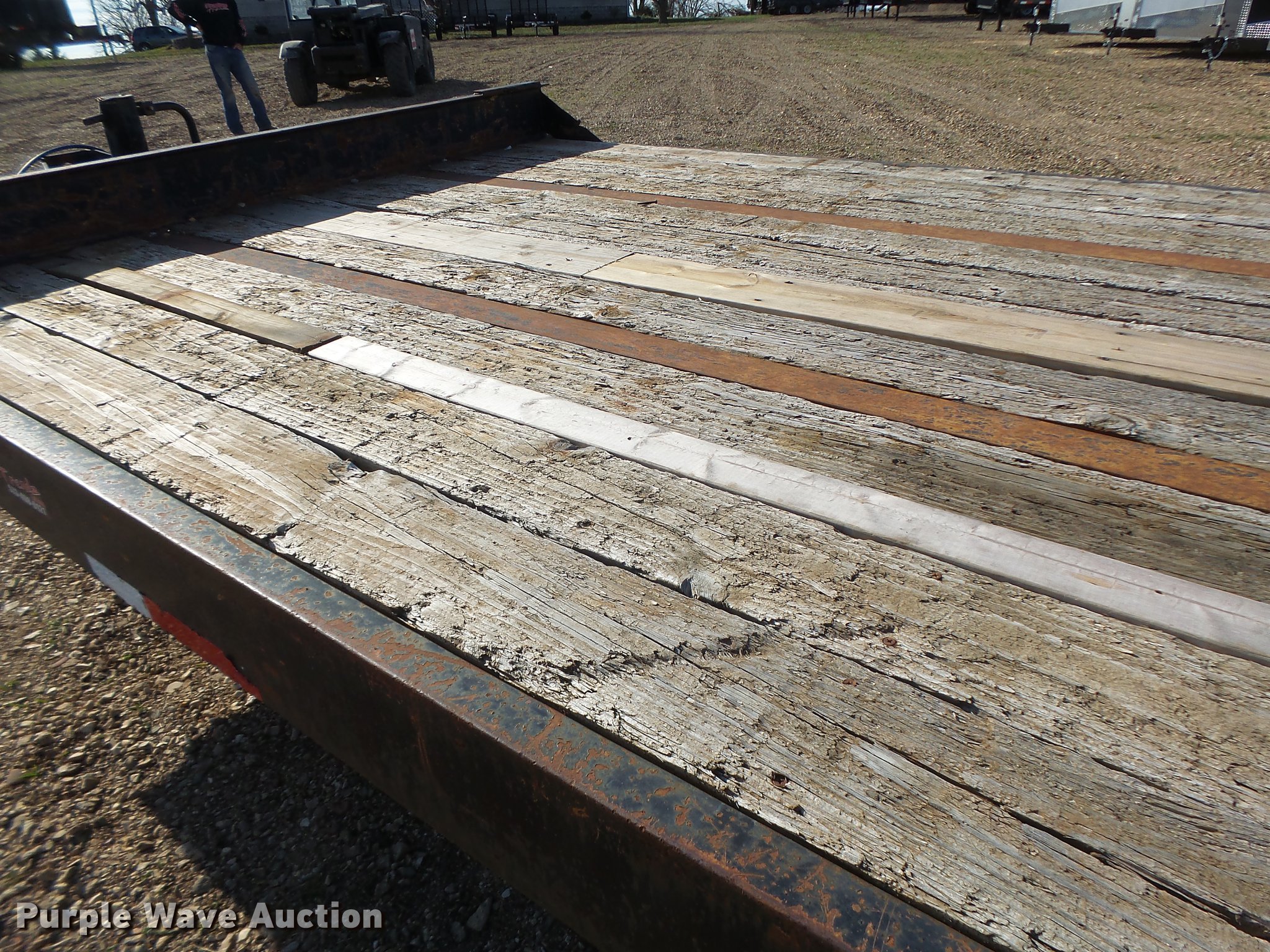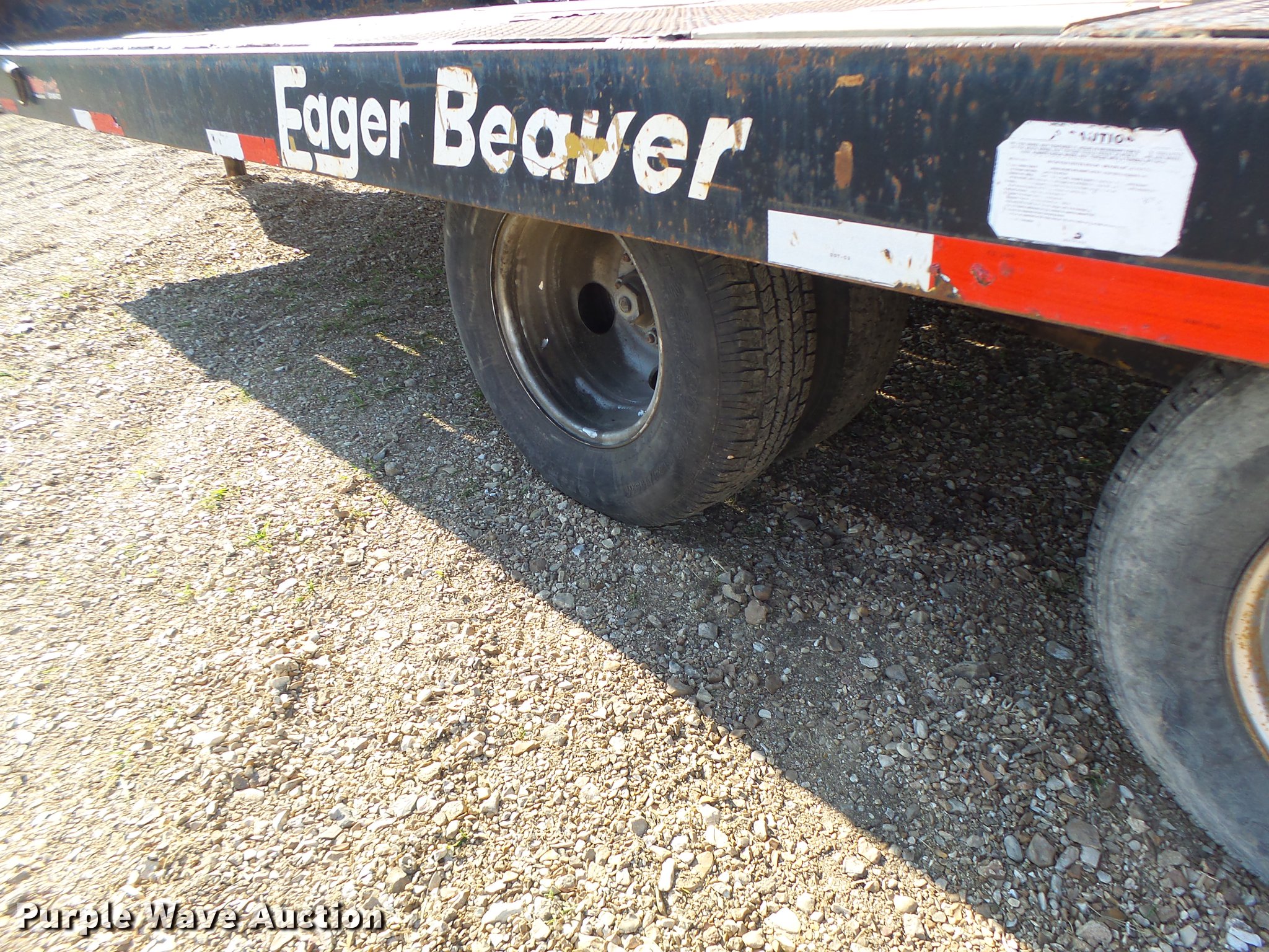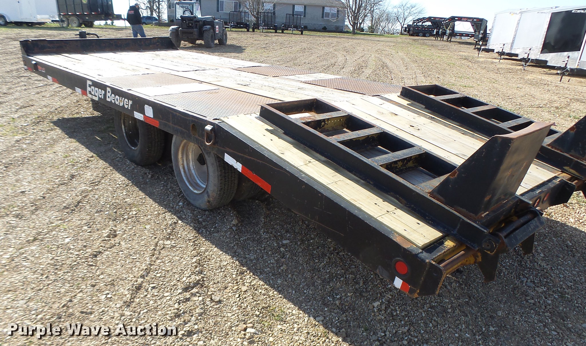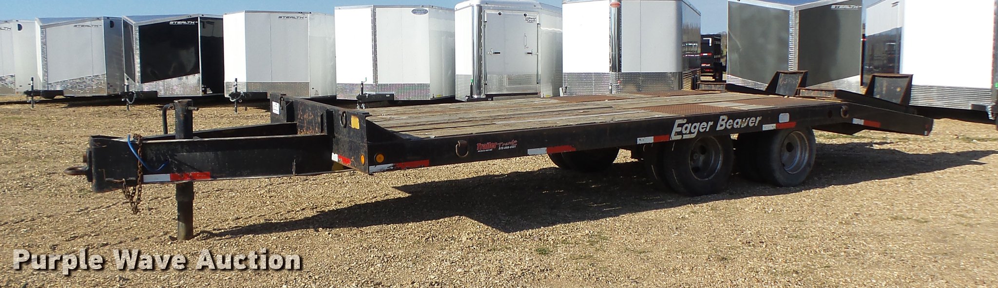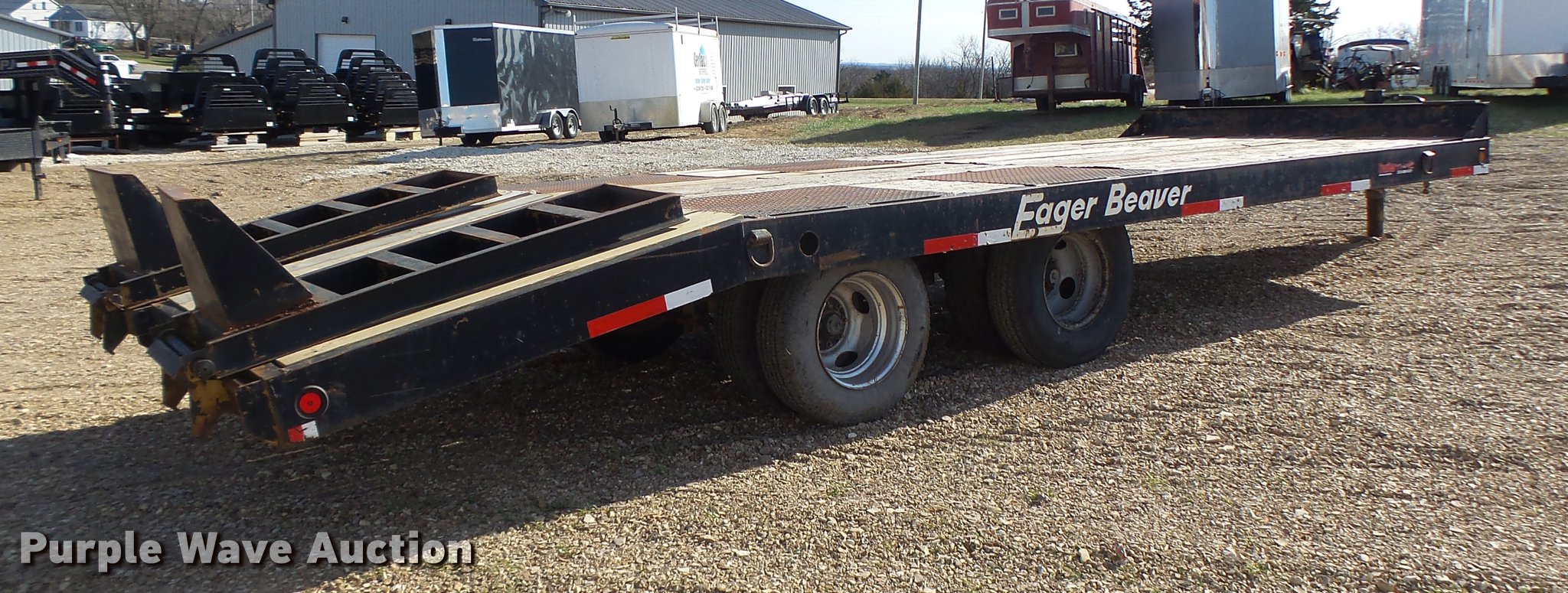 Purple Wave is selling a used Equip. Trailer in Missouri. This item is a 1988 Eager Beaver equipment trailer with the following: 22' overall length, 17'L x 8'W wood main deck, 5'L rear deck, 5'L dovetail, 5'L ramps, D-ring tie downs, Single leg landing gear, Pintle hitch, Tandem axle, Spring suspension, Electric brakes, Steel wheels, 235/80R16 tires, GVWR 24,000 lbs