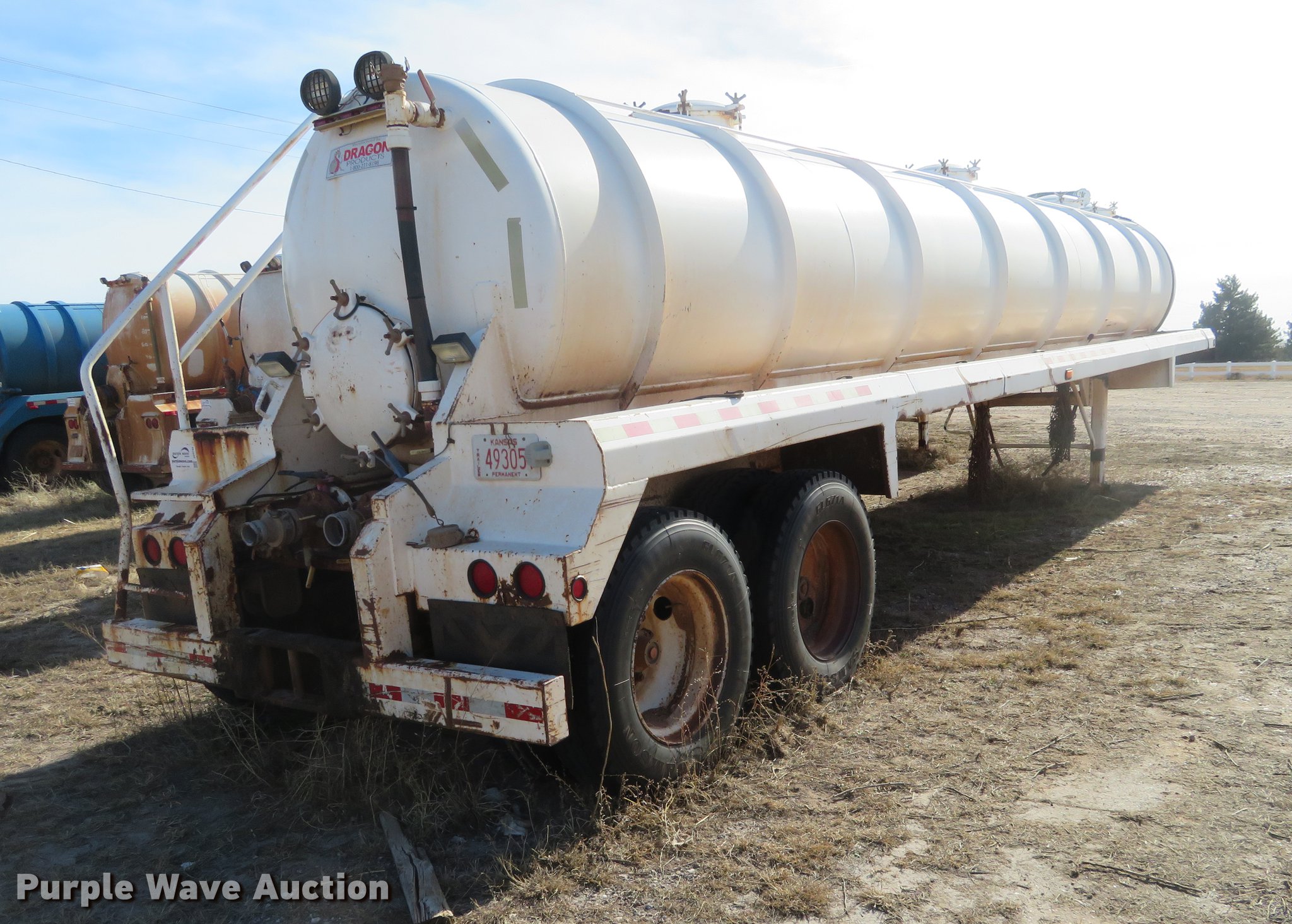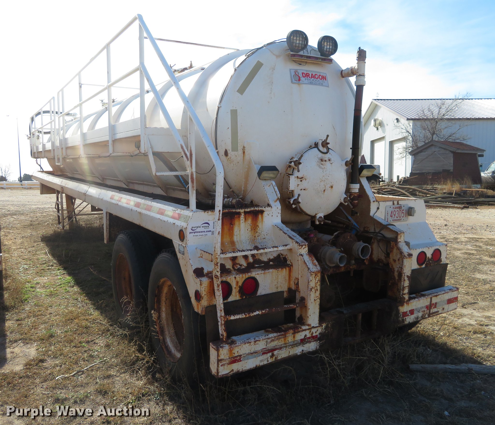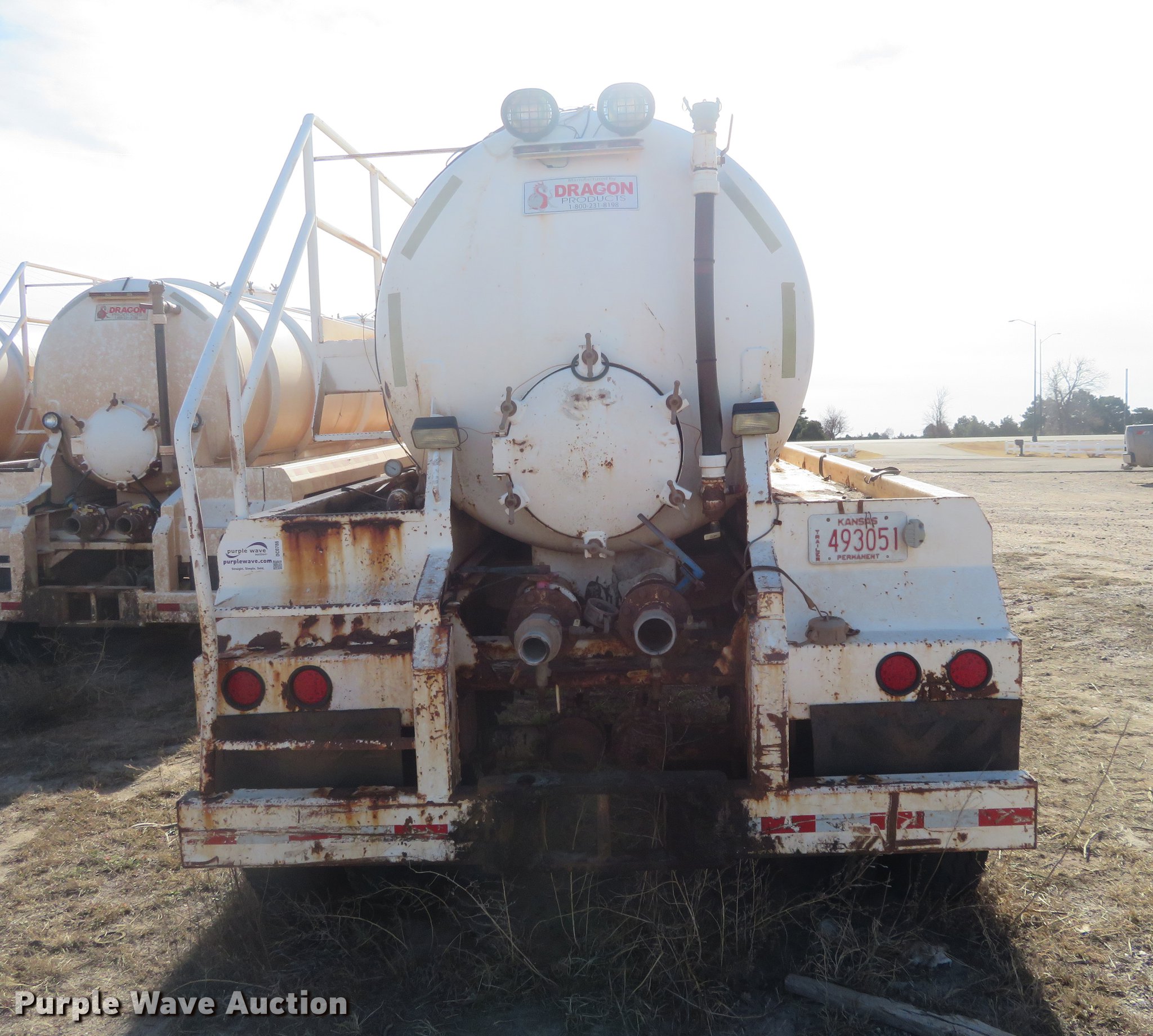 Purple Wave is selling a used Tank Trailer in Kansas. This item is a 2007 Dragon vacuum trailer with the following: Steel construction, 160 barrel capacity, Tank coating, (2) outlet valves, (4) manways, Dual leg landing gear, Fifth wheel plate, Tandem axle, Spring suspension, Air brakes, 11R24.5 tires