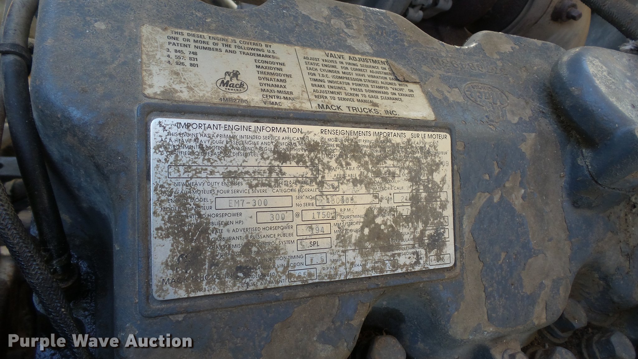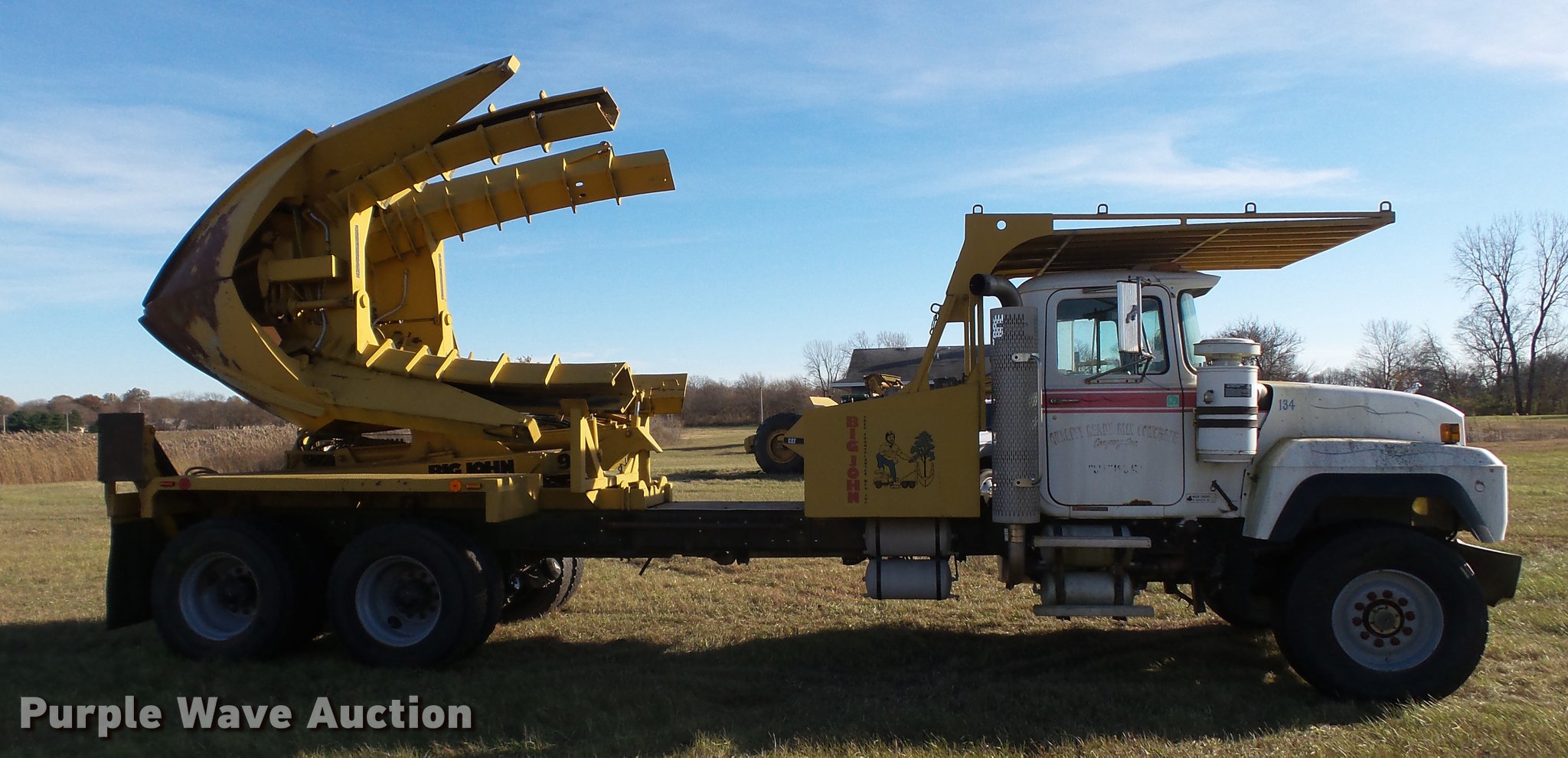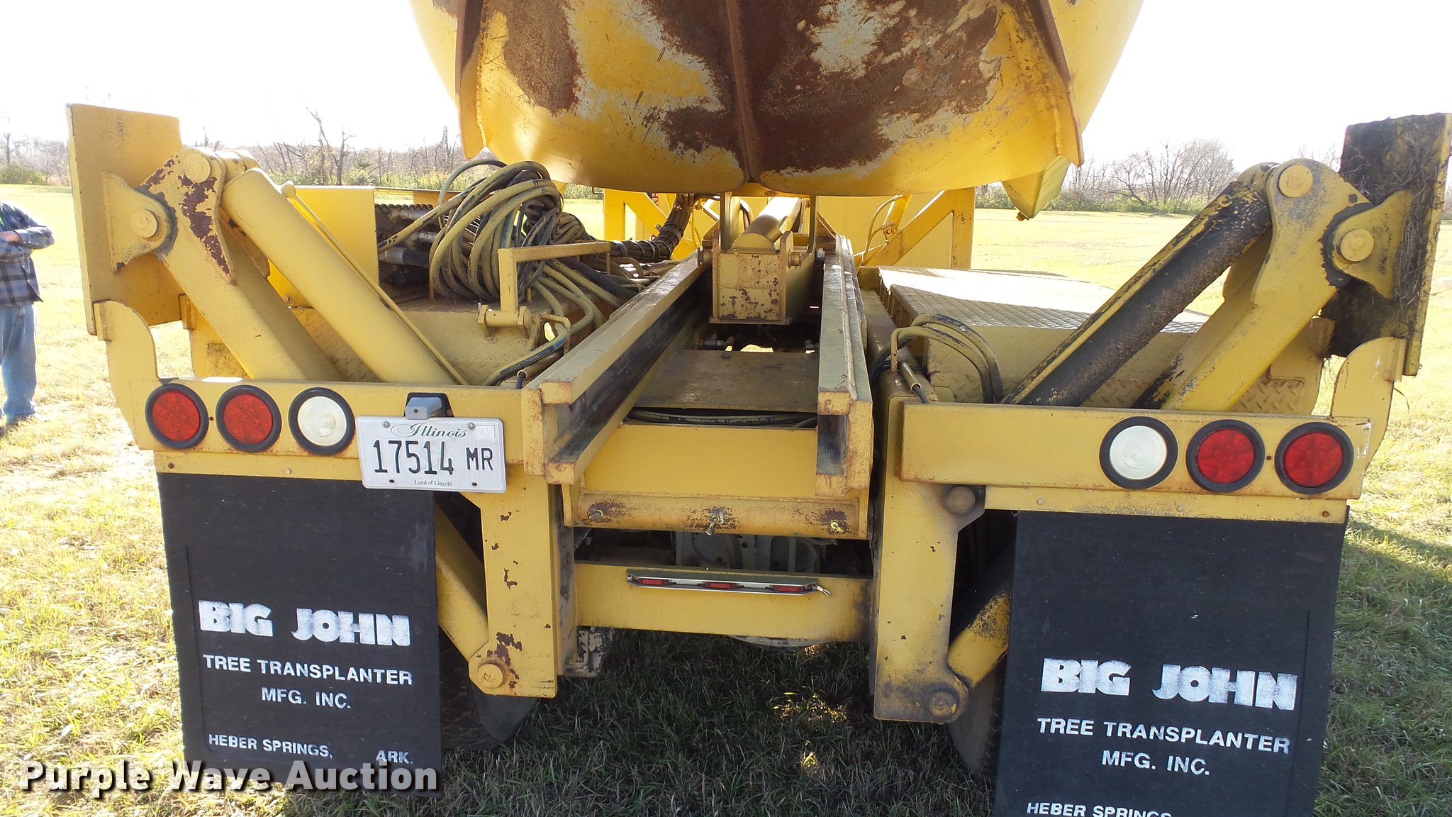 Purple Wave is selling a used Tree Spade in Illinois. This item is a 1994 Mack RD690S truck with tree spade with the following: 195,255 miles on odometer, 17,331 hours on meter, Mack E7 12.0L L6 turbo diesel engine, 300 HP, Serial 4B0309, Mack Maxitorque eight speed manual transmission, Tandem axle, Heat, AM/FM/cassette, Heated mirrors, PTO, 2008 Big John 90D tree spade, 10" to 12" maximum tree trunk diameter capacity, 90" nominal root ball width, 60" root ball depth, 400 gallon water tank, 45 gallon hydraulic oil tank, (2) hydraulic outriggers, Serial 771, Exterior visor, Front tow hooks, Mud flaps, Single fuel tank, Single rear exhaust stack, Walking beam suspension, Air brakes, 425/65R22.5 front tires, 11R22.5 rear tires