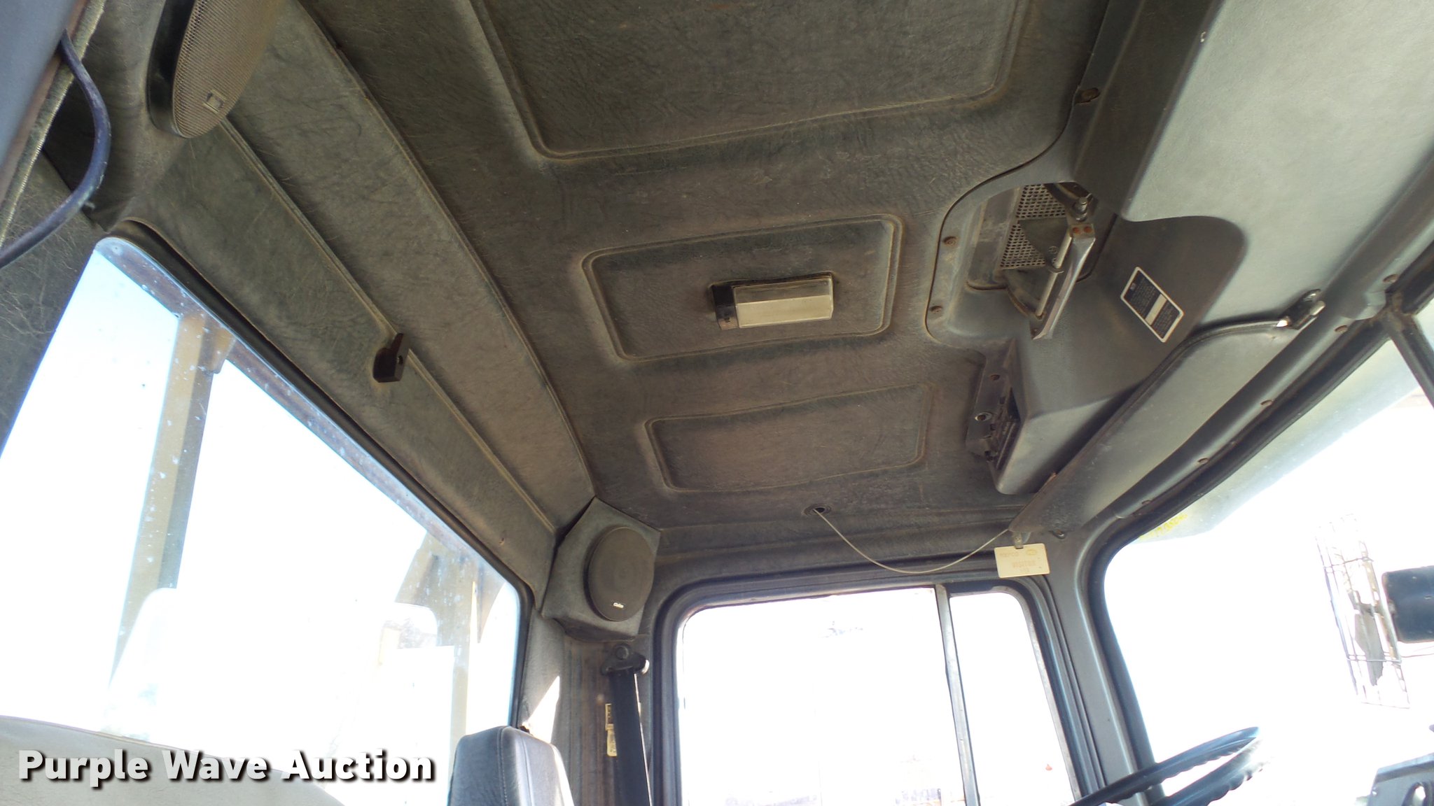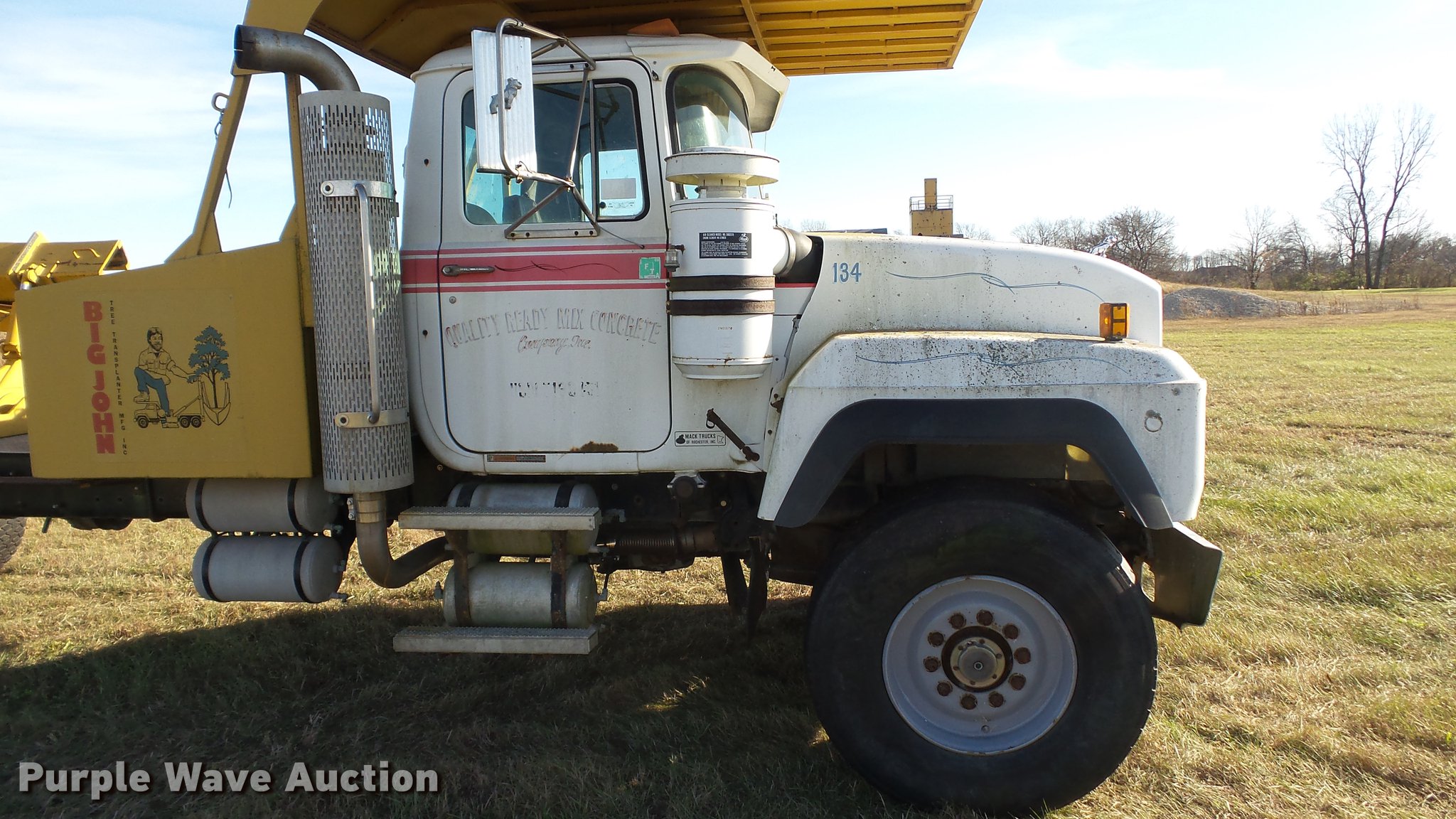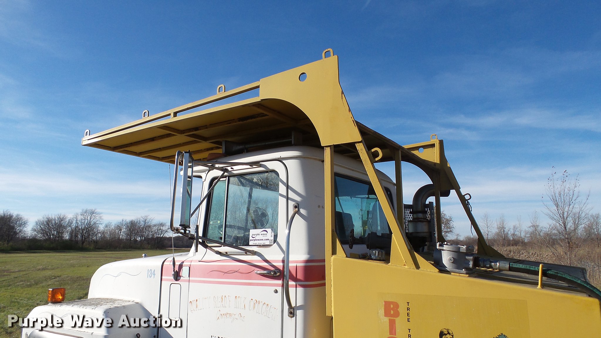 1994 Mack RD690S truck with tree spade. 195,255 miles on odometer, 17,331 hours on meter, Mack E7 12.0L L6 turbo diesel engine 300 HP, Serial 4B0309, Mack Maxitorque eight speed manual transmission, Tandem axle, Heat, AM/FM/cassette, Heated mirrors, PTO, 2008 Big John 90D tree spade 10" to 12" maximum tree trunk diameter capacity, 90" nominal root ball width, 60" root ball depth, 400 gallon water tank, 45 gallon hydraulic oil tank, (2) hydraulic outriggers, Serial 771, Exterior visor, Front tow hooks, Mud flaps, Single fuel tank, Single rear exhaust stack, Walking beam suspension, Air brakes, 425/65R22.5 front tires, 11R22.5 rear tires. Illinois title. 1M2P264C6RM015488. Quality Ready Mix Concrete Co.. Prophetstown, IL 61277