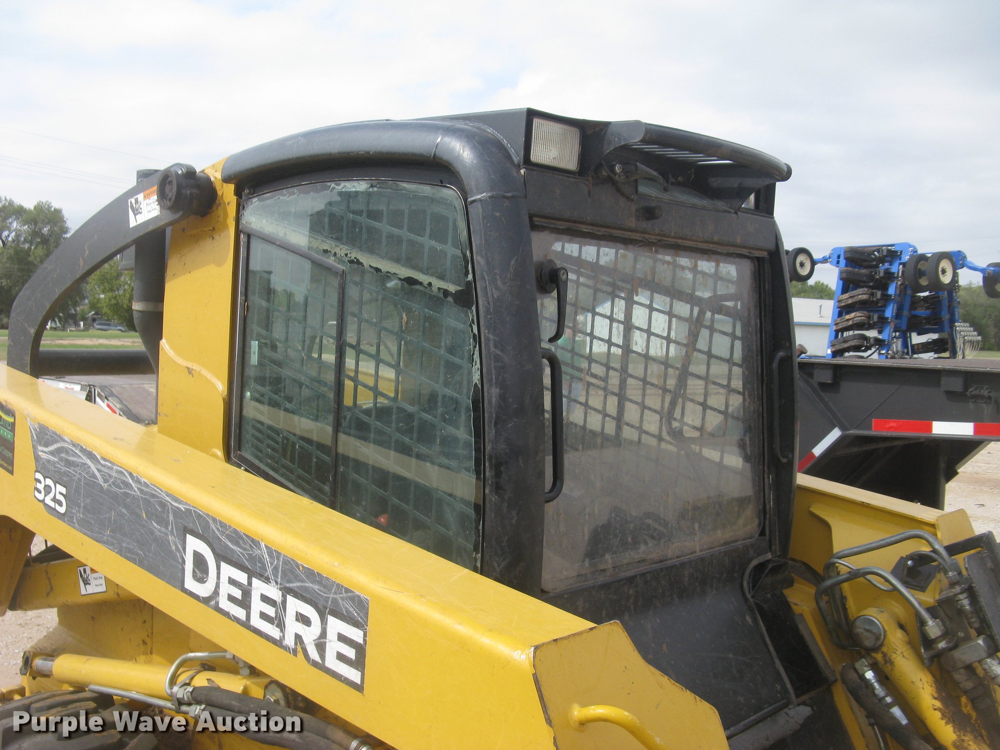 Purple Wave is selling a used Skid Steer Loader in Kansas. This item is a 2008 John Deere 325 skid steer with the following: Unknown miles on odometer, John Deere PE5030 four cylinder turbo diesel engine, Hydrostatic transmission, Enclosed cab, AC and heat, Hand and foot controls, Wipers, Front and rear work lights, Manual quick coupler, High Flow auxiliary hydraulics, Counter weights, 12 x 16.5 tires, Non-operational unit, Engine compartment fire damage, Wiring damage, Plastic components melted, Lift arm cylinder pins removed, but included, Serial T00325E158343