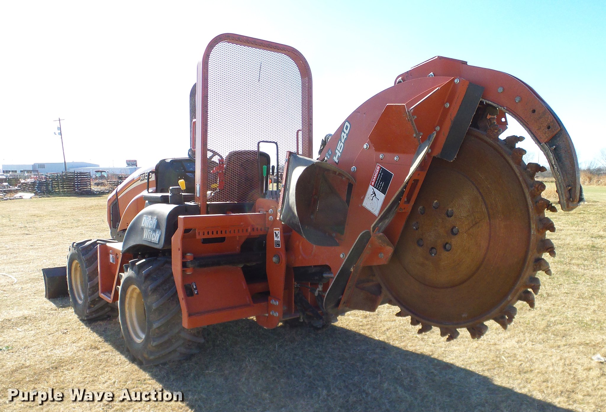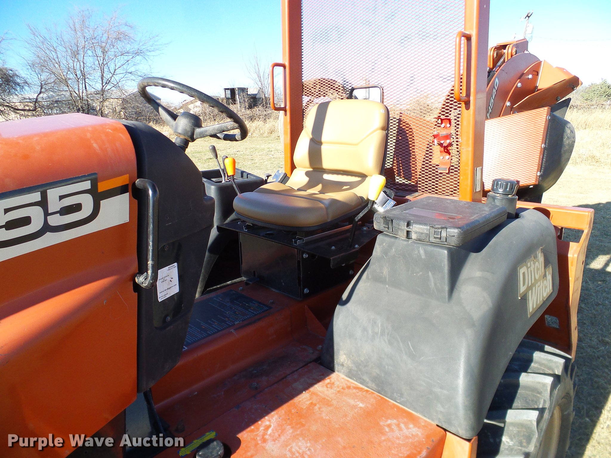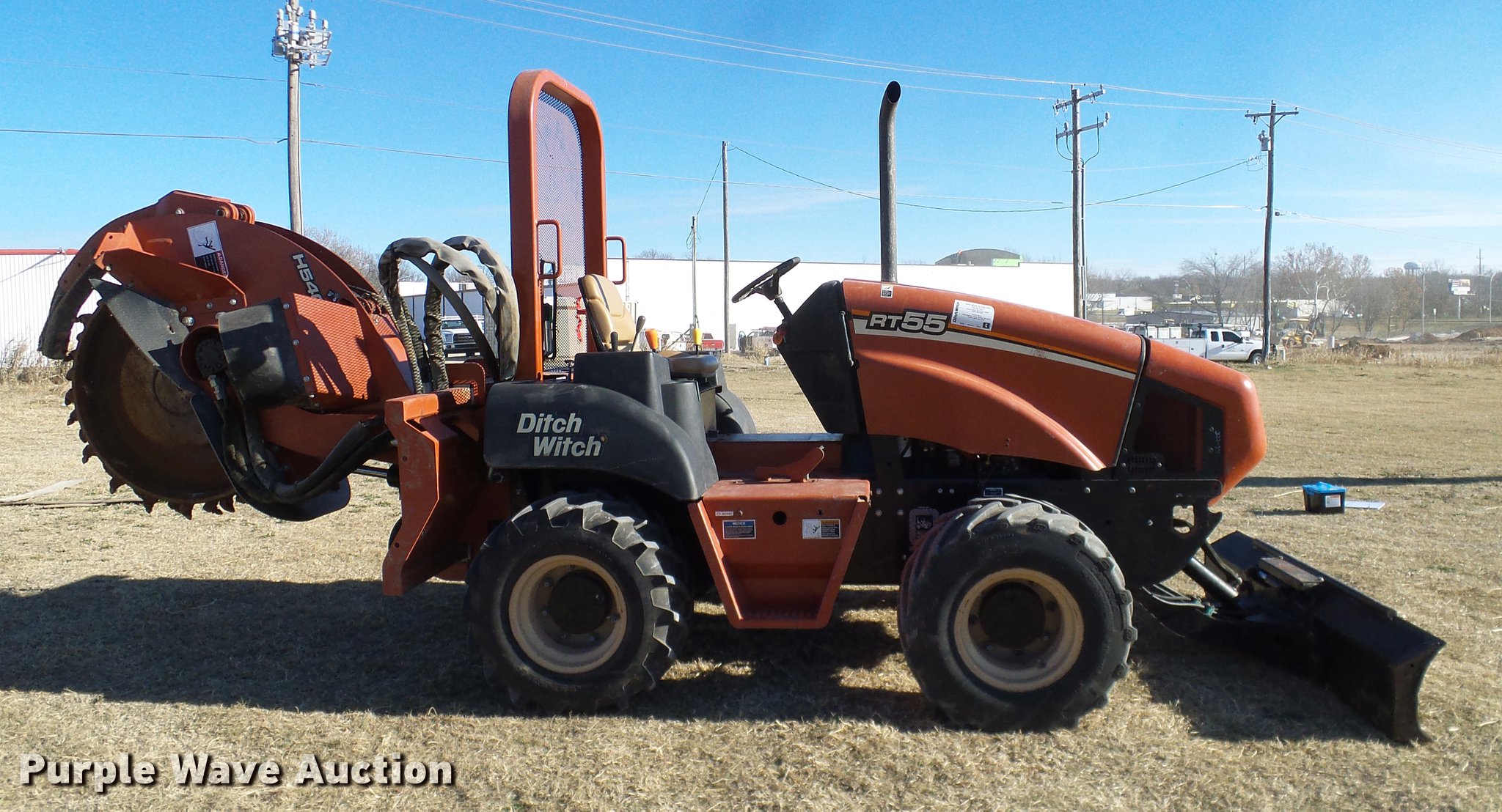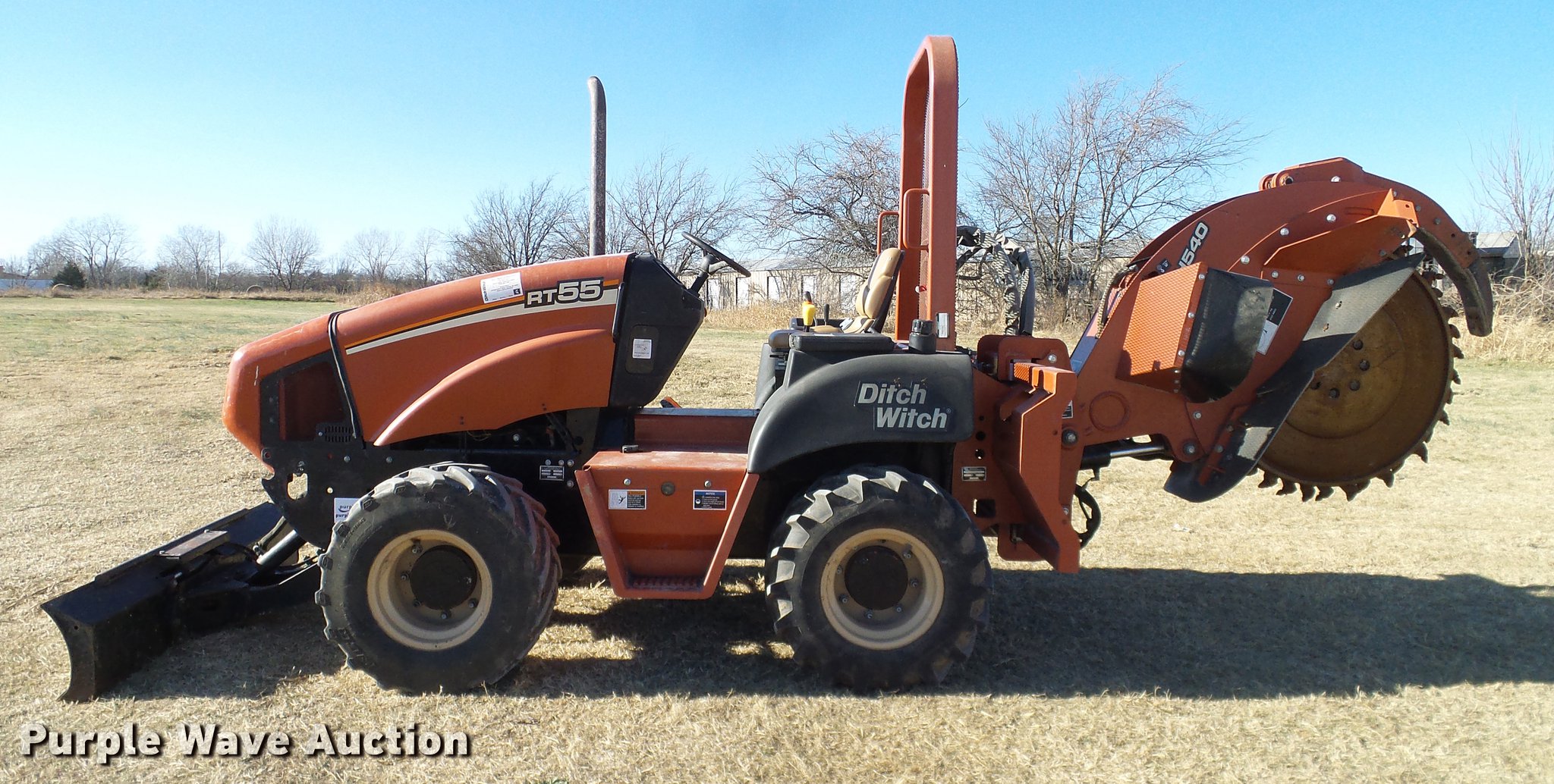Purple Wave is selling a used Trencher or Rock Saw in Oklahoma. This item is a 2005 Ditch Witch RT55 rock saw with the following: 391 hours on meter, Four cylinder diesel engine, Hydrostatic transmission, OROPS, Suspension seat, H540 rock wheel, 46" diameter wheel, 4" cutting width, Hydraulic side shift, 72"W four way backfill blade, 31x15.5-15 tires, Approx. 24 spare teeth, Serial 5Z0282