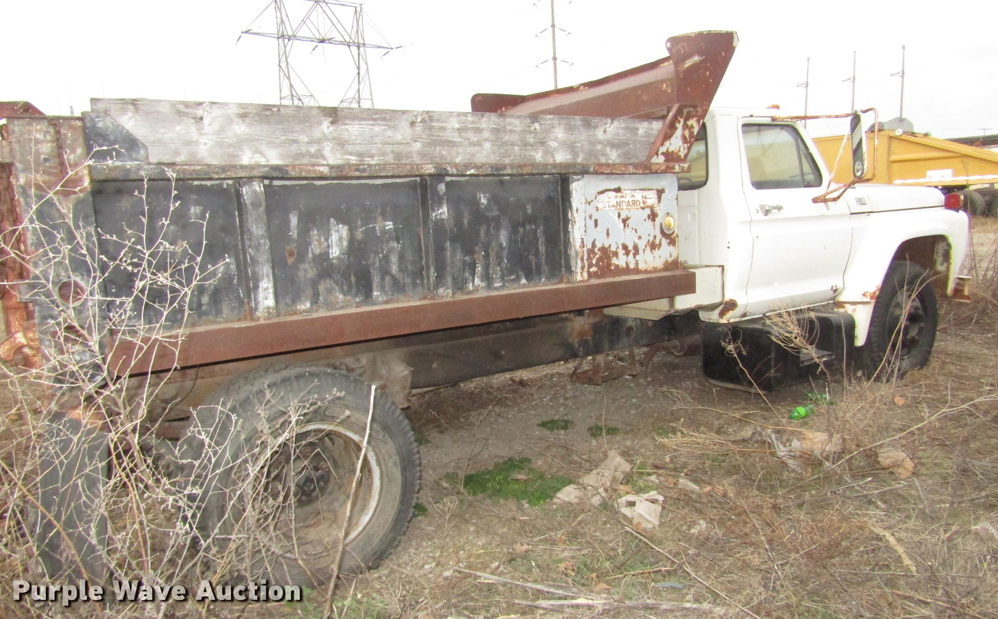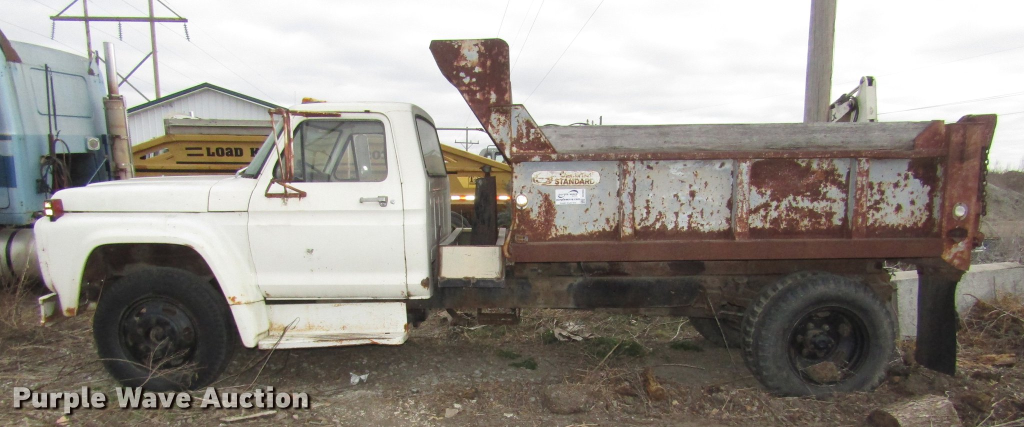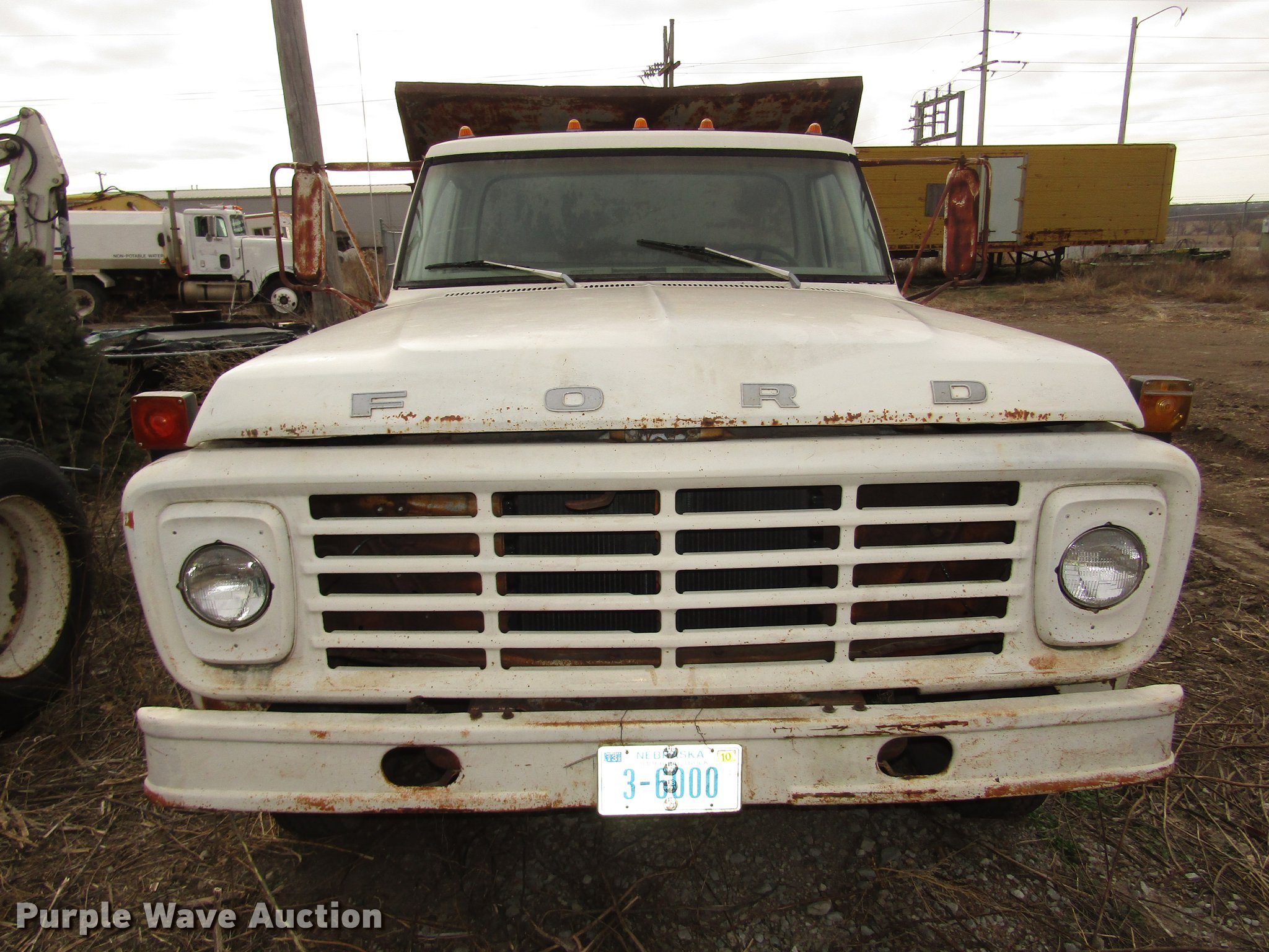 Purple Wave is selling a used Construction Dump Truck in Nebraska. This item is a 1974 Ford F600 dump truck with the following: 55,957 miles on odometer, V8 gas engine, Four speed manual transmission, Single axle, Heat, AM, Suspension seat, PTO, Front tow hooks, Heil A610-1941 dump bed, 10'L x 94"W, 23" side height, 7" side board height, 5 cu. yd. capacity, Single ram hoist, Manual operated end gate, Serial 129159, Single fuel tank, 180" wheelbase, Spring suspension, Hydraulic brakes, 8.25-20 tires, GVWR 19,700 lbs