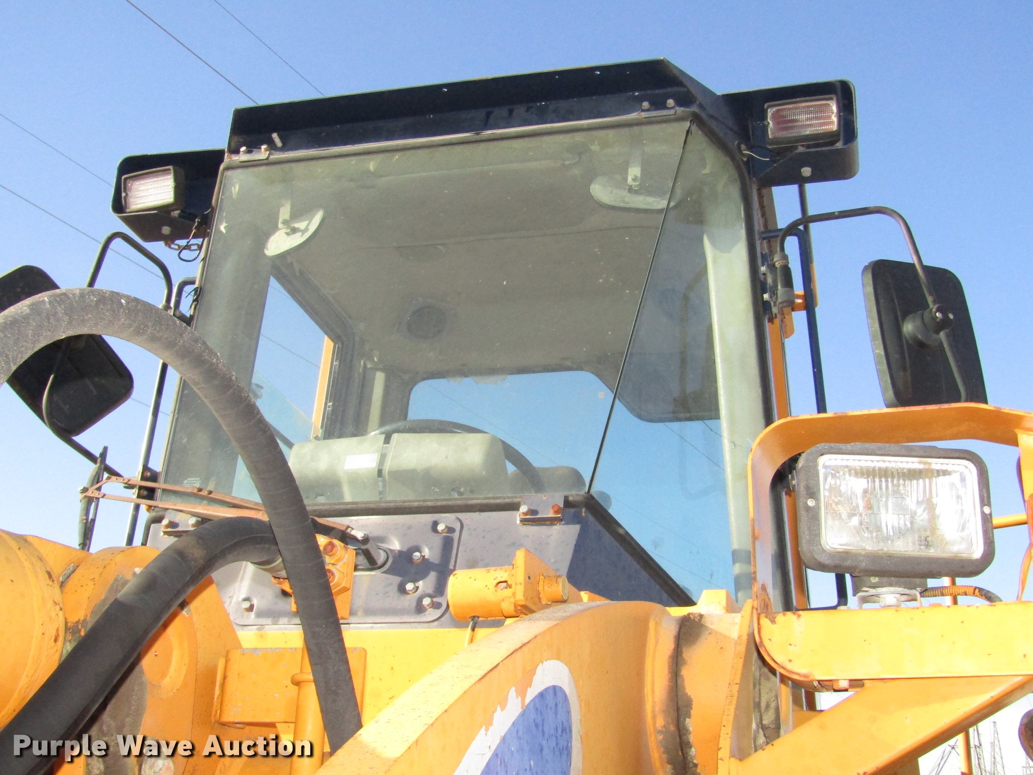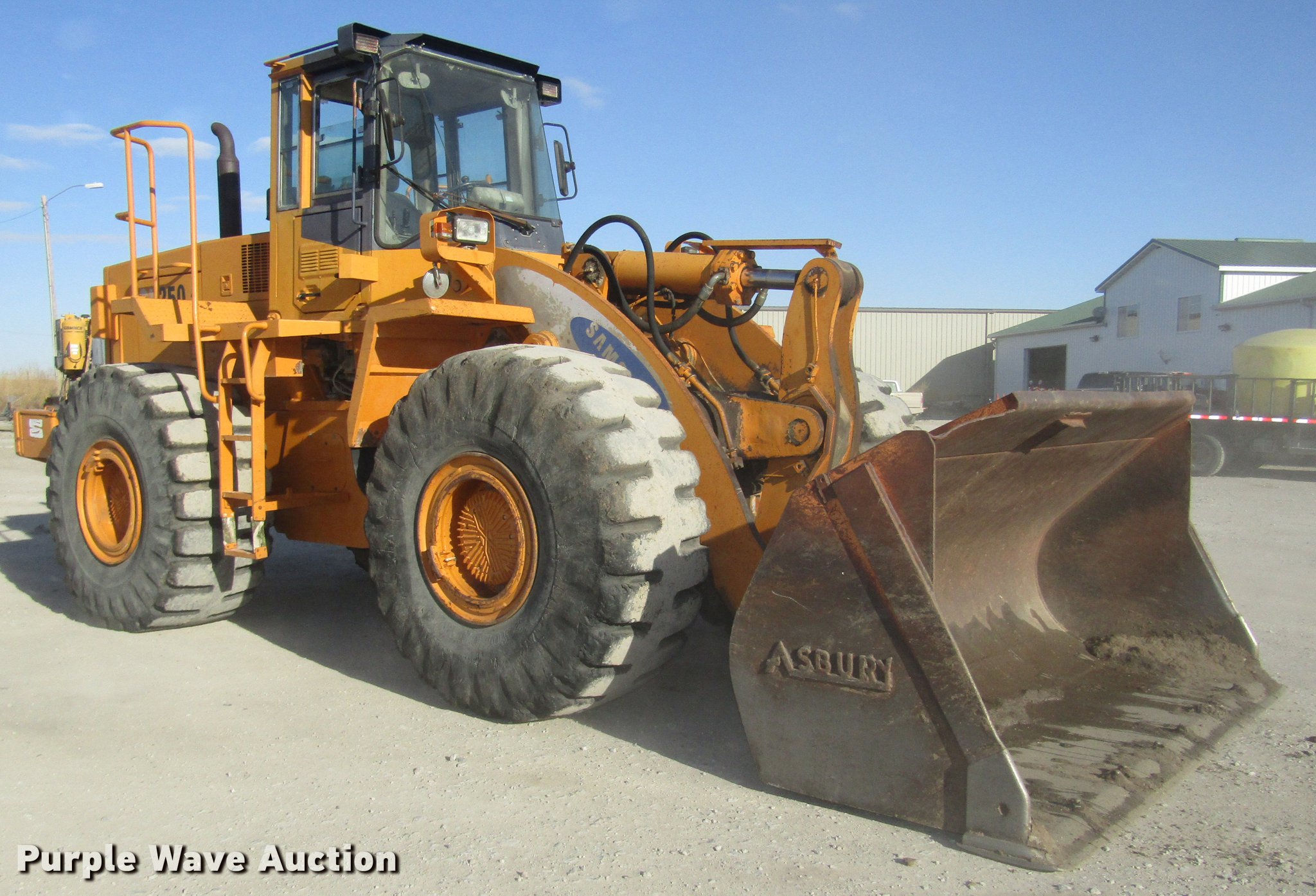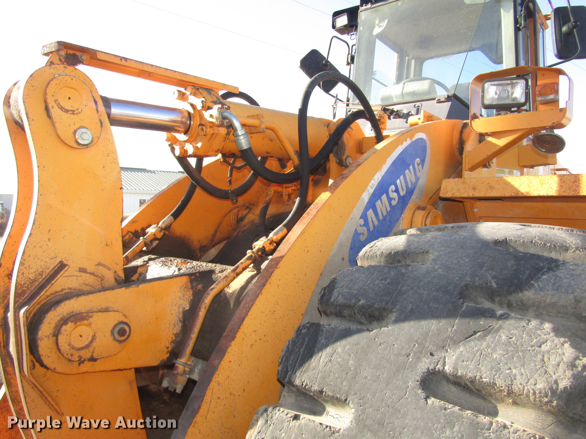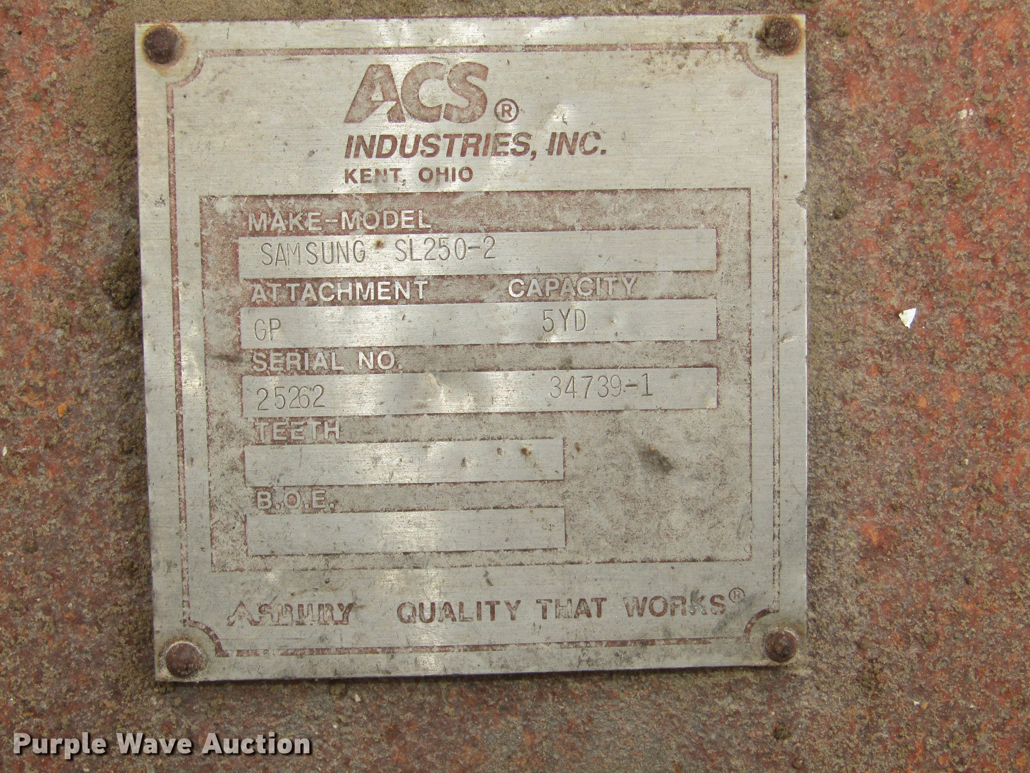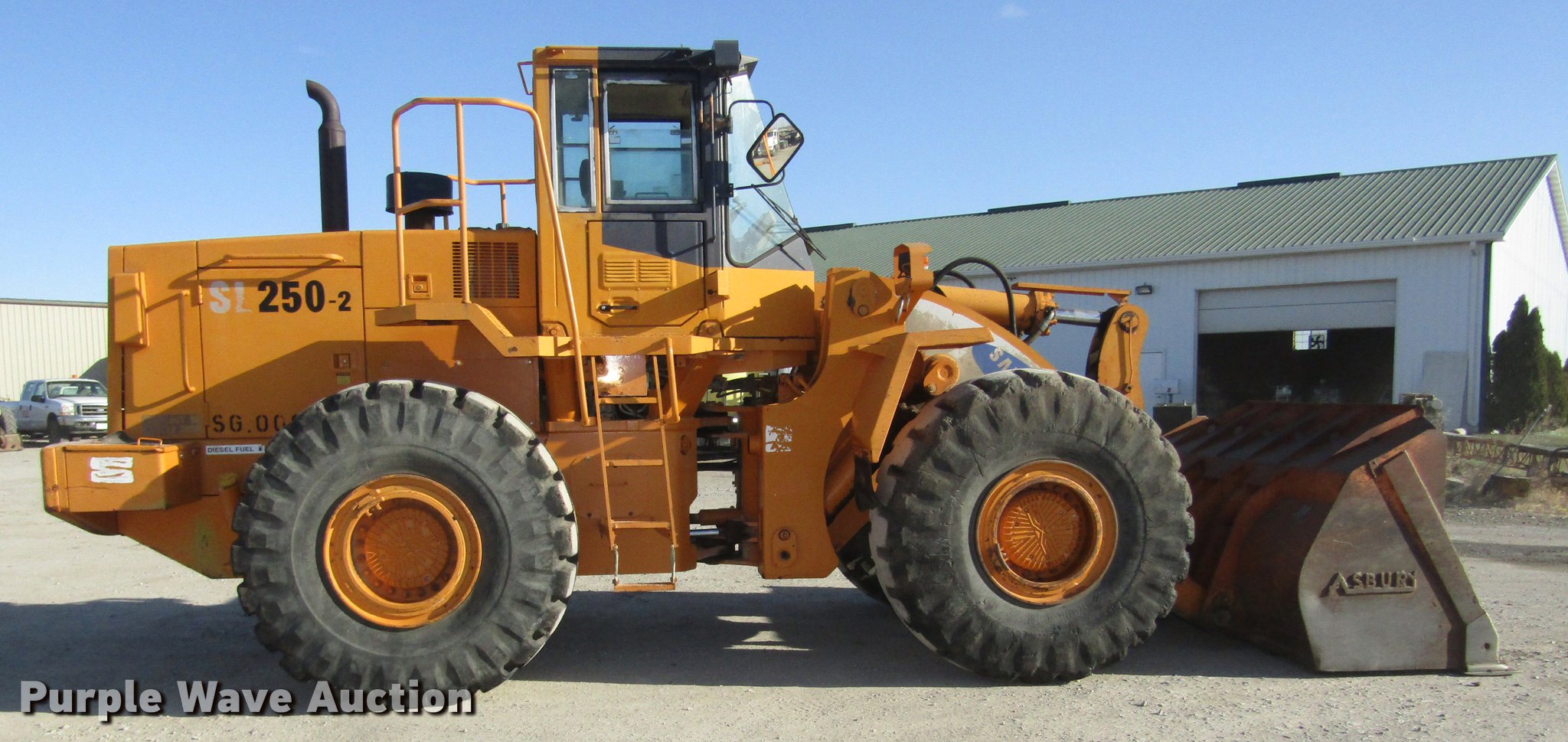 Purple Wave is selling a used Wheel Loader in Nebraska. This item is a Samsung SL250-2 wheel loader with the following: 9,187 hours on meter, Cummins six cylinder turbo diesel engine, Powershift transmission, 4F-4R gears, Enclosed cab, AC and heat, AM/FM, Joystick bucket controls, Wipers, Front and rear work lights, Asbury SL250-2 120"W general purpose bucket, 5 cu. yd. capacity, Bolt-on cutting edge, Pin hitch, Yokohama 26.5-25 tires, Dash cover missing, Transmission slips out of gear intermittently