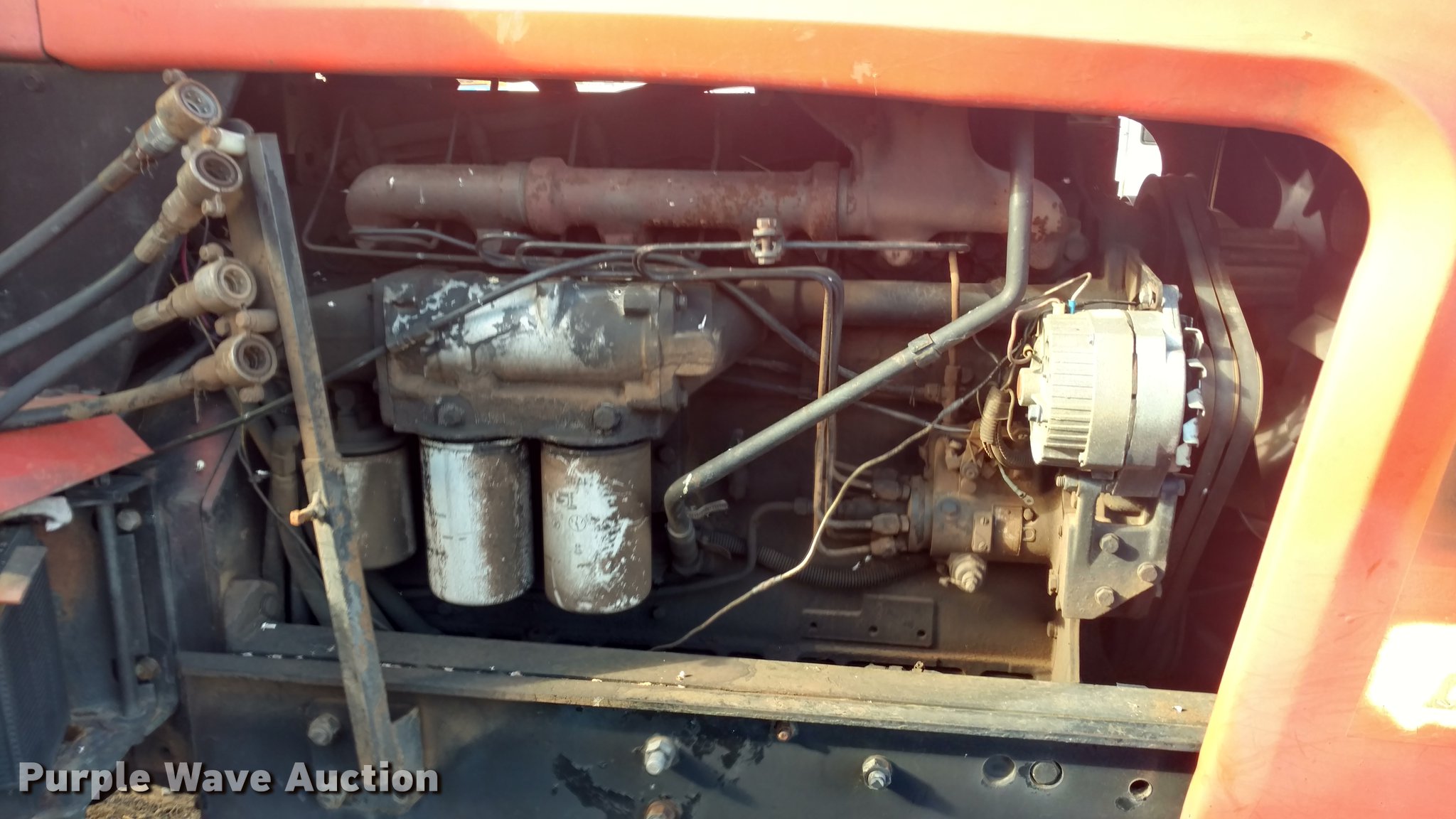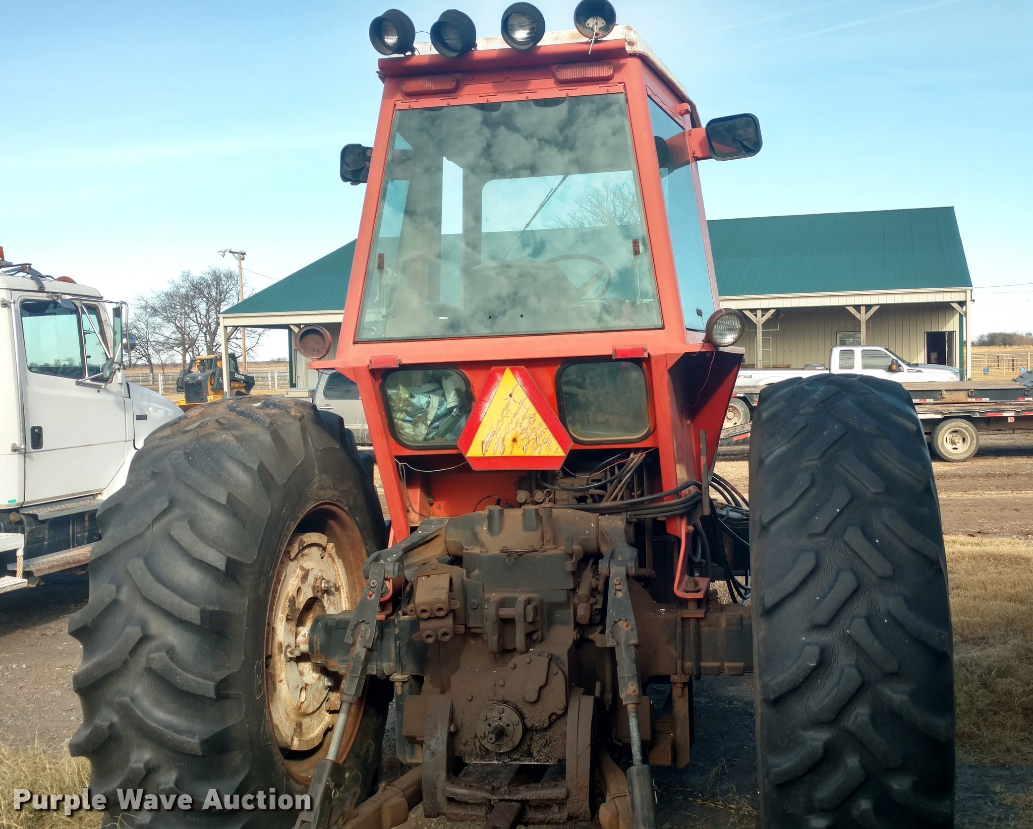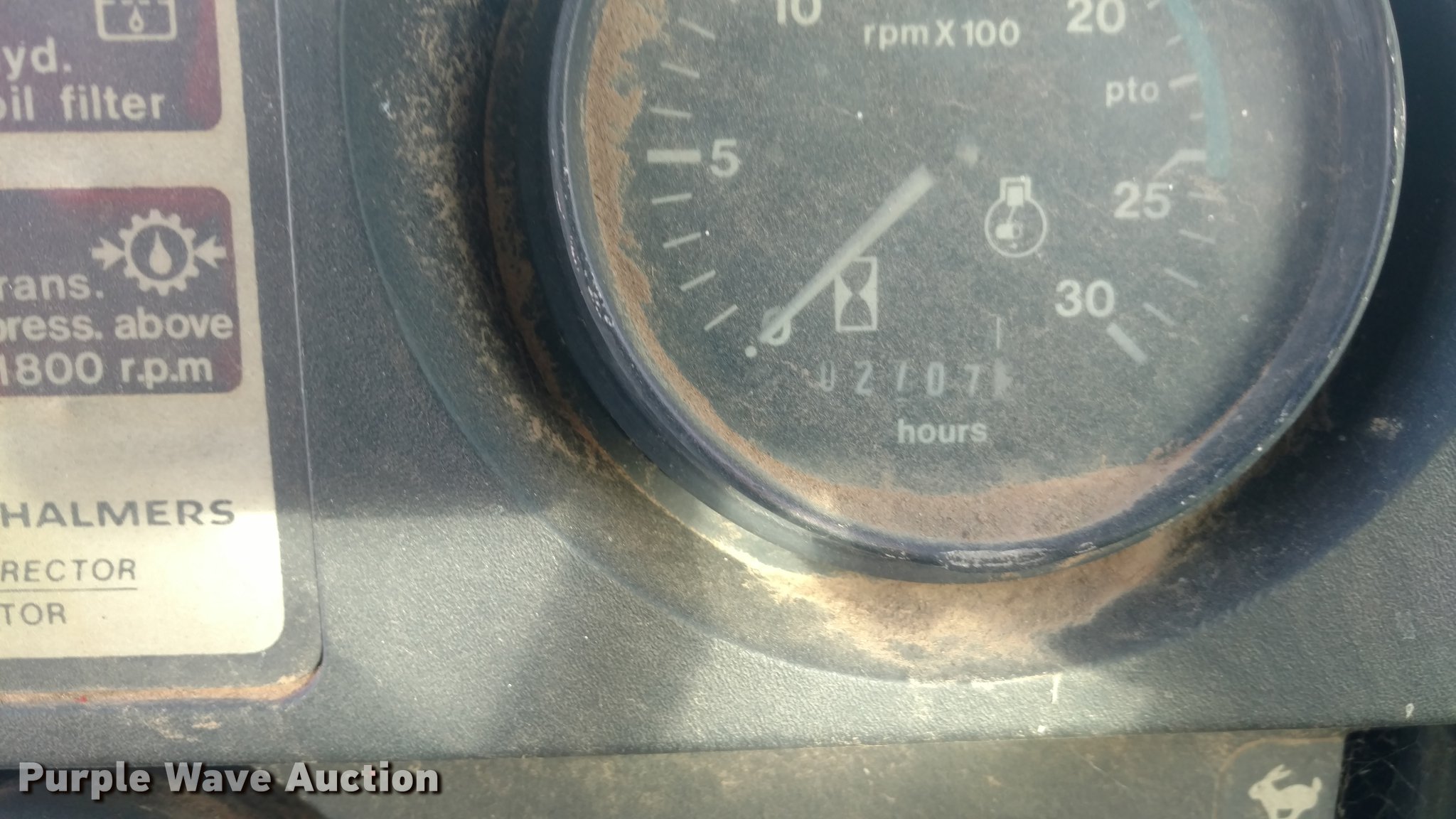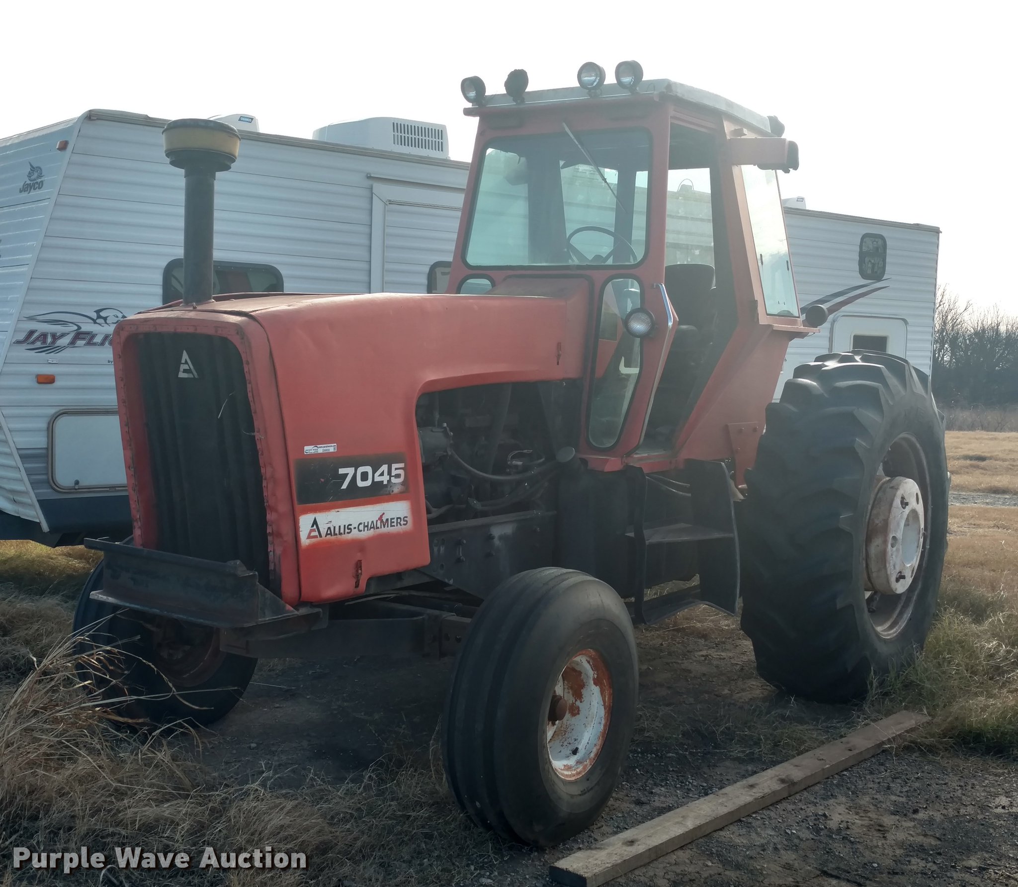 Purple Wave is selling a used Tractor in Oklahoma. This item is a Allis Chalmers 7045 tractor with the following: 2,107 hours on meter, Six cylinder diesel engine, Manual transmission, 20F-4R gears, Differential lock, AC and heat, Front and rear work lights, Three point, 540 PTO, Draw bar, (2) front hydraulic remote sets, (2) rear hydraulic remote sets, 11.00-16 front tires, 20.8-38 rear tires, Non-operational AC, Door missing, Radiator leaks, Battery weak