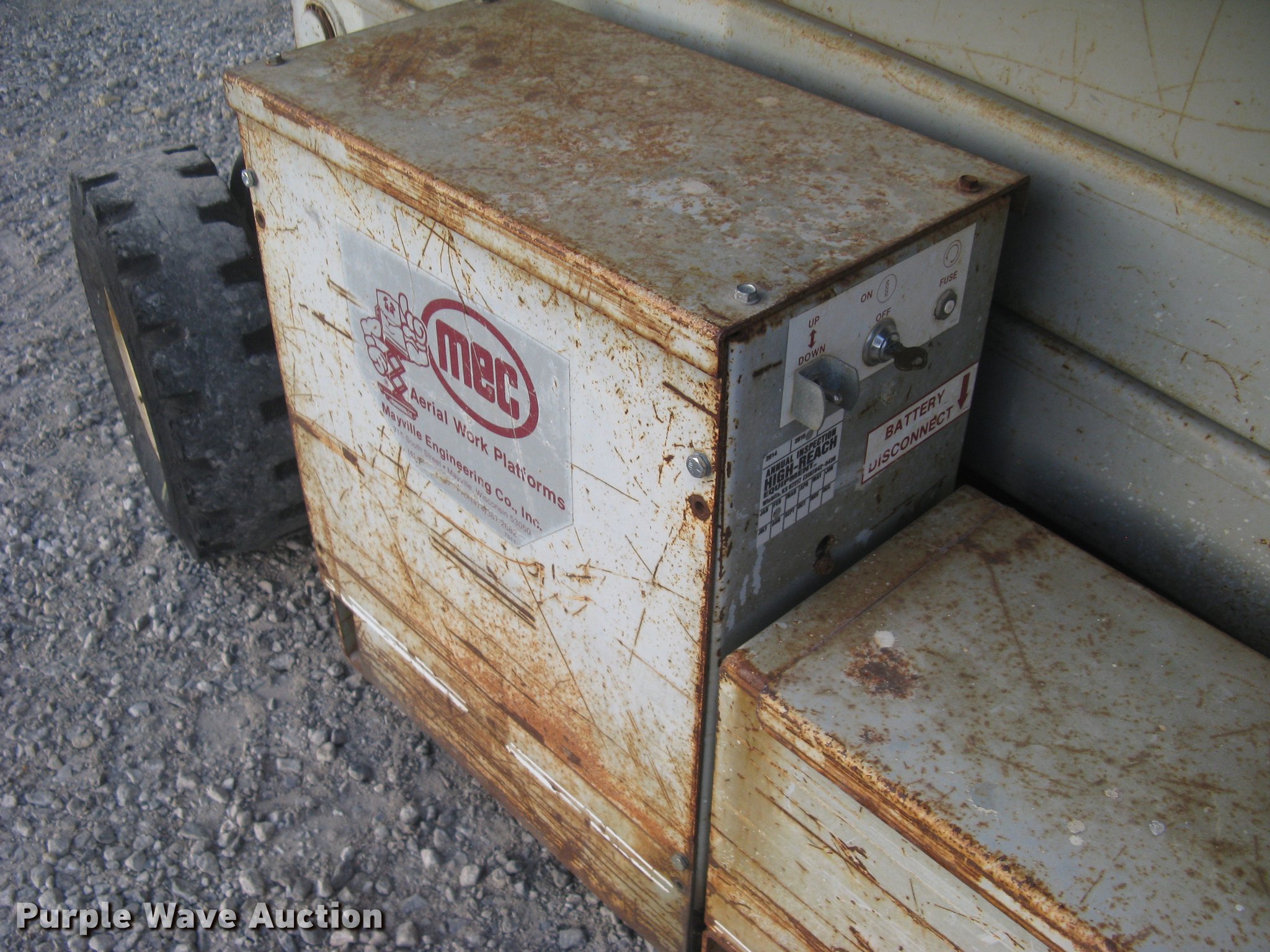 Purple Wave is selling a used Scissor or Vertical Lift in Kansas. This item is a Mec 2548HT scissor lift with the following: Unknown hours on meter, Electric operation, 1,000 lbs max lift capacity, 24'9" max lift height, Platform and ground controls, 100"L x 48"W platform, Manual platform extensions, On-board charger, 5.00x8 solid tires, Serial 7100619
