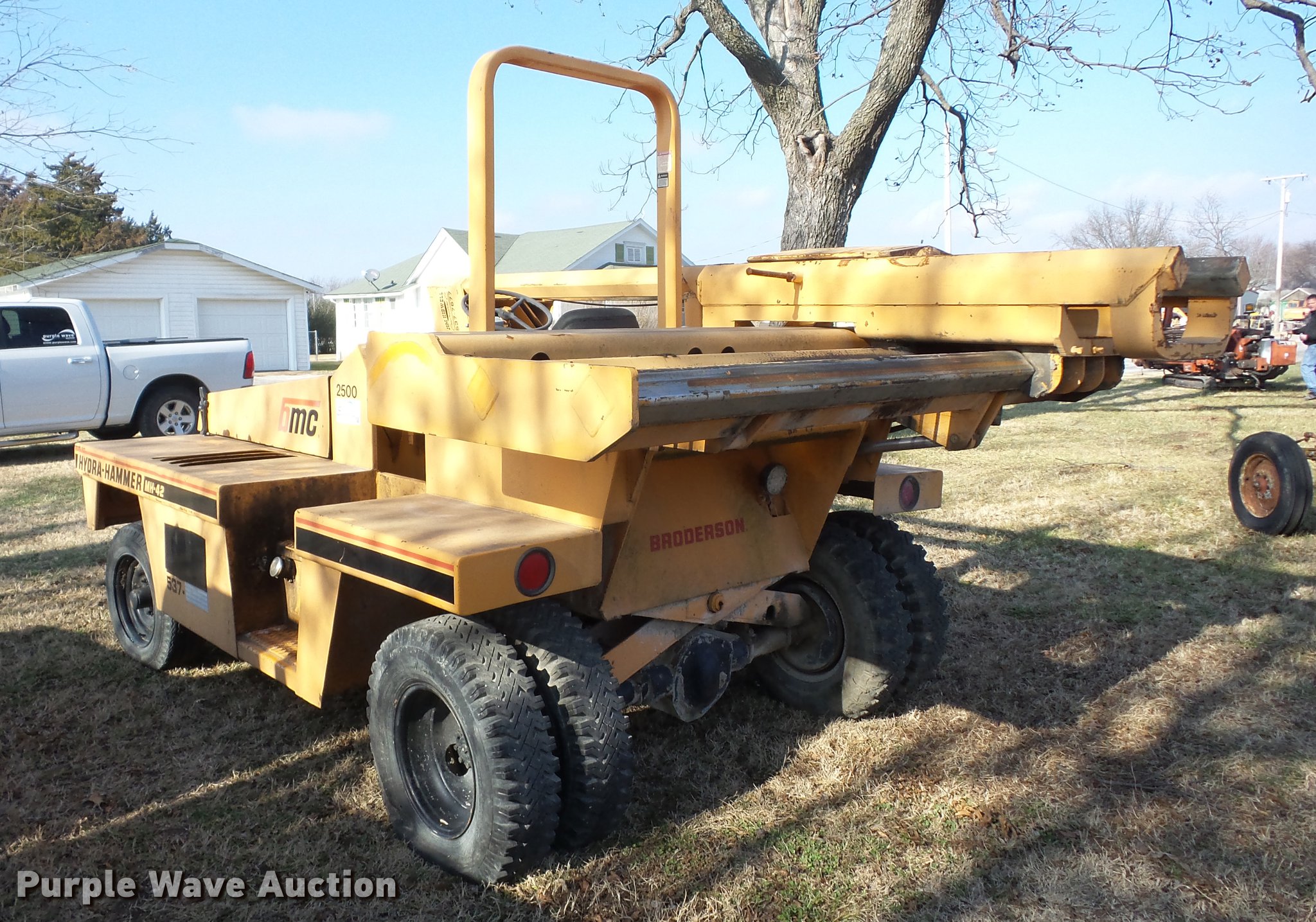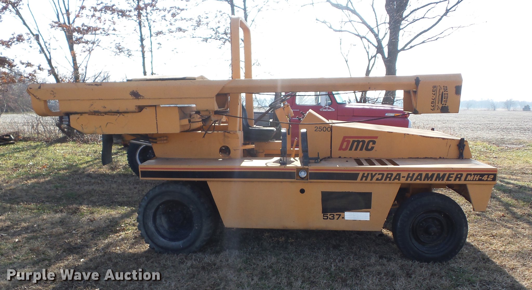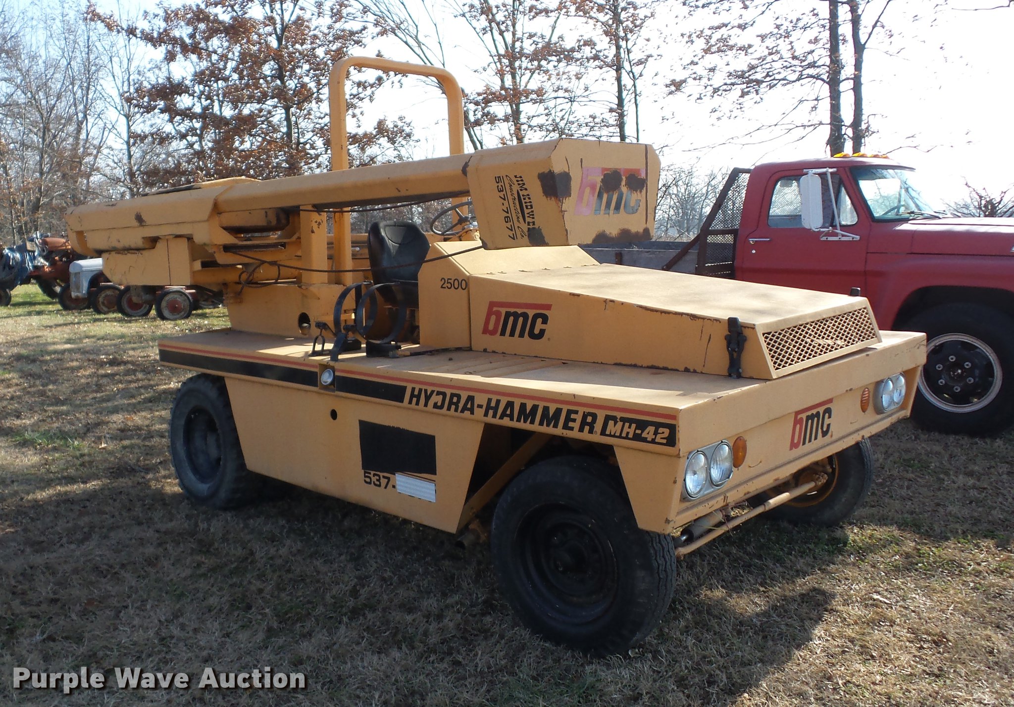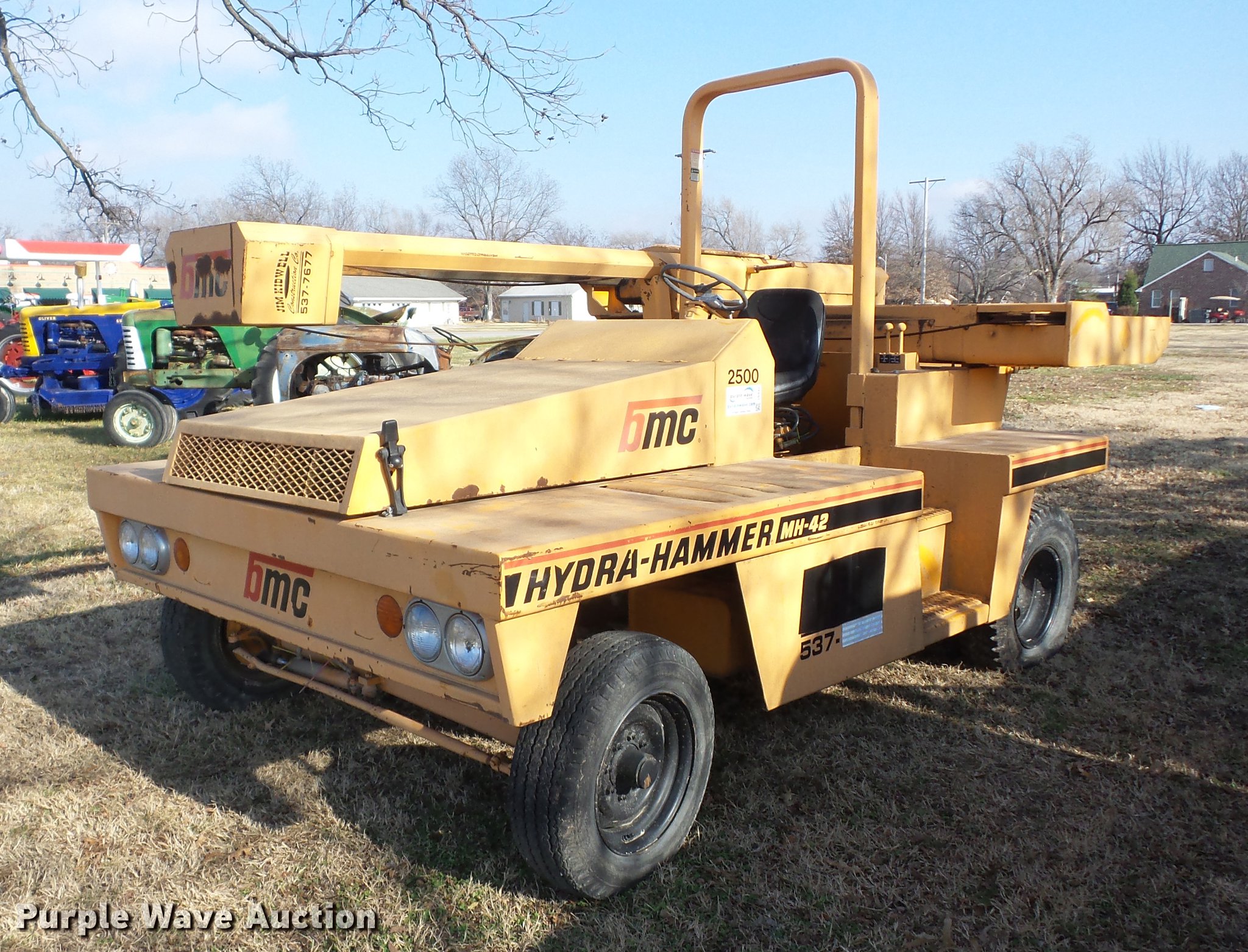 Purple Wave is selling a used Breaker or Hammer in Kansas. This item is a BMC MH-42 hydra-hammer pavement breaker with the following: 2,690 hours on meter, Six cylinder propane engine, Manual transmission, 2F-1R gears, OROPS, 7.50-16 tires, Non-operational automatic breaker, Breaker hydraulic oil leak, Serial 900B