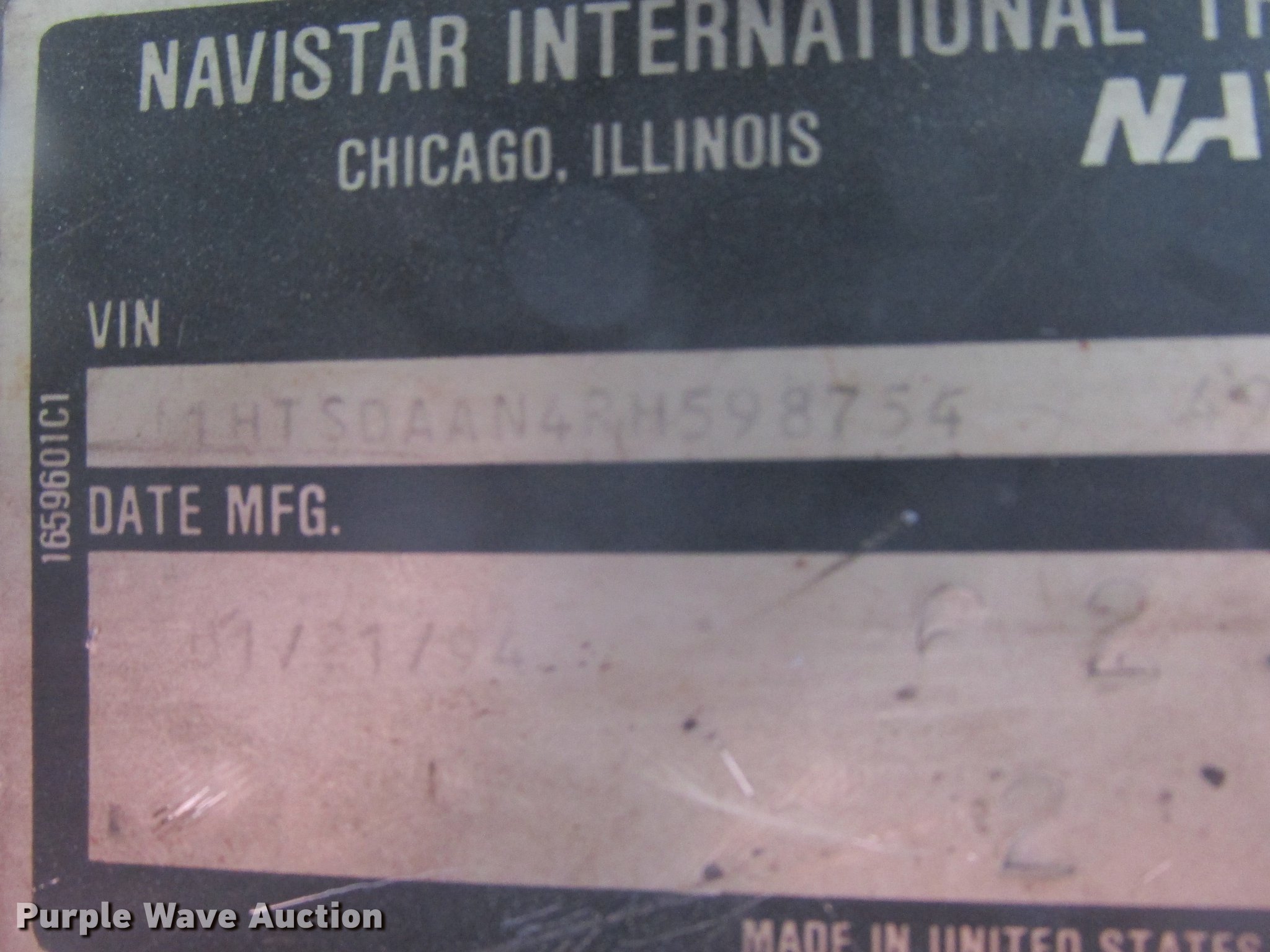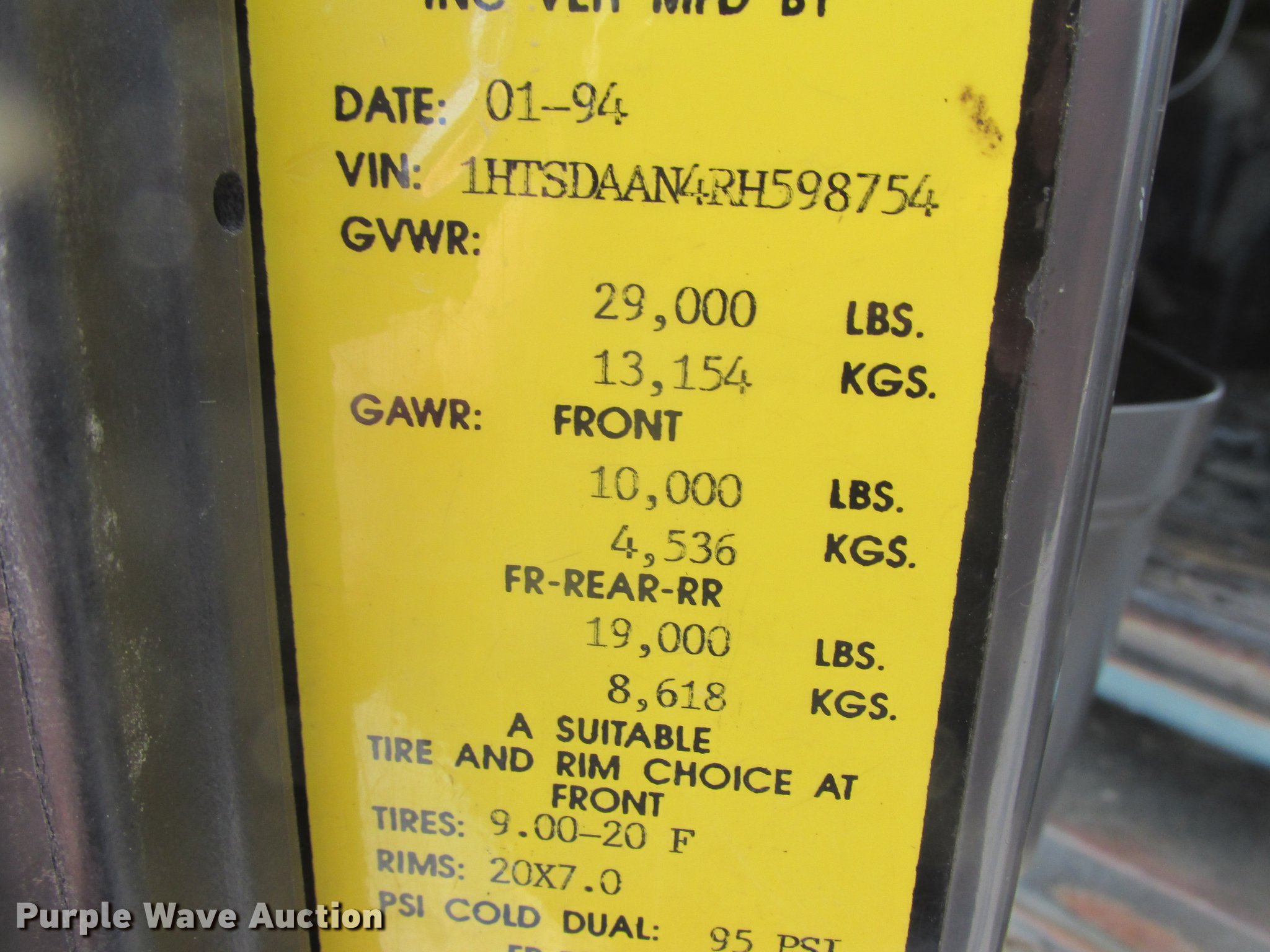 1994 International 4900 vacuum truck. 52,488 miles on odometer, International DT466 7.6L L6 turbo diesel engine, Spicer Double Duty five speed manual transmission, Two speed rear end, Single axle, Heat, AM/FM, PTO, Ether start aid, 1994 Ibex vacuum tank 2,200 gallon capacity, Single ram hoist, 800 gallon per minute maximum load rate, Hydraulic operated end gate, 4" hose connections, Unlined tank, Work lights, Ladder, Toolbox, Single fuel tank, Single exhaust stack, 206" wheelbase, Spring suspension, Air brakes, 11R22.5 tires, GVWR 29,000 lbs. Minnesota title. Title distribution may be delayed up to 14 days from verification of funds. 1HTSDAAN4RH598754. Fitzgerald Trucking & Excavating. 21432 350th St. Goodhue, MN 55027