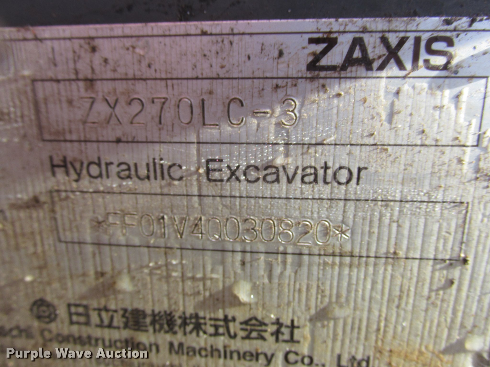 Purple Wave is selling a used Hydraulic Excavator in Minnesota. This item is a 2009 Hitachi Zaxis 270LC-3 excavator with the following: 7,504 hours on meter, Isuzu AH-4HK1X six cylinder turbo diesel engine, Two speed hydrostatic transmission, EROPS, AC and heat, AM/FM, Air suspension seat, Wipers, Front and rear work lights, Travel alarm, 12.5 stick length, 72"W ditching bucket included, CWS hydraulic thumb, Hydraulic quick coupler, Two way auxiliary hydraulics, Eight bottom rollers, 32"W steel triple grouser track pads, Bucket pictured not included, will be replaced with 72" ditching bucket prior to auction, Serial FF01V40030820