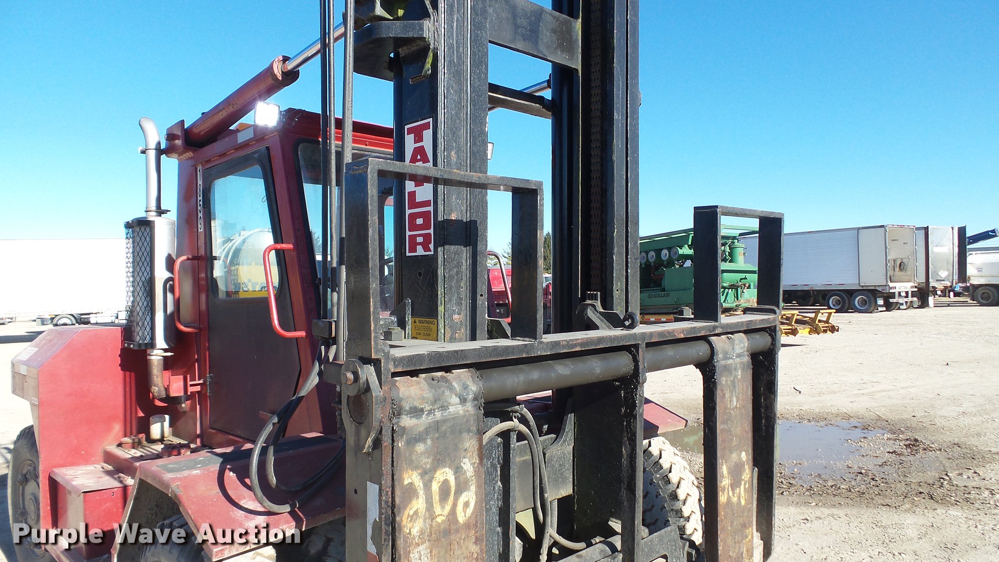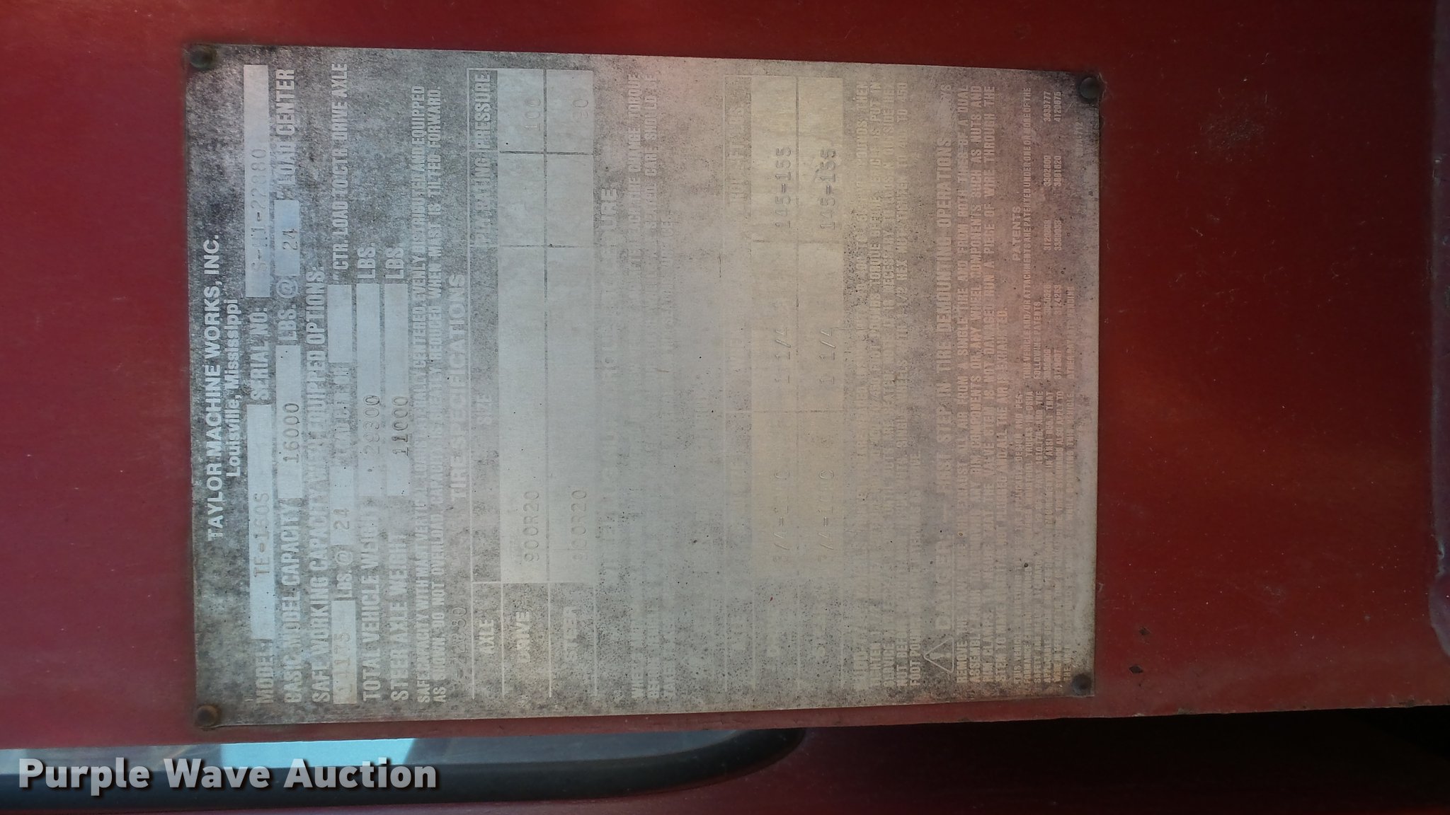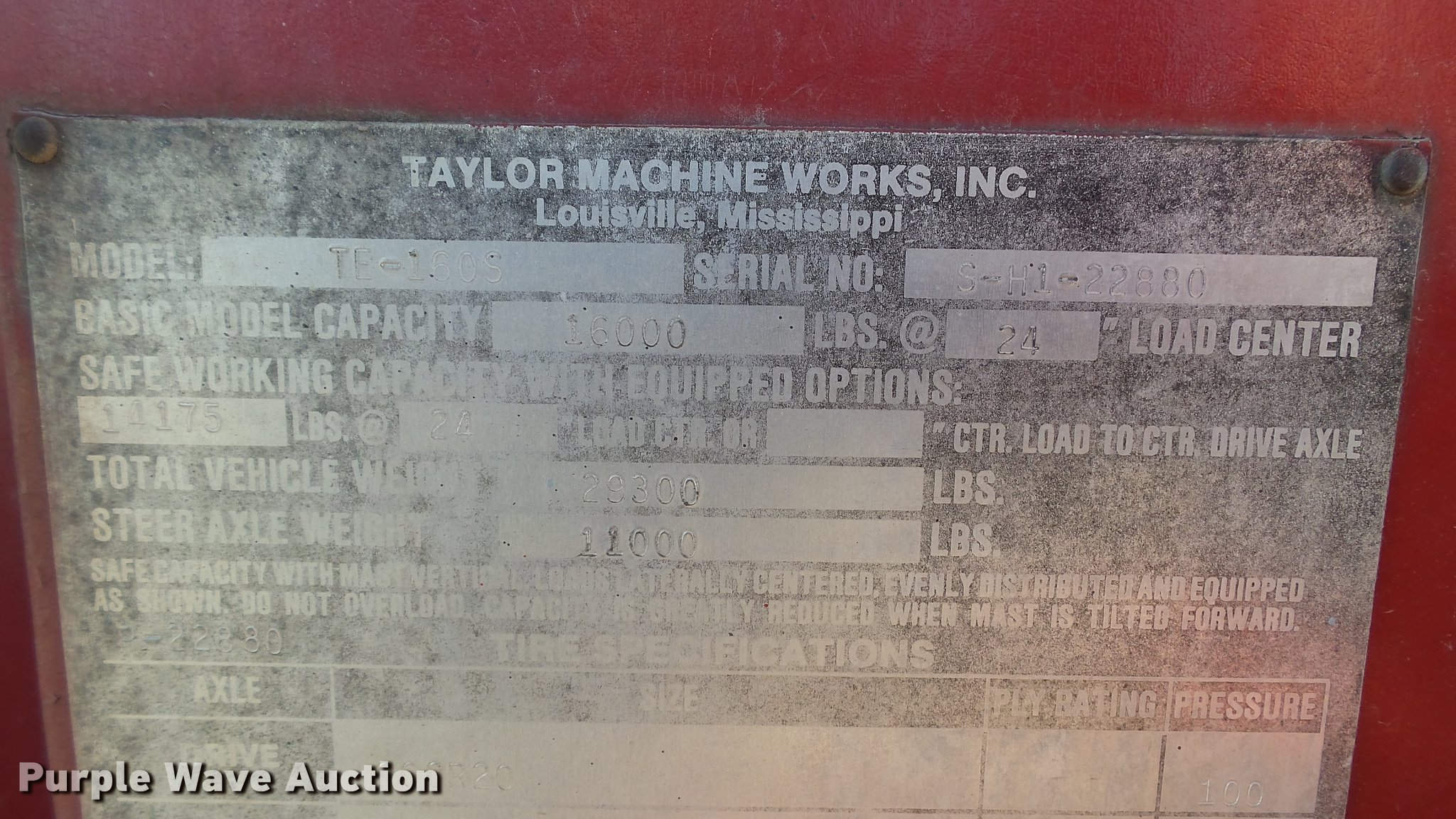 Purple Wave is selling a used Strt. Mast Rough Terr. Forklift in Illinois. This item is a Taylor TE-160S forklift with the following: 3,981 hours on meter, Hours may vary, still in use, Cummins six cylinder diesel engine, Powershift transmission, 3F-3R gears, EROPS, Work lights, Wiper, Backup alarm, 16,000 lbs max lift capacity, 180" max lift height, Two stage mast, Side shift, Mast tilt, 94"L forks, Air brakes, 9.00-20 tires, Serial S-H1-22880, Unit# 1859