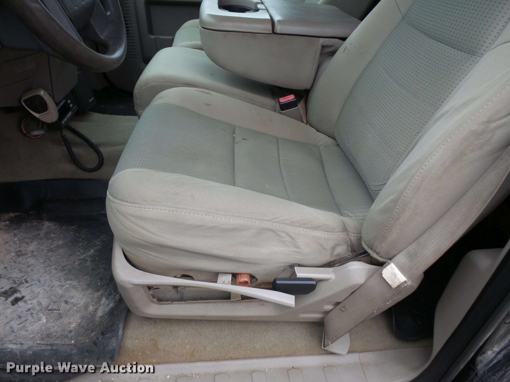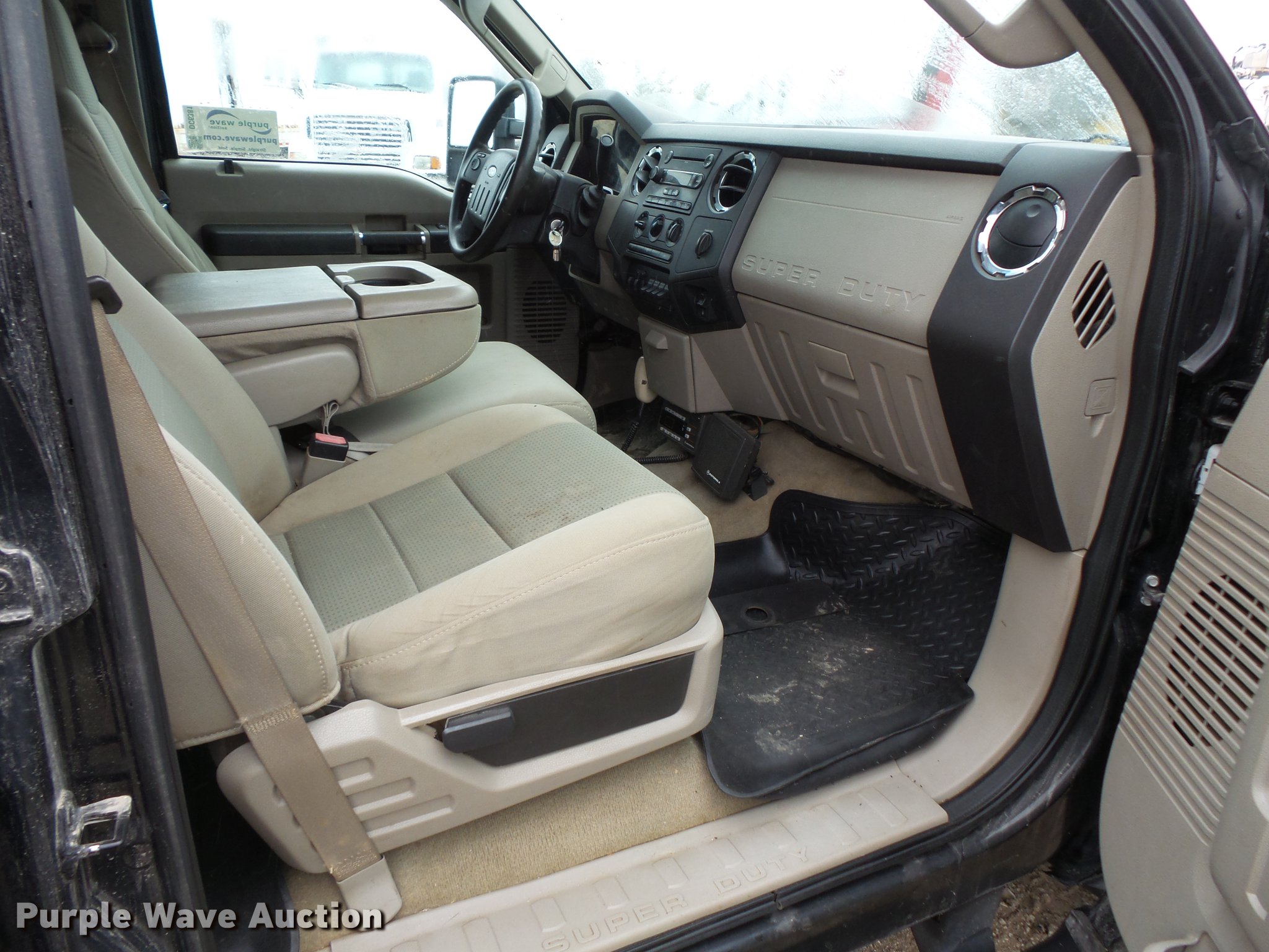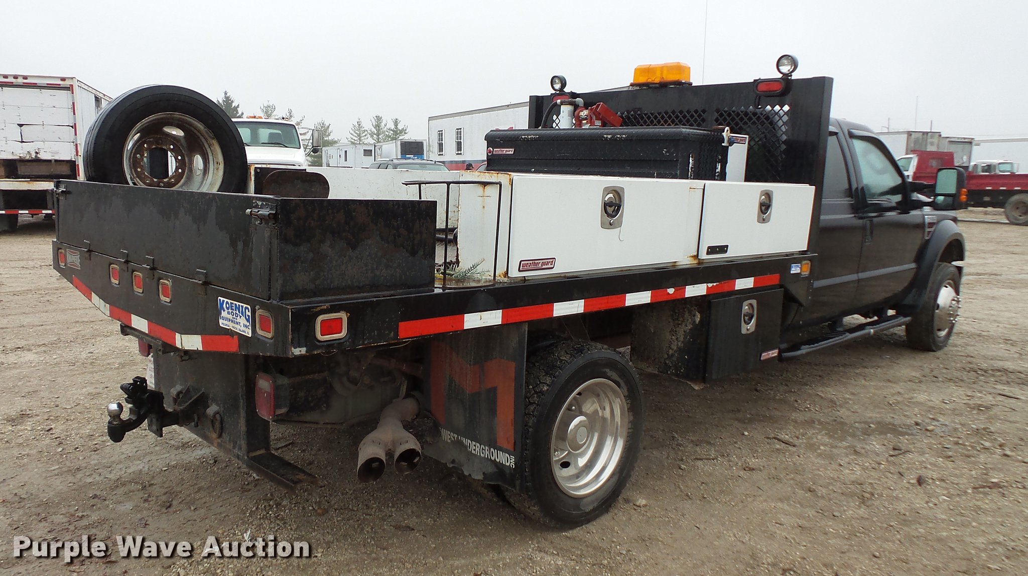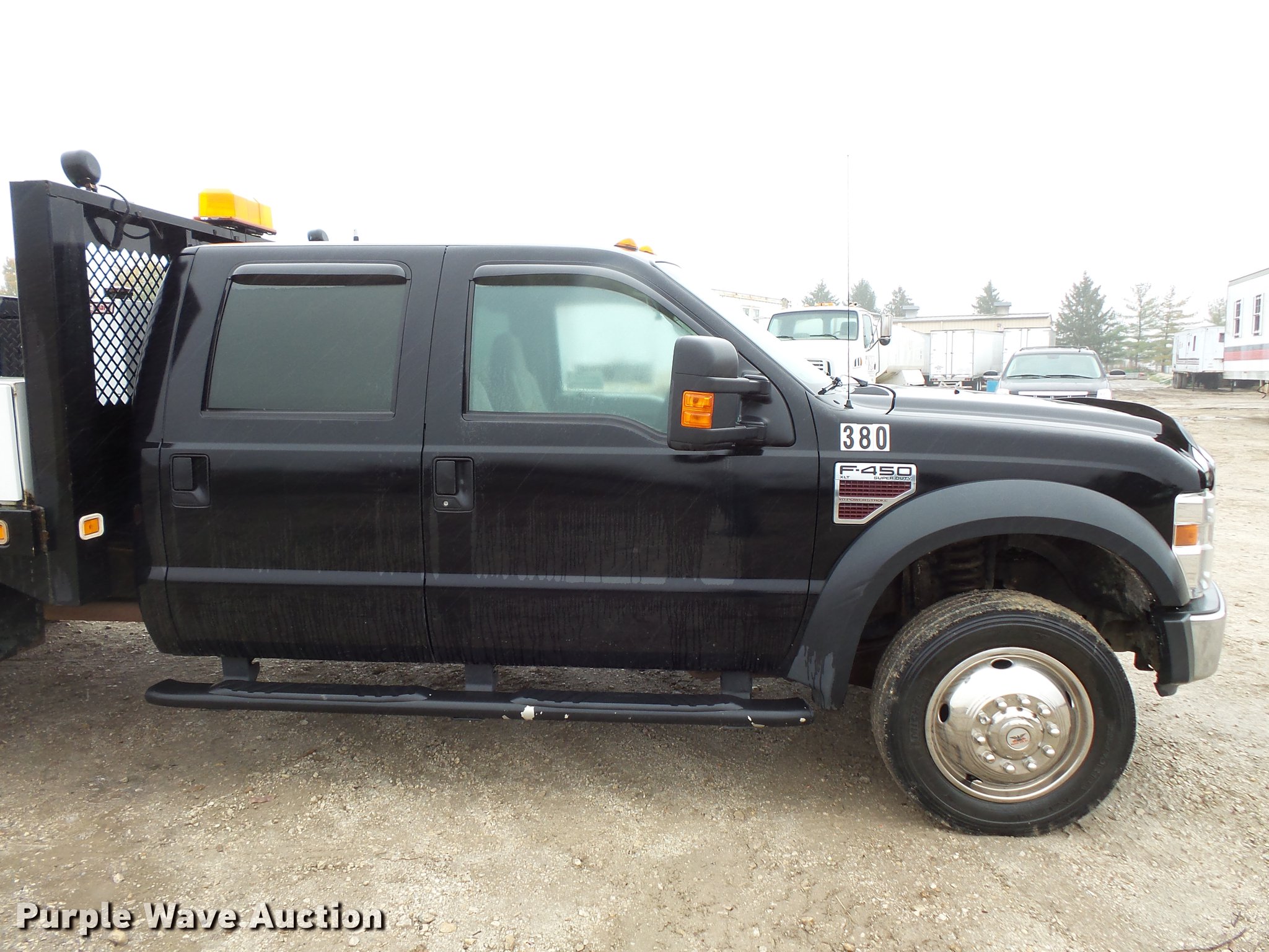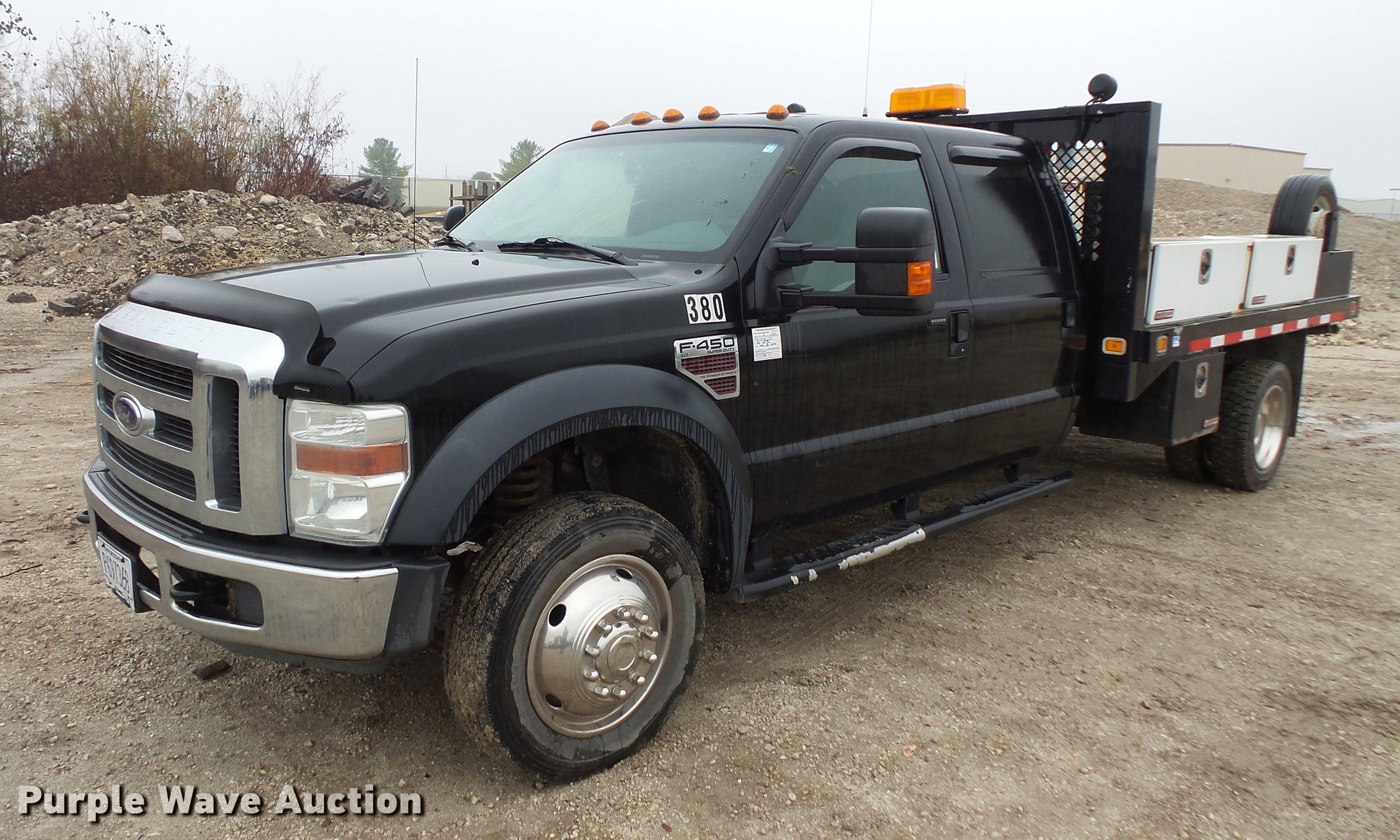 Purple Wave is selling a used Flat Bed Truck in Illinois. This item is a 2008 Ford F450 Super Duty Crew Cab flatbed pickup truck with the following: 211,543 miles on odometer, Miles will vary, unit in use, 6.4L V8 OHV 32V turbo diesel engine, Automatic transmission, AC and heat, Tilt, Cruise, AM/FM/CD, Power windows, locks, and mirrors, Cloth interior, Knapheide PUMXT-1336 flatbed, 11'3"L x 94"W, (2) under mount toolboxes, (2) side toolboxes, Auxiliary fuel tank, Beacon light, Running boards, Front tow hooks, Receiver hitch, Trailer wiring, 225/70R19.5 tires, No rear view mirror, Unit# 380