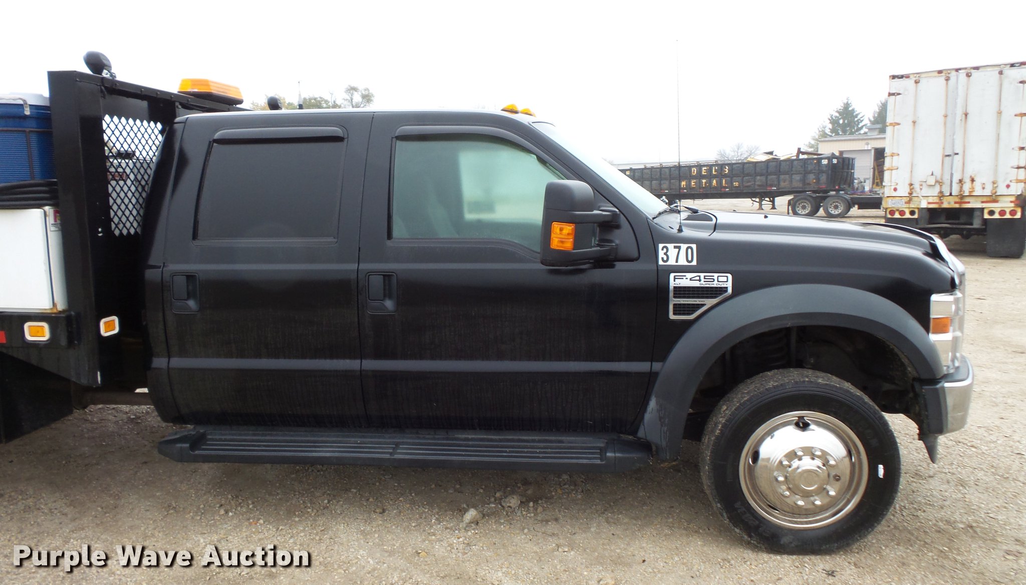 Purple Wave is selling a used Flat Bed Truck in Illinois. This item is a 2010 Ford F450 Super Duty Crew Cab flatbed truck with the following: 116,064 miles on odometer, 6.8L V10 SOHC 30V gas engine, Automatic transmission, AC and heat, Tilt, Cruise, AM/FM/CD, Power windows, locks, mirrors, and seats, Cloth interior, Knapheide PVNXT-113C flatbed, 11'3"L x 97"W, (2) under mounted toolboxes, (2) side mounted toolboxes, Auxiliary fuel tank, Beacon light, Work lights, Running boards, Front tow hooks, Receiver hitch, Trailer wiring, 225/70R19.5 tires, Unit# 370