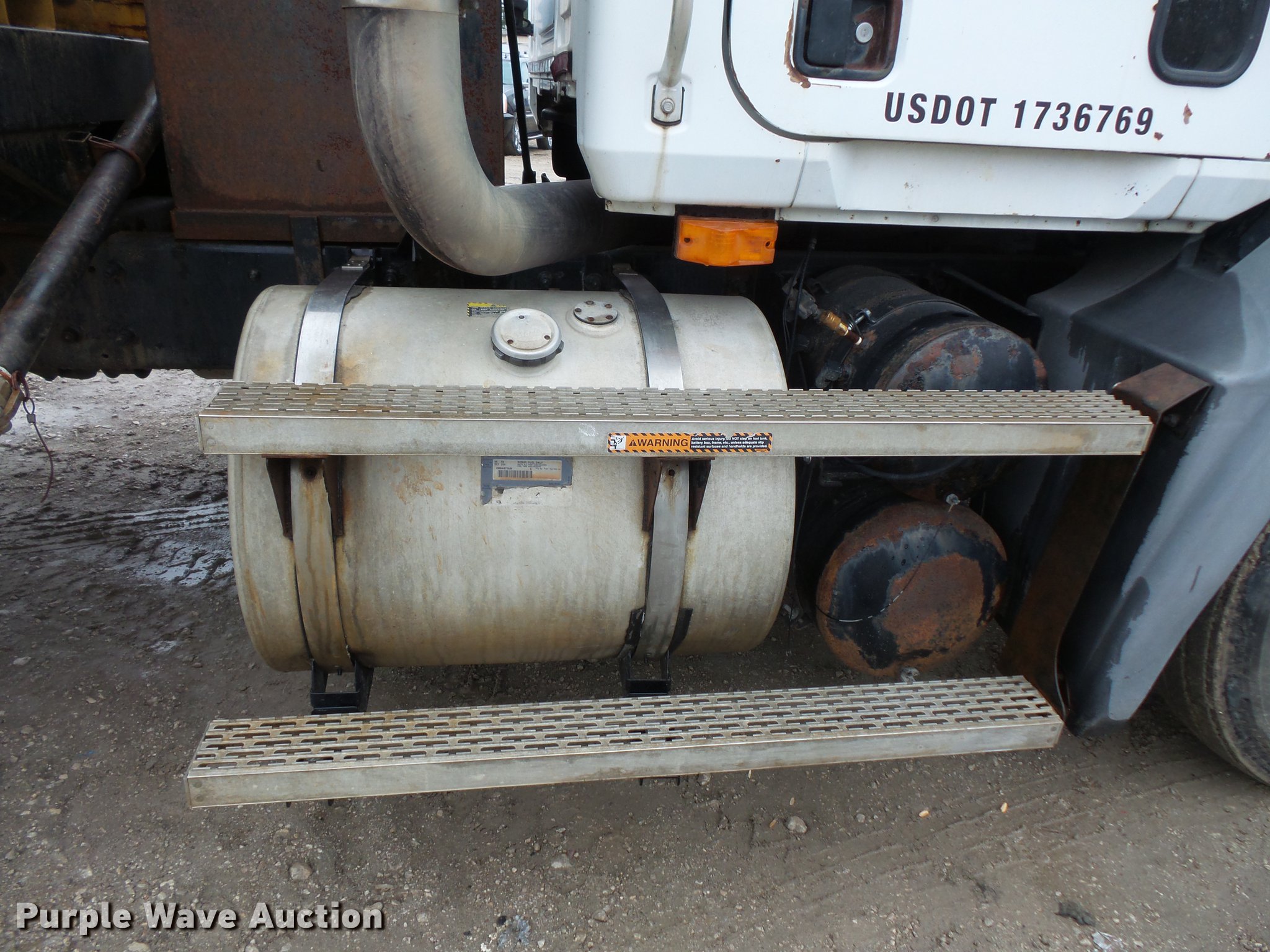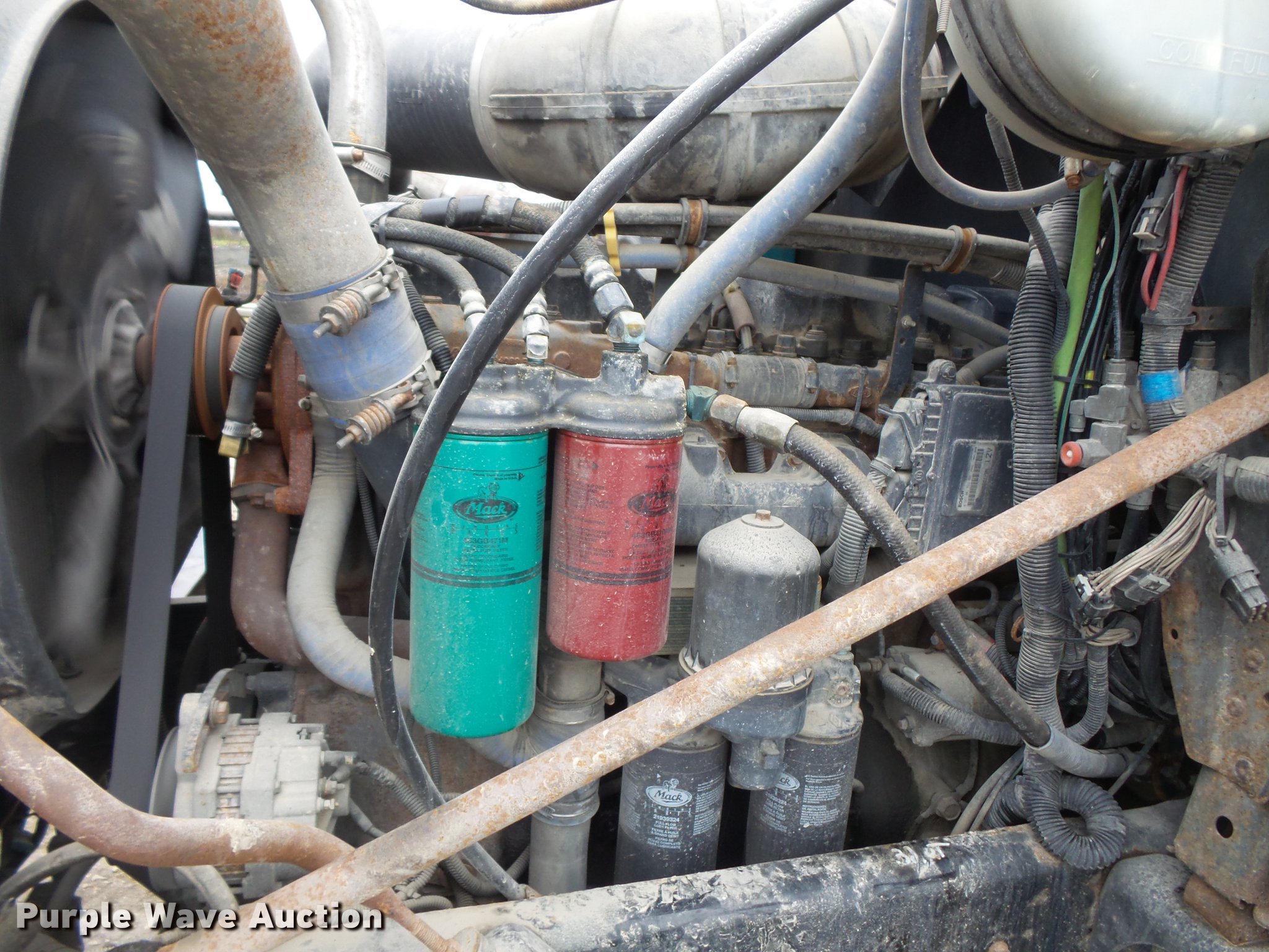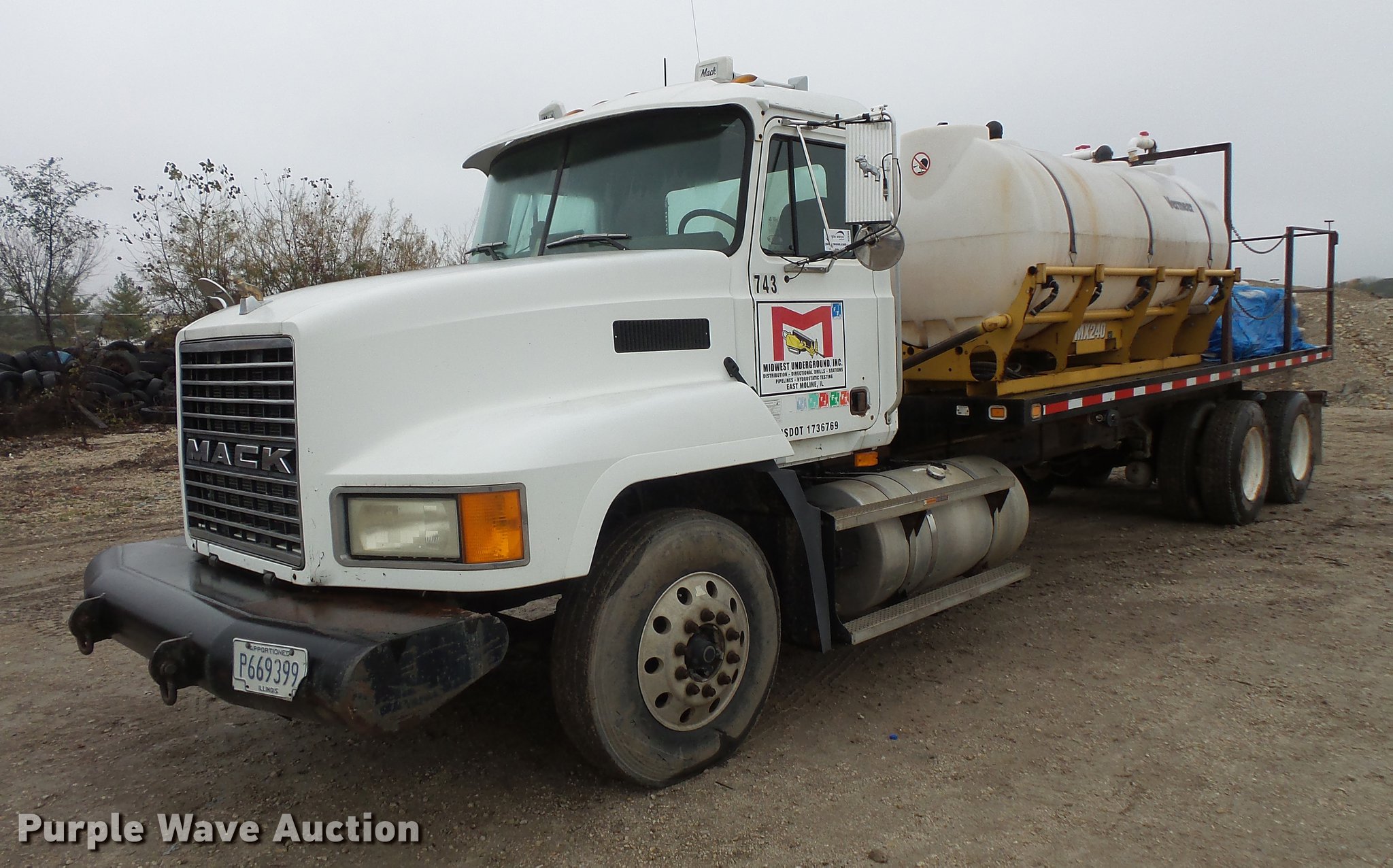 Purple Wave is selling a used Flat Bed Truck in Illinois. This item is a 2002 Mack CH613 flatbed truck with mud mixer with the following: 359,176 miles on odometer, Mack E7 12.0L L6 turbo diesel engine, Serial 1J0305, Maxitorque nine speed manual transmission, Tandem axle, Inter-axle differential lock, AC, Tilt, Cruise, AM/FM/cassette, Air suspension seat, Air ride cab, Front tow hooks, Exterior visor, Dump valves, Knapheide GV-PUNXT-203C flatbed, 20'L x 8'W, Stake side pockets, 2009 Vermeer MX240 mud mixer system, 1,787 hours on meter, (2) poly tanks, 10'L, Hatz two cylinder diesel engine, 14.7 kW, Serial 0912108051229, Serial 0912108051233, 3" pump output, 16 gallon poly hopper, Single exhaust stack, Dual fuel tanks, Air suspension, Air brakes, 11R22.5 front tires, 295/75R22.5 rear tires, GVWR 50,000 lbs, FAWR 12,000 lbs, IAWR 19,000 lbs, RAWR 19,000 lbs, Unit# 743