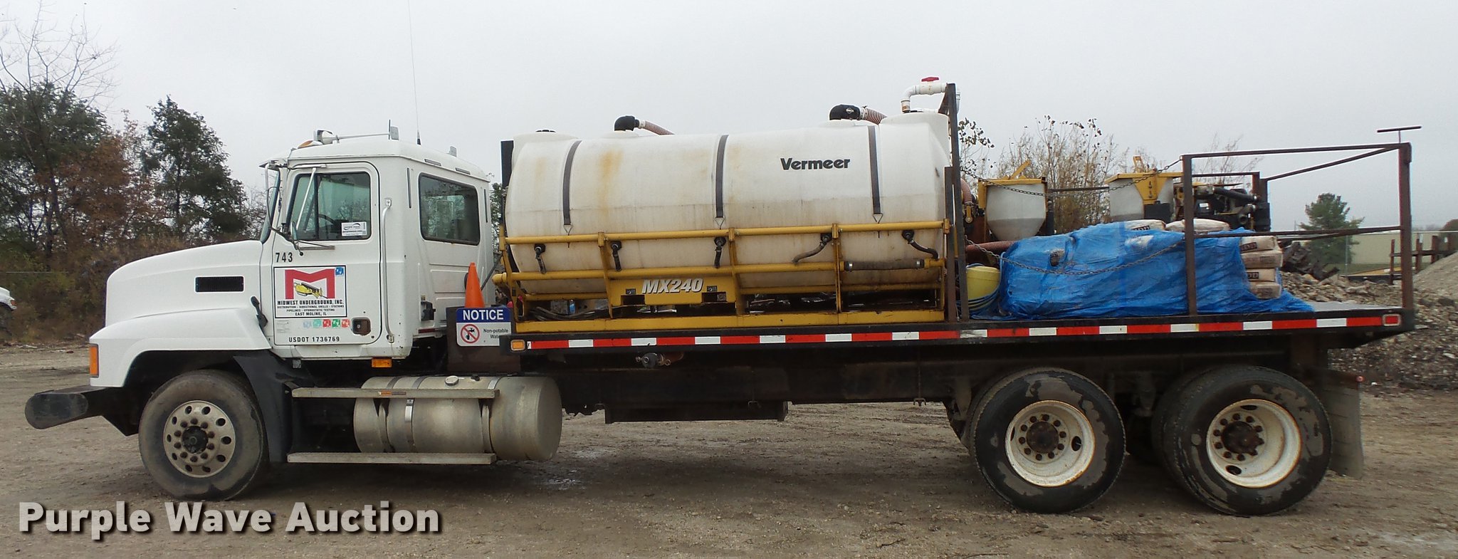 2002 Mack CH613 flatbed truck with mud mixer. 359,176 miles on odometer, Mack E7 12.0L L6 turbo diesel engine Serial 1J0305, Maxitorque nine speed manual transmission, Tandem axle, Inter-axle differential lock, AC, Tilt, Cruise, AM/FM/cassette, Air suspension seat, Air ride cab, Front tow hooks, Exterior visor, Dump valves, Knapheide GV-PUNXT-203C flatbed 20'L x 8'W, Stake side pockets, 2009 Vermeer MX240 mud mixer system 1,787 hours on meter, (2) poly tanks 10'L, Hatz two cylinder diesel engine 14.7 kW, Serial 0912108051229, Serial 0912108051233, 3" pump output, 16 gallon poly hopper, Single exhaust stack, Dual fuel tanks, Air suspension, Air brakes, 11R22.5 front tires, 295/75R22.5 rear tires, GVWR 50,000 lbs, FAWR 12,000 lbs, IAWR 19,000 lbs, RAWR 19,000 lbs, Unit# 743. Illinois title. 1M1AA18Y82W145420. Midwest Underground - Open inspection Dec. 28. 3150 5th Ave. East Moline, IL 61244