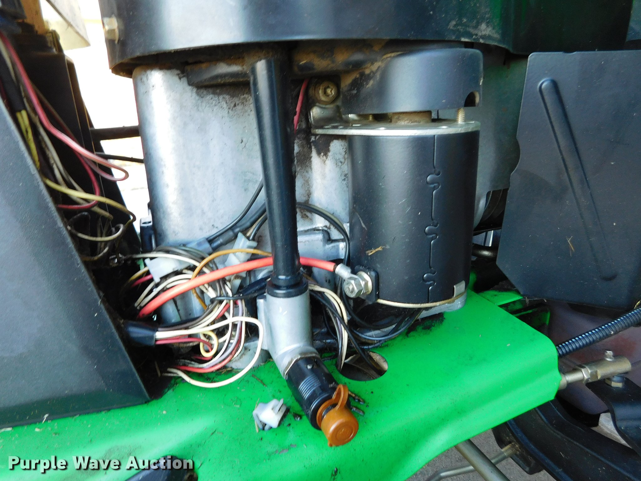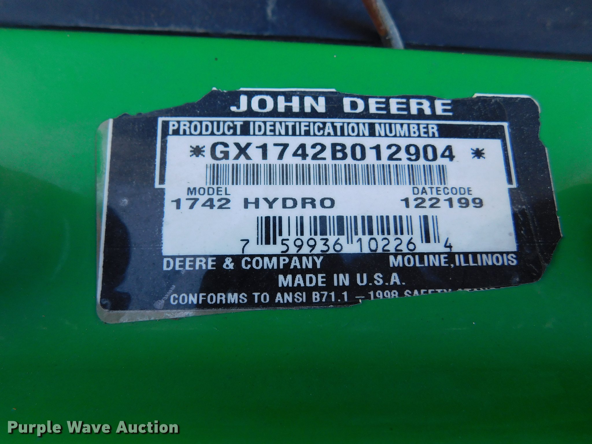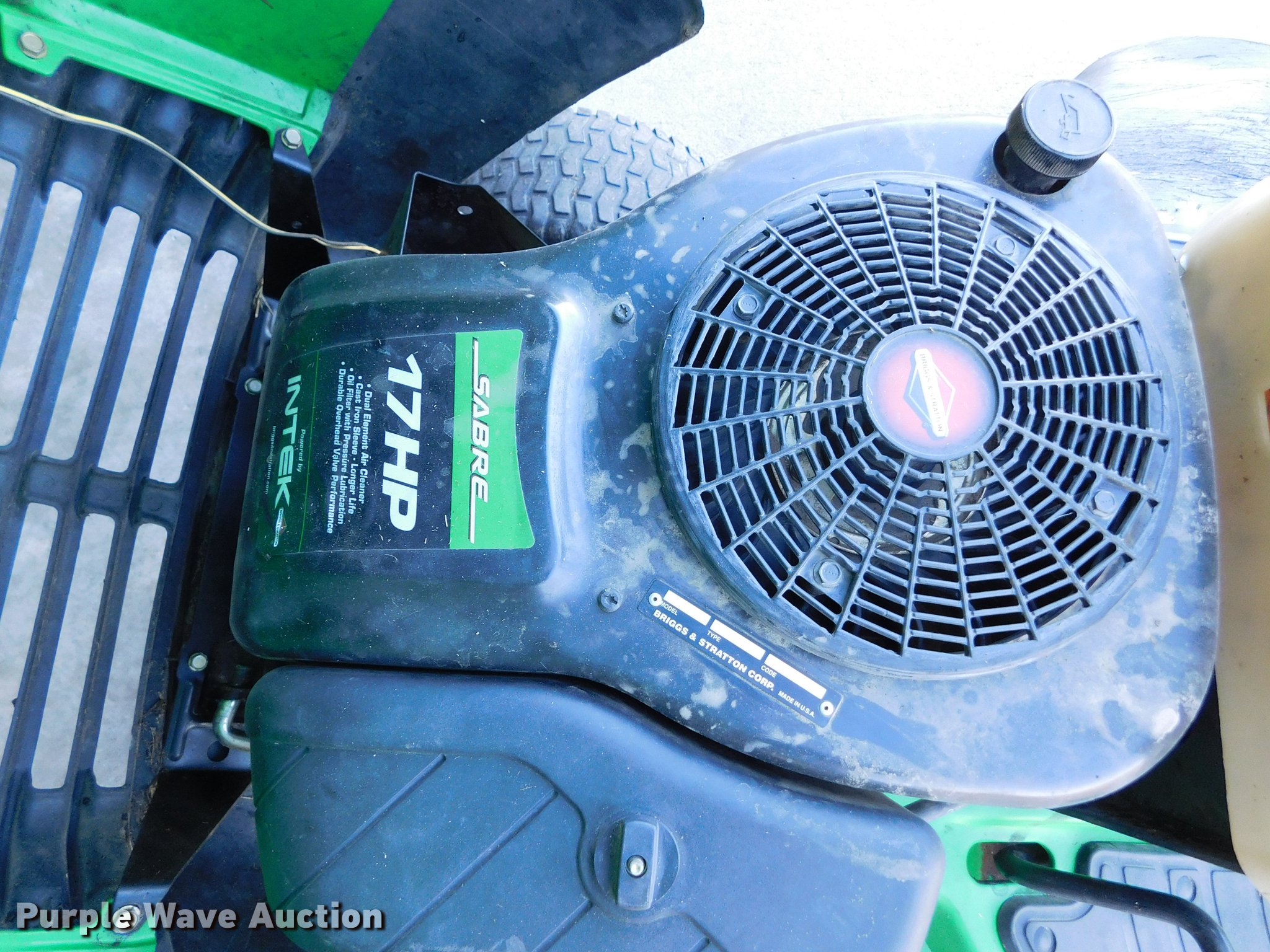 Purple Wave is selling a used Lawn Mower in Kansas. This item is a John Deere Sabre 1742 lawn mower with the following: 42"W cut, Briggs & Stratton single cylinder gas engine, Hydrostatic transmission, 13 x 6.00-6 front tires, 20 x 8.00-8 rear tires, Unknown operating condition, Serial GX1742B012904