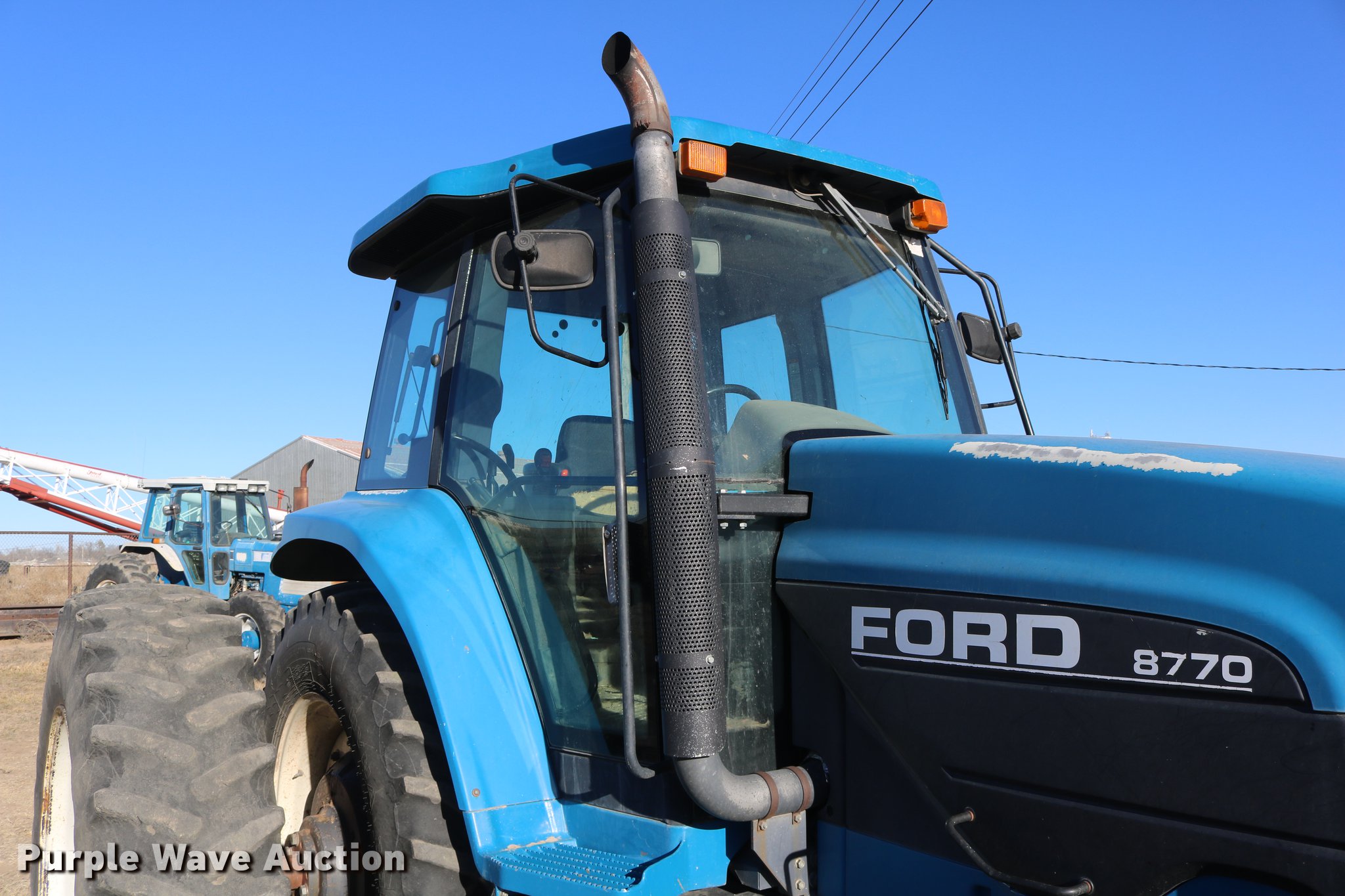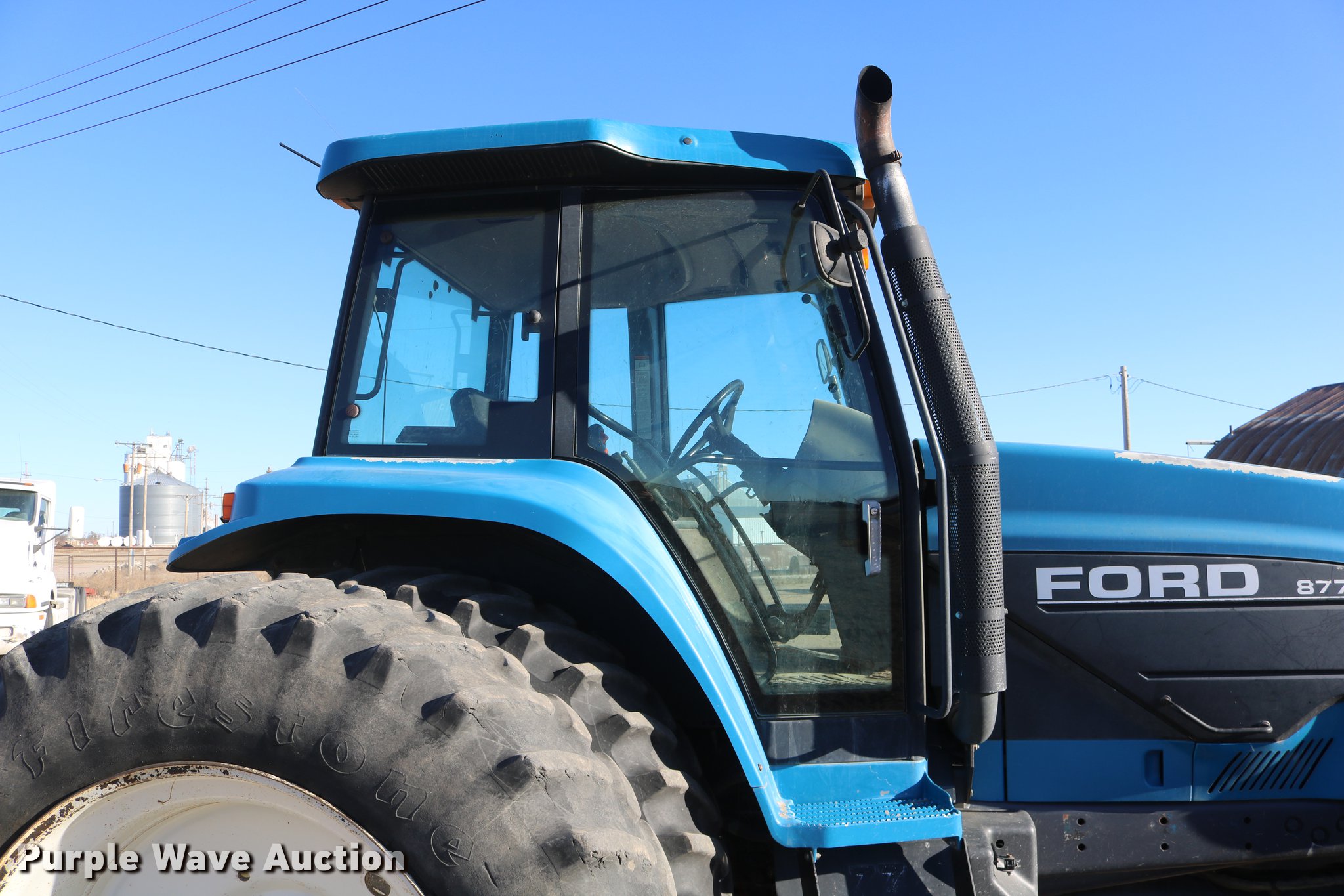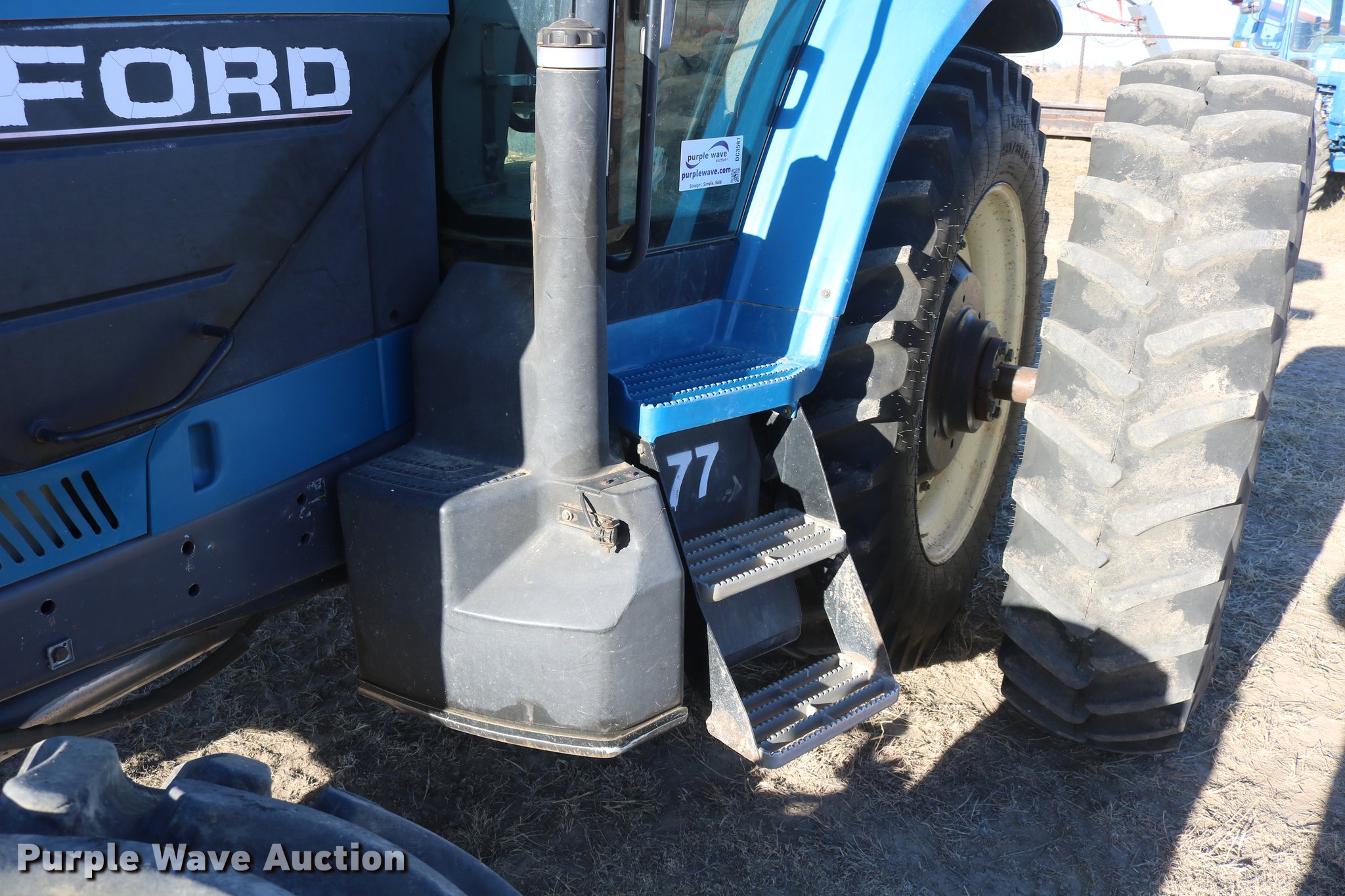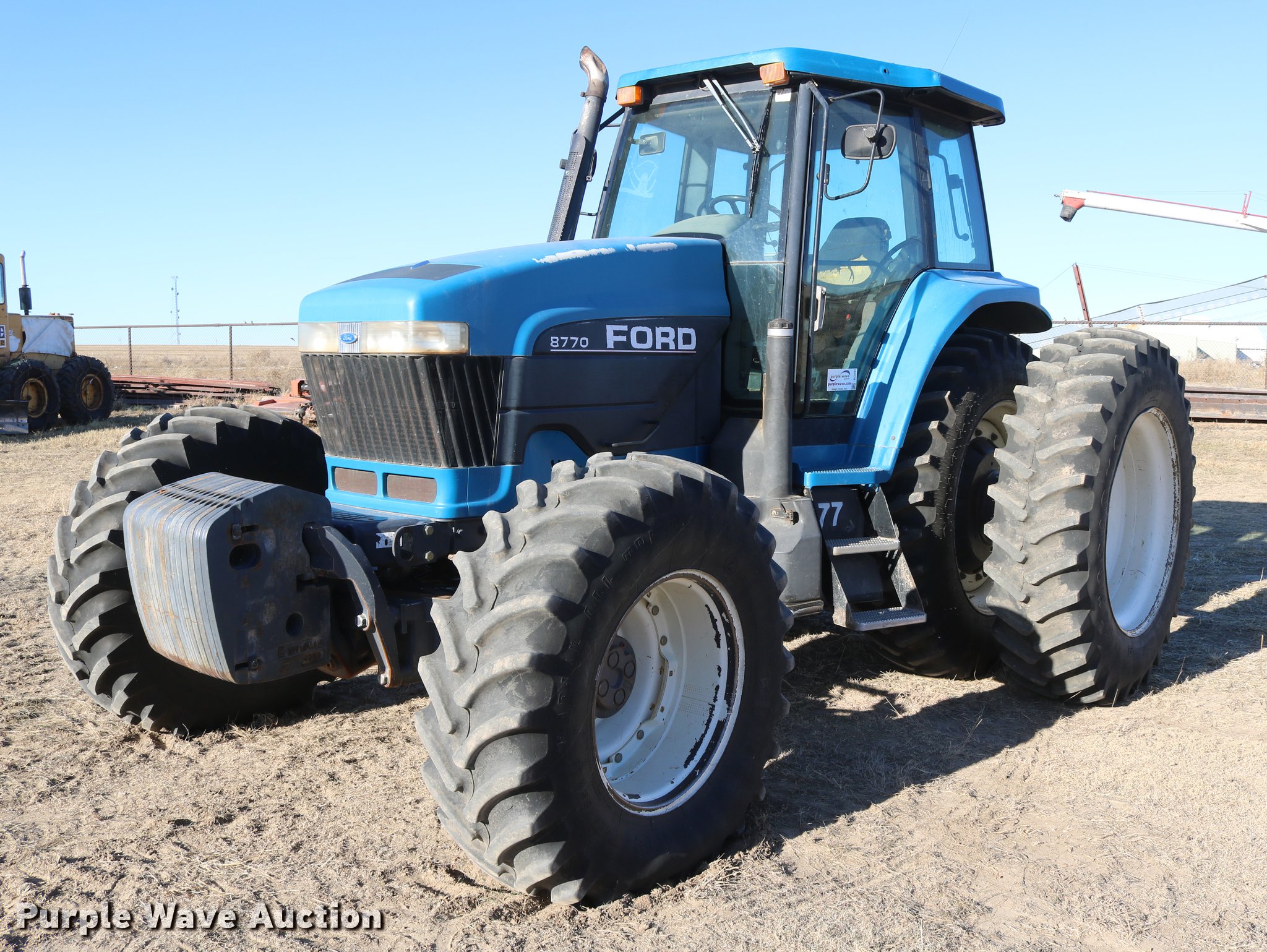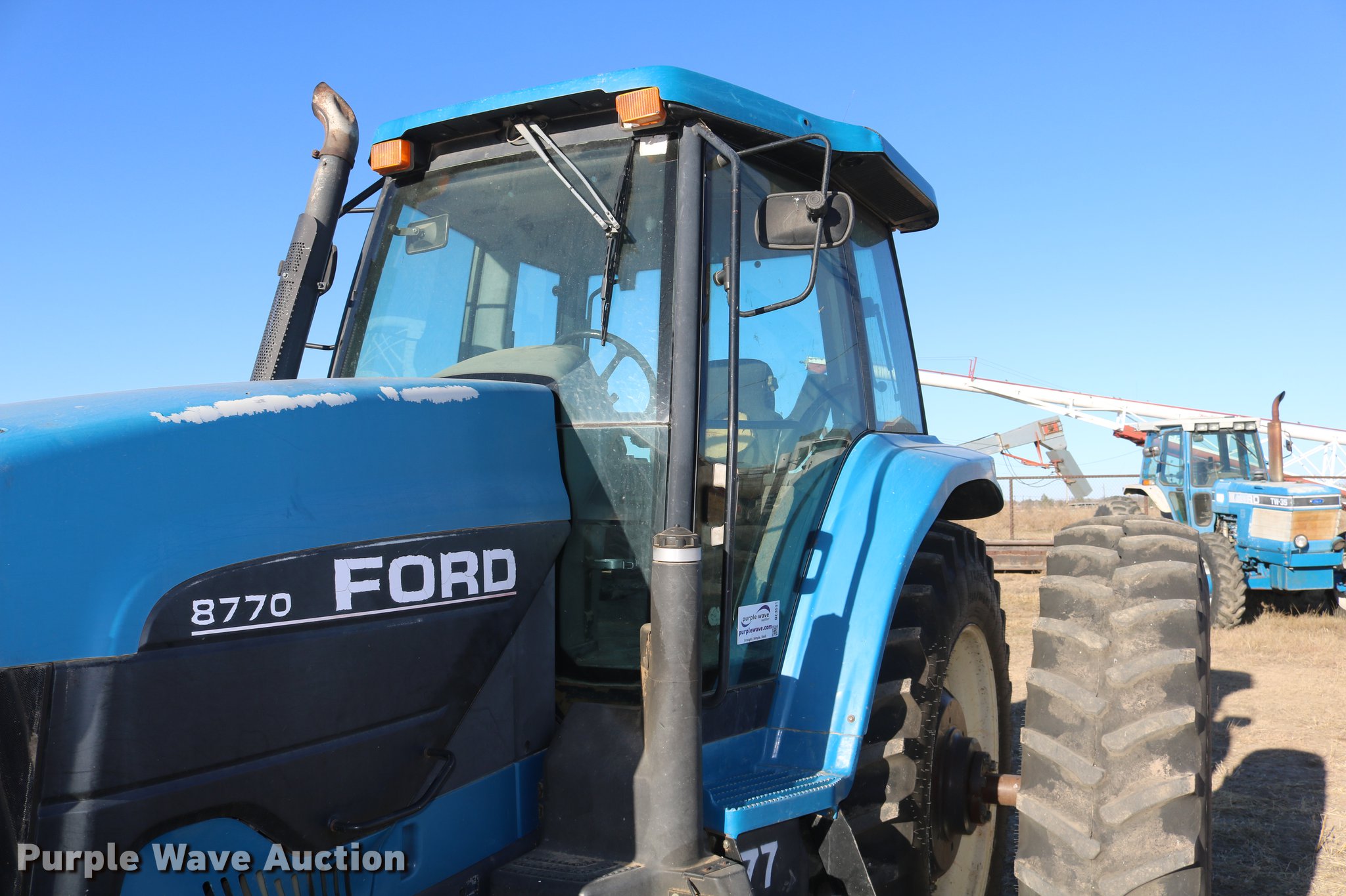 Purple Wave is selling a used Tractor in Kansas. This item is a 1994 Ford 8770 MFWD tractor with the following: 7,314 hours on meter, Ford six cylinder turbo diesel engine, Powershift transmission, 16F-11R gears, Differential lock, AC and heat, AM/FM, Air suspension seat, Tilt steering wheel, Block heater, Three point, Top link, 1000 PTO, Seven pin outlet, Super steer front end, (3) rear hydraulic remote sets, (17) suitcase weights, 420/85R28 front tires, 480/80R42 dual rear tires, Outside dual tire cracked, Serial D402704FORD8770, Unit# 77