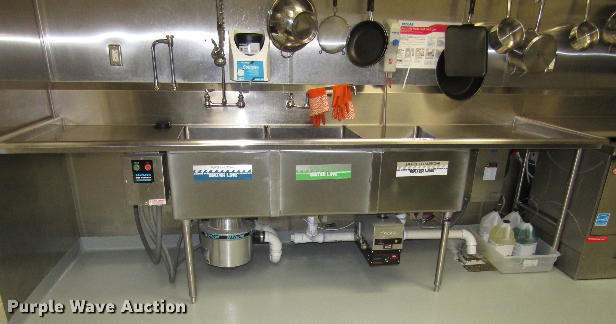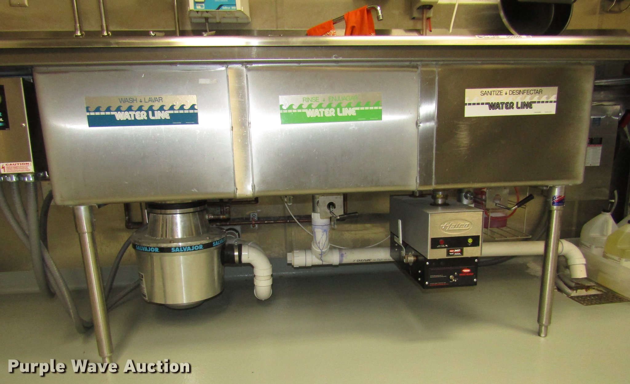 Purple Wave is selling a used Restaurant Equip. in Nebraska. This item is a Stainless steel triple sink and table with the following: 10'W x 36"D x 45"H overall, (3) 20"W x 14"D x 30"L sinks, 60"W x 25"D x 36"H stainless steel table, Hatco 3CS-9 water heater, 208V, Single or three phase, Serial 8549511627, Faucets and drain pipe not included, Dishwashers not included