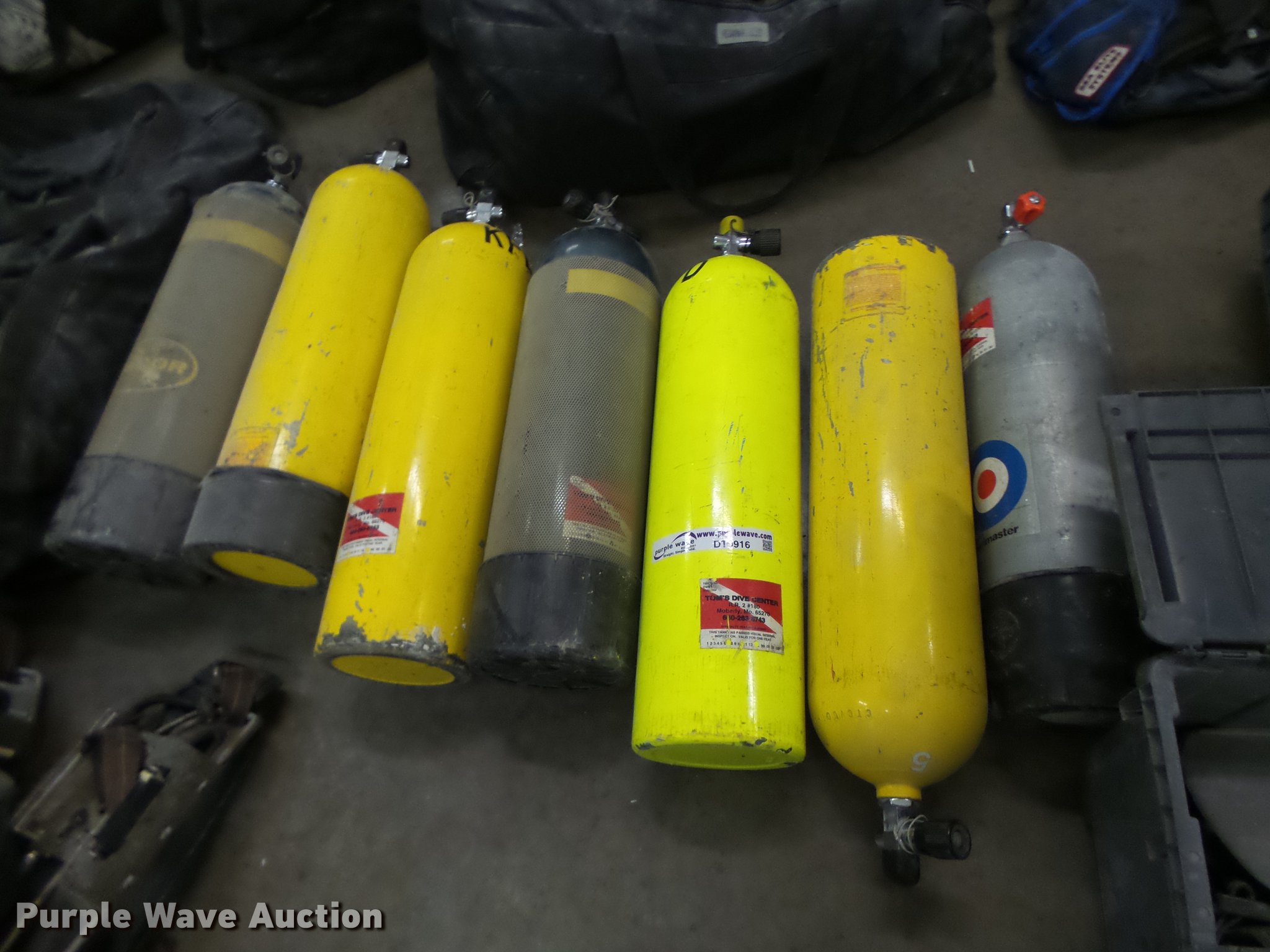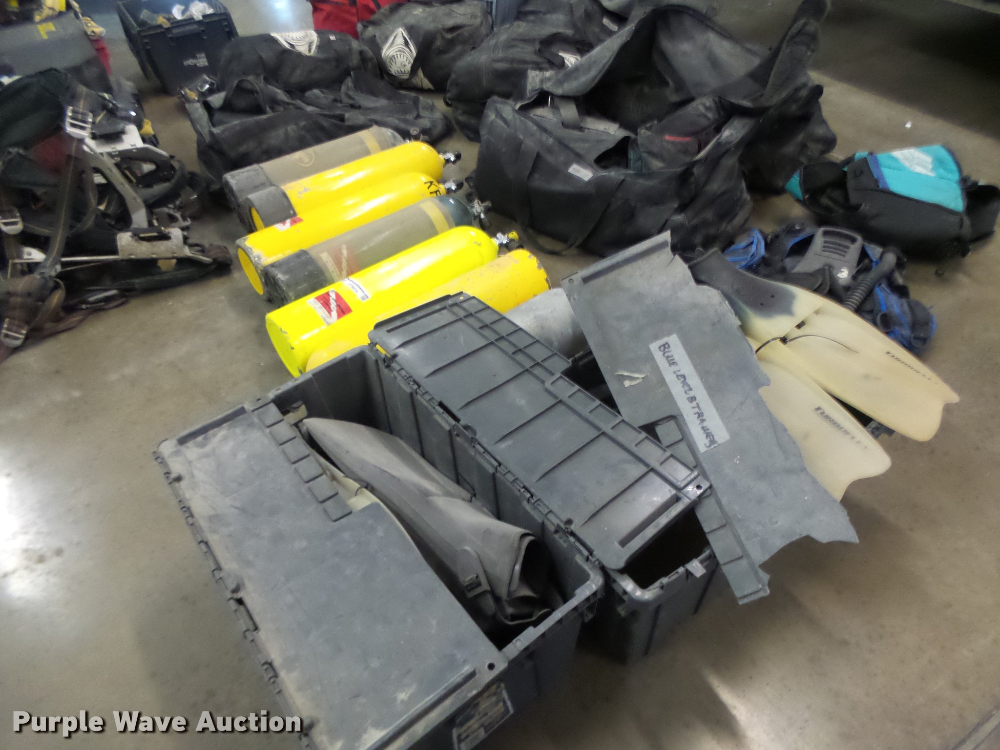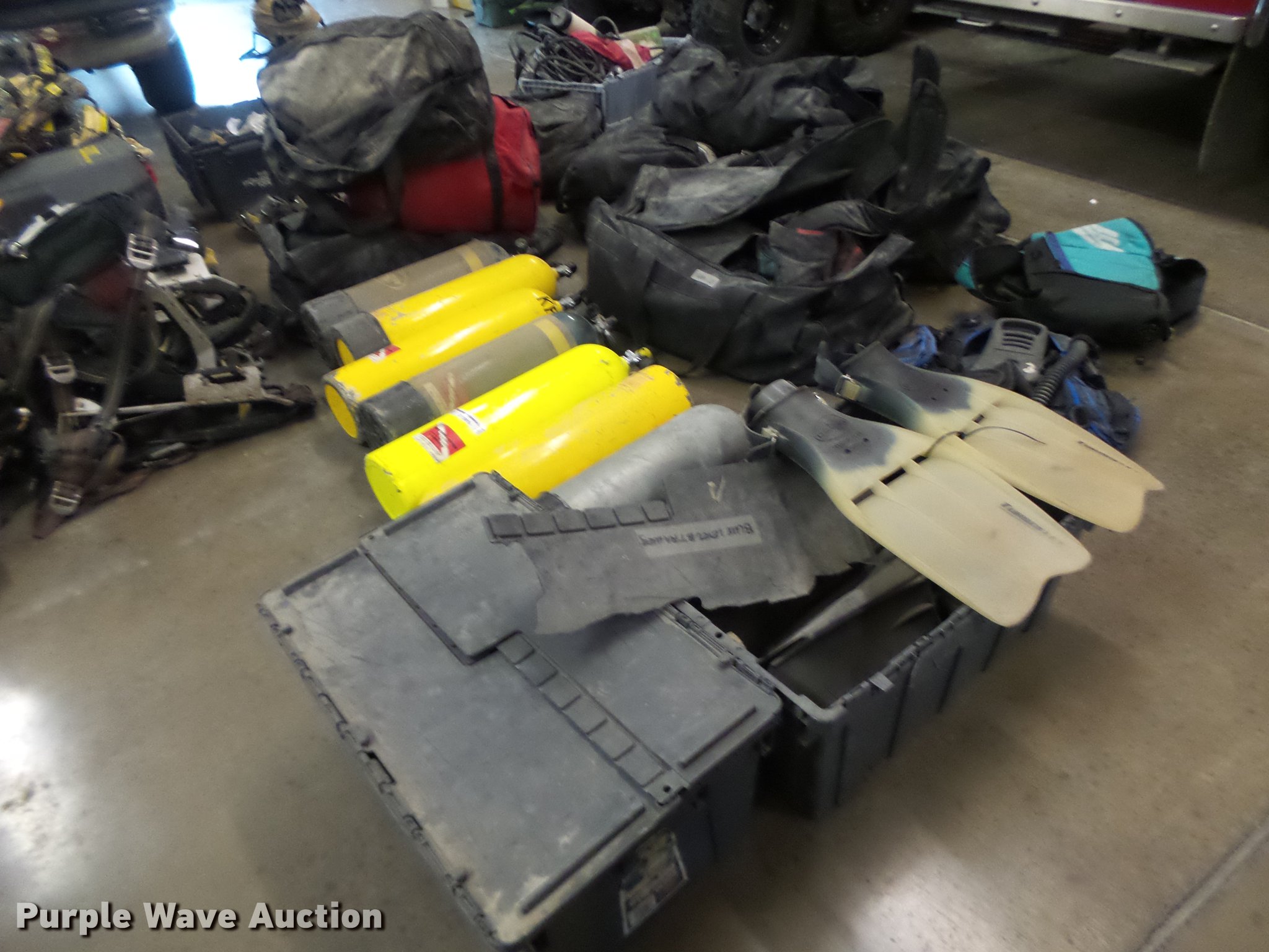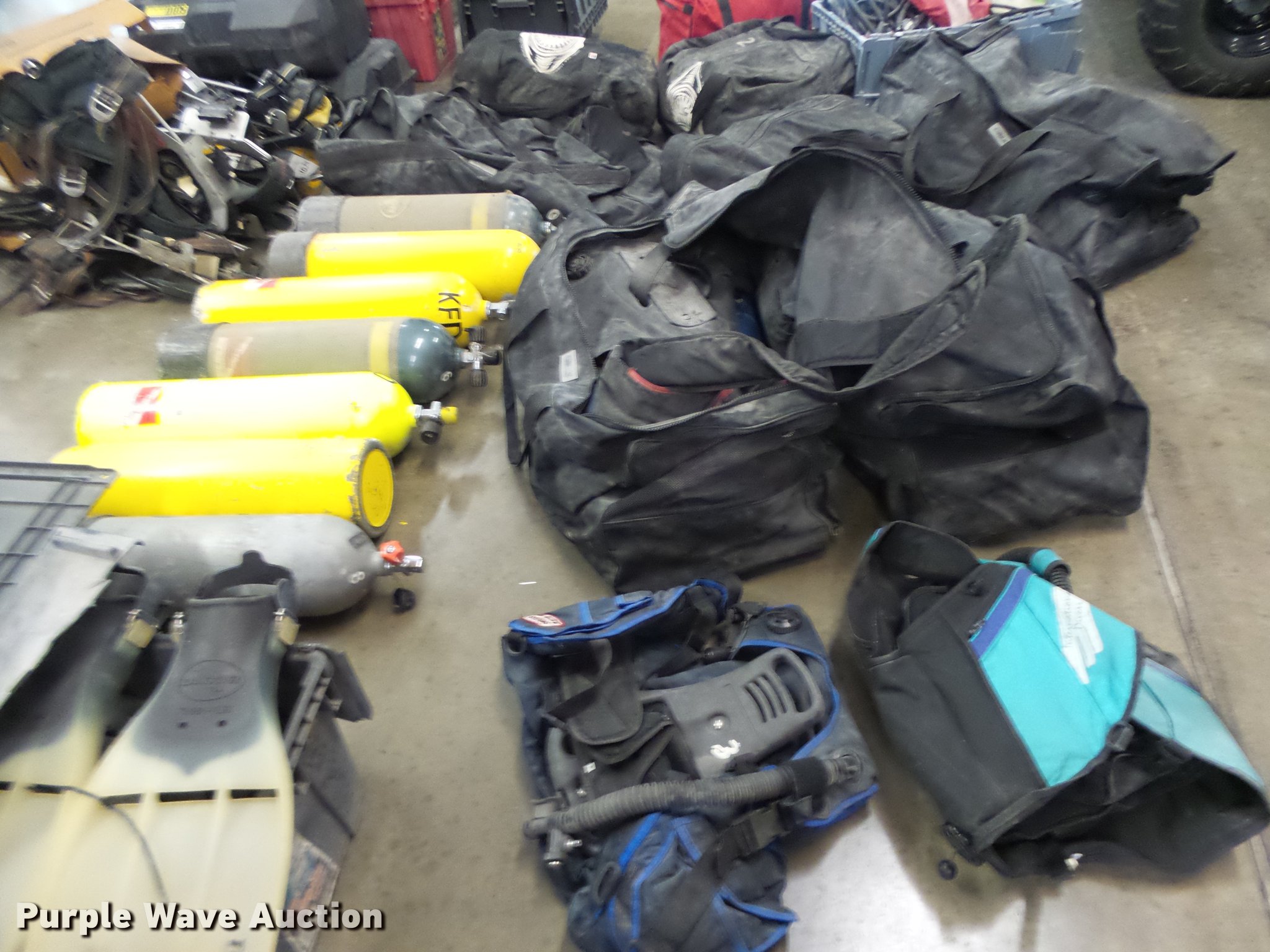Purple Wave is selling a used Sporting Goods in Missouri. This item is a Scuba diving equipment with the following: Approx. 7 units, Tanks, Buoyancy compensators, Regulators, Fins, Masks, Snorkels, Wet and dry suits, Equipment bags