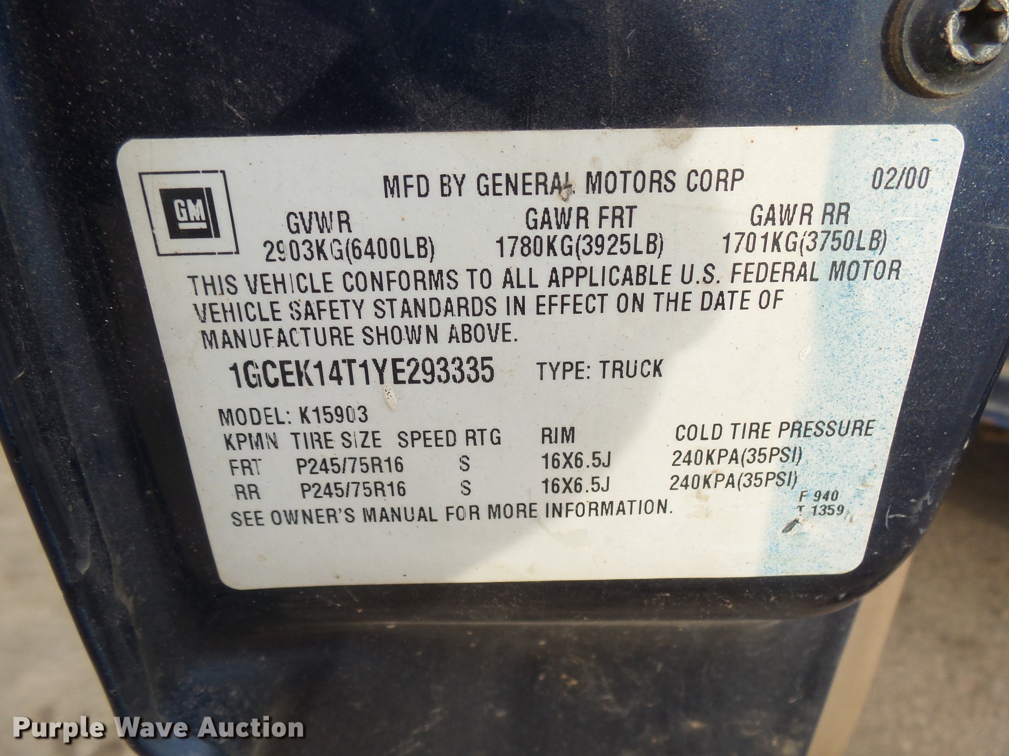 Purple Wave is selling a used 1/2 Ton Pickup or Van in South Dakota. This item is a 2000 Chevrolet Silverado 1500 pickup truck with the following: 145,446 miles on odometer, 5.3L V8 OHV 16V gas engine, Automatic transmission, Four wheel drive, AC and heat, Tilt, Cruise, AM/FM, Vinyl interior, Front tow hook, Receiver hitch, Firestone LT245/75R16 tires