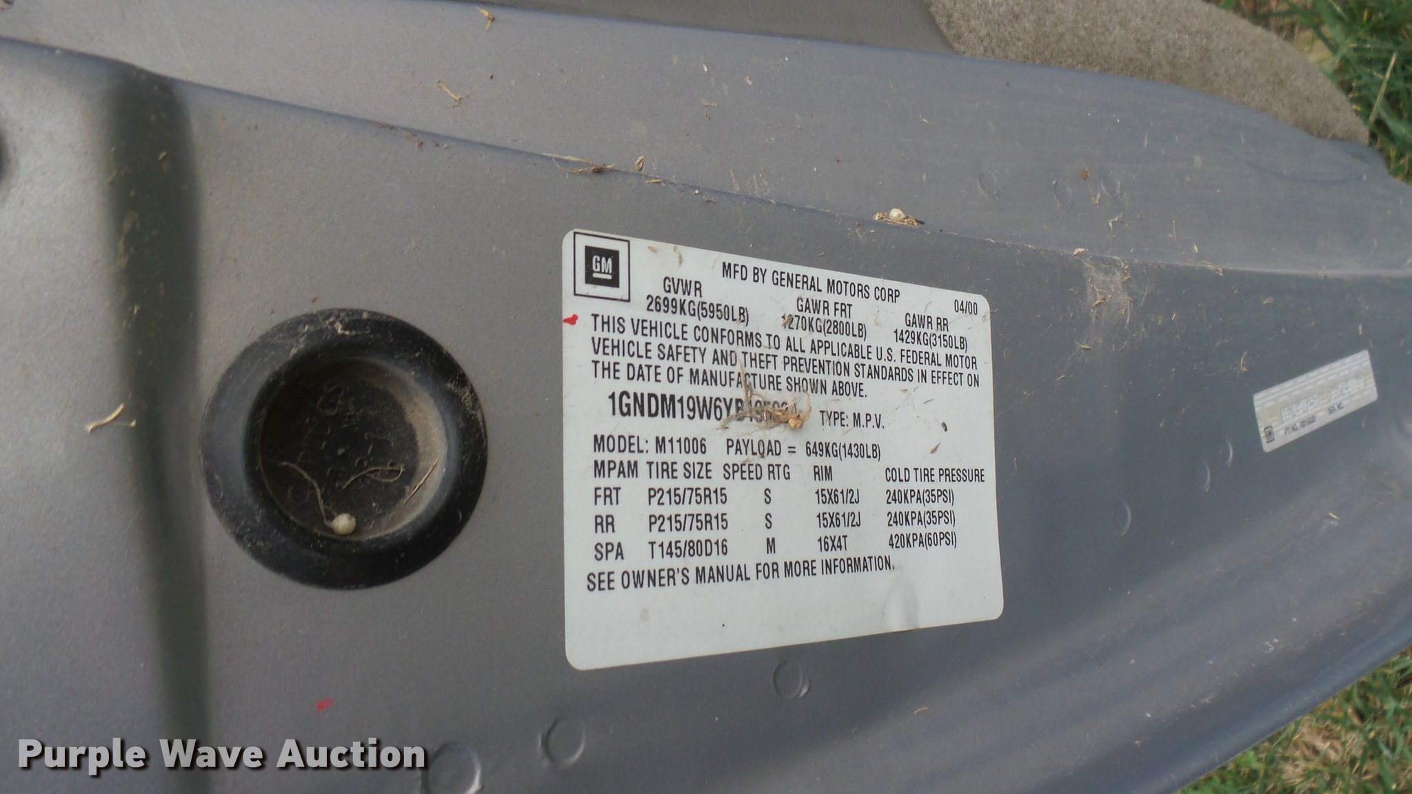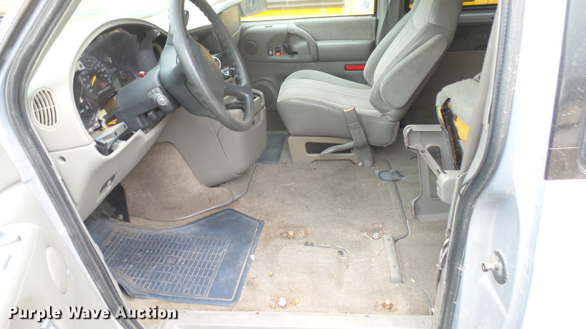 Purple Wave is selling a used Passenger Vehicle in Kansas. This item is a 2000 Chevrolet Astro van with the following: Unknown miles on odometer, 4.3L V6 OHV 12V gas engine, Automatic transmission, AM/FM/CD, Power windows and locks, Cloth interior, 215/75R15 tires, No battery, Seats missing, Cracked windshield, Engine parts missing, Parts missing, Non-operational unit
