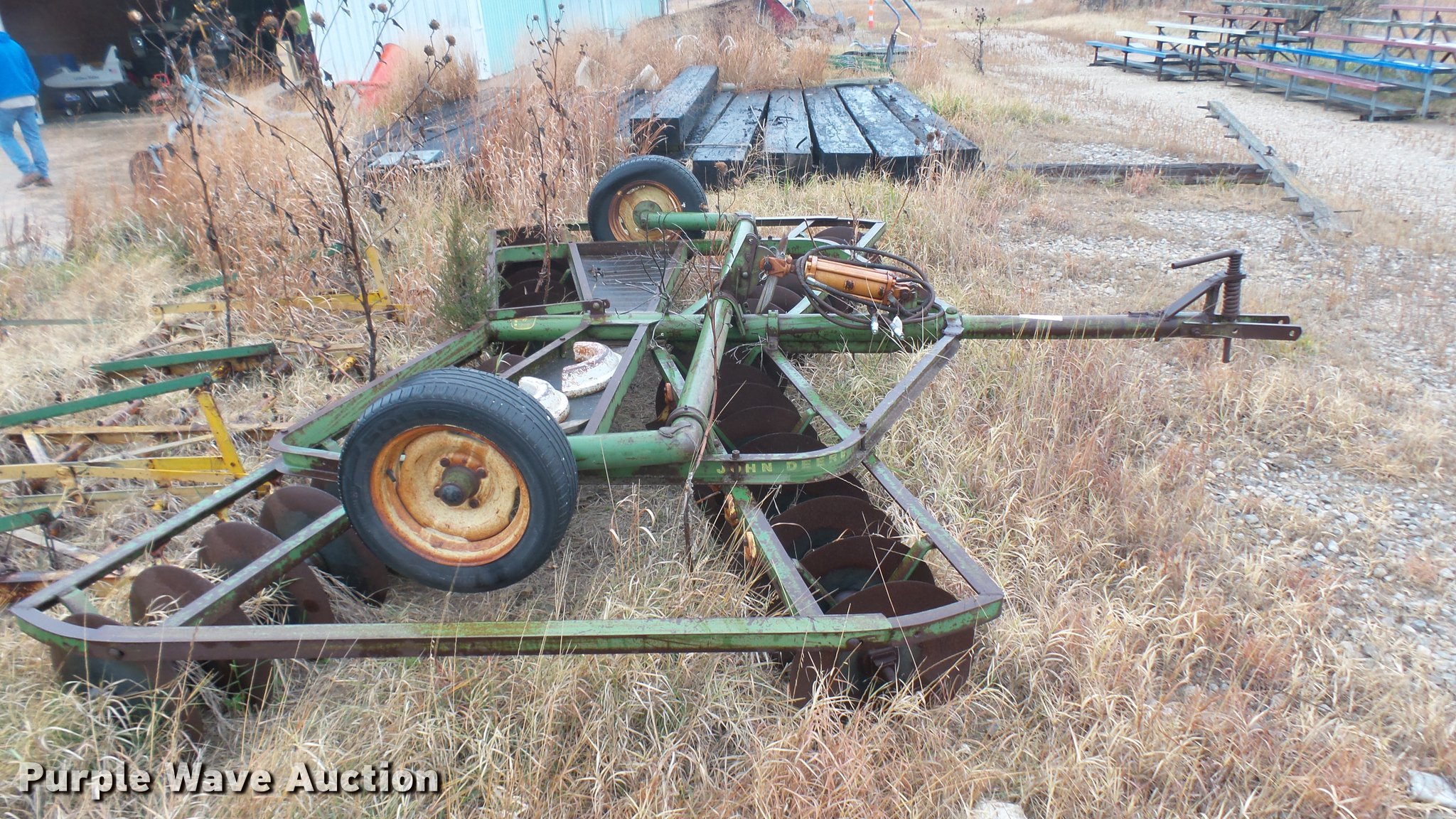 Purple Wave is selling a used Disk in Kansas. This item is a John Deere disk with the following: 13'W, 17" disks, Hydraulic lift, Pin hitch