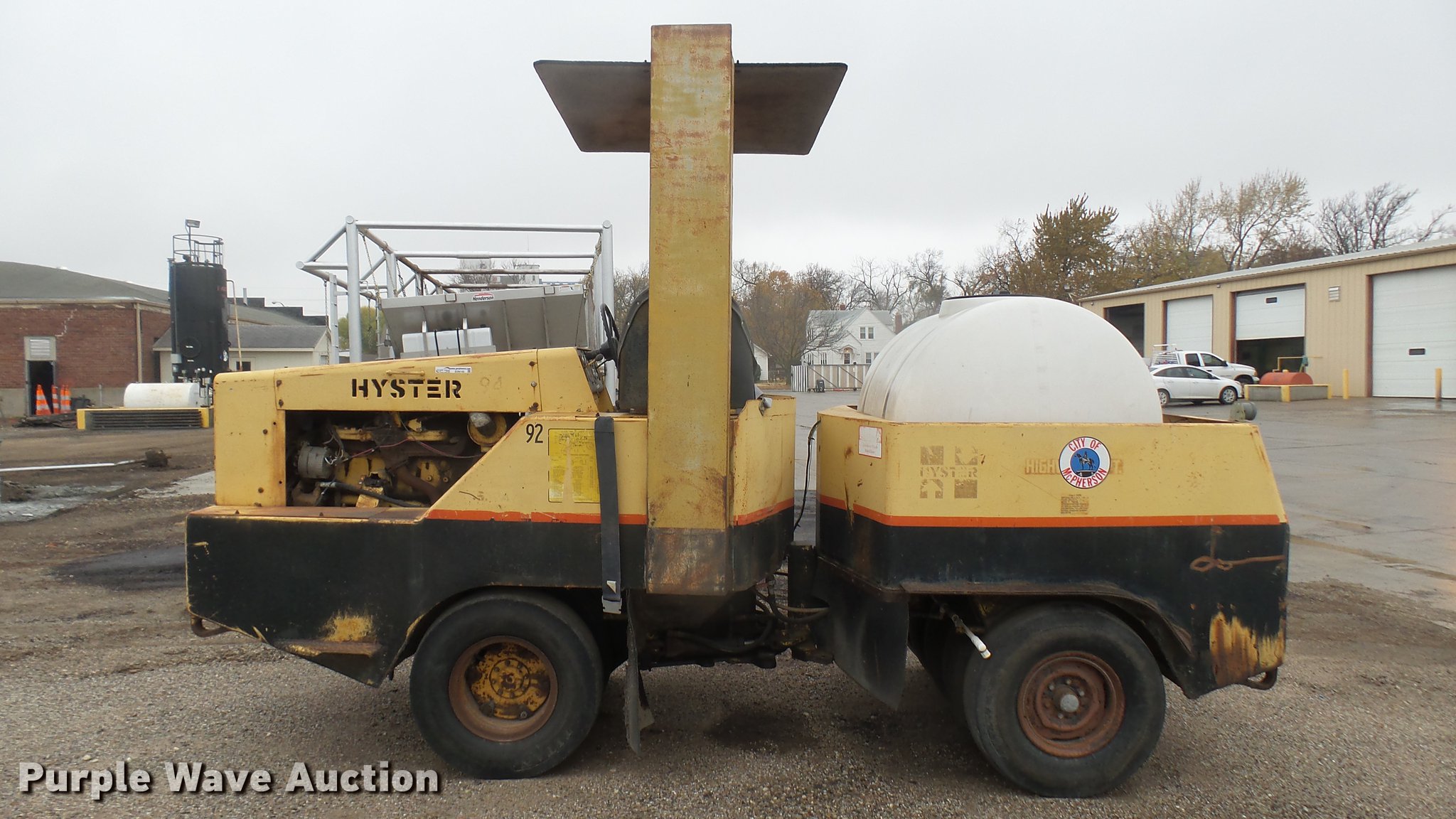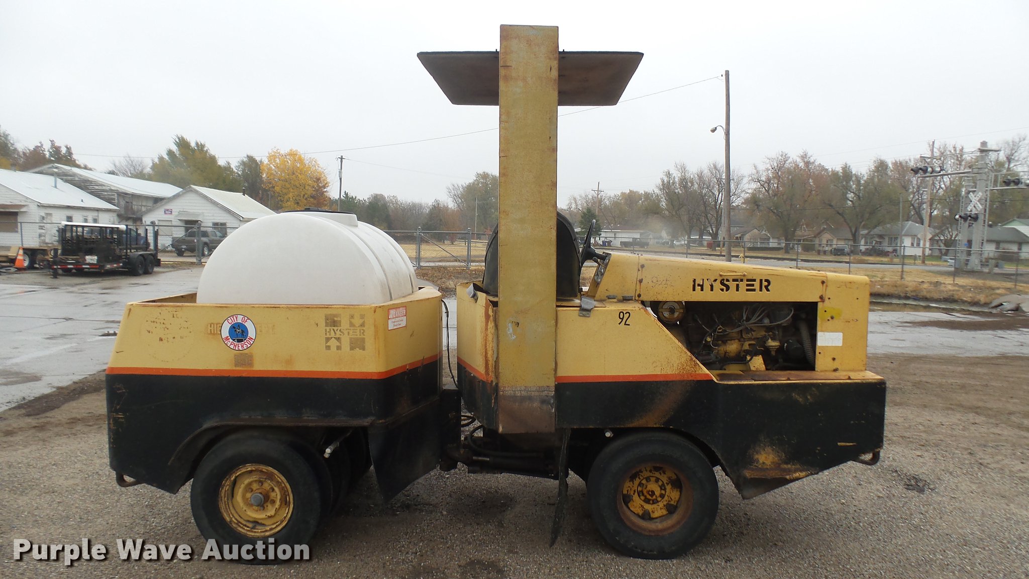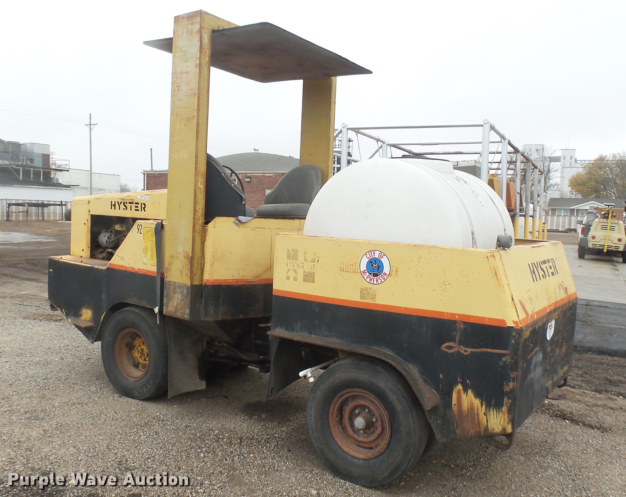 Hyster pneumatic roller. 1,408 hours on meter, Four cylinder gas engine, Three speed transmission, Canopy, 45" work width, Poly tank 335 gallon capacity, Boom, (8) 7.50-15 tires, Transmission issues. City of McPherson. McPherson, KS 67460