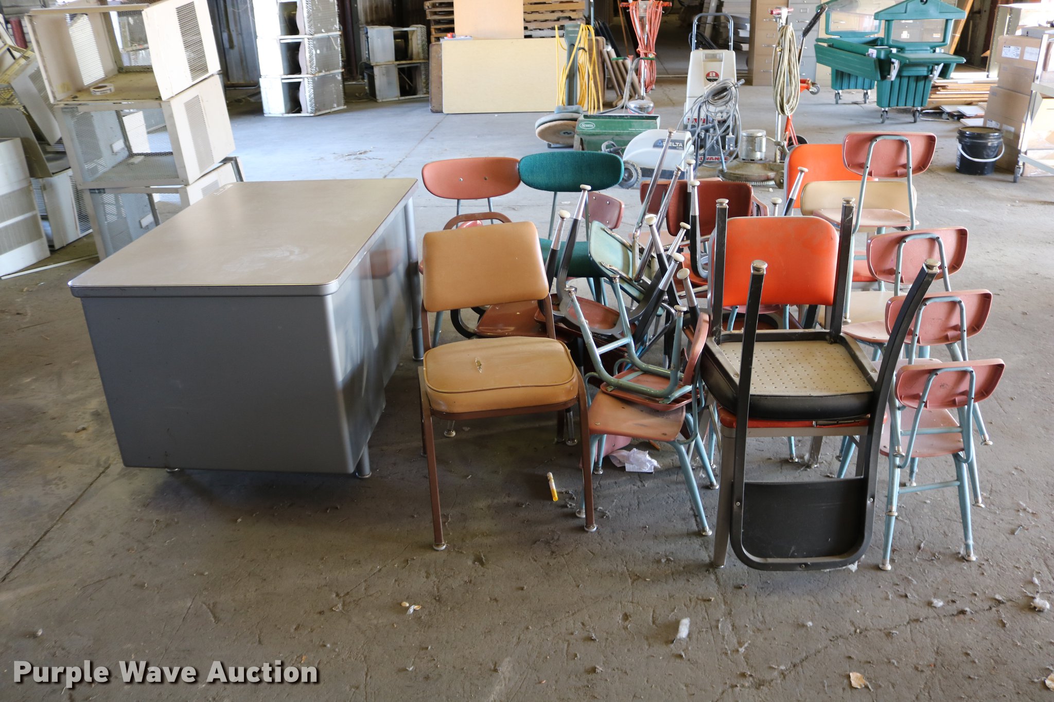 Furniture. Desk 45.5"L x 30 1/4"W x 29"H, (23) chairs. Storage Building. 1500 N Mulberry St. Abilene, KS 67410