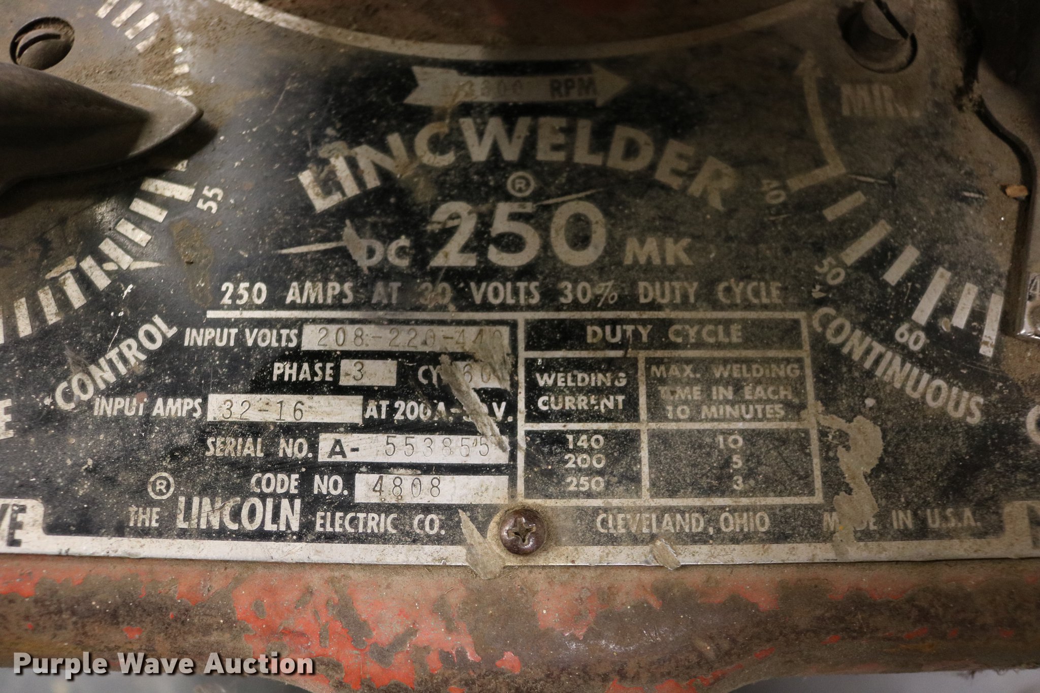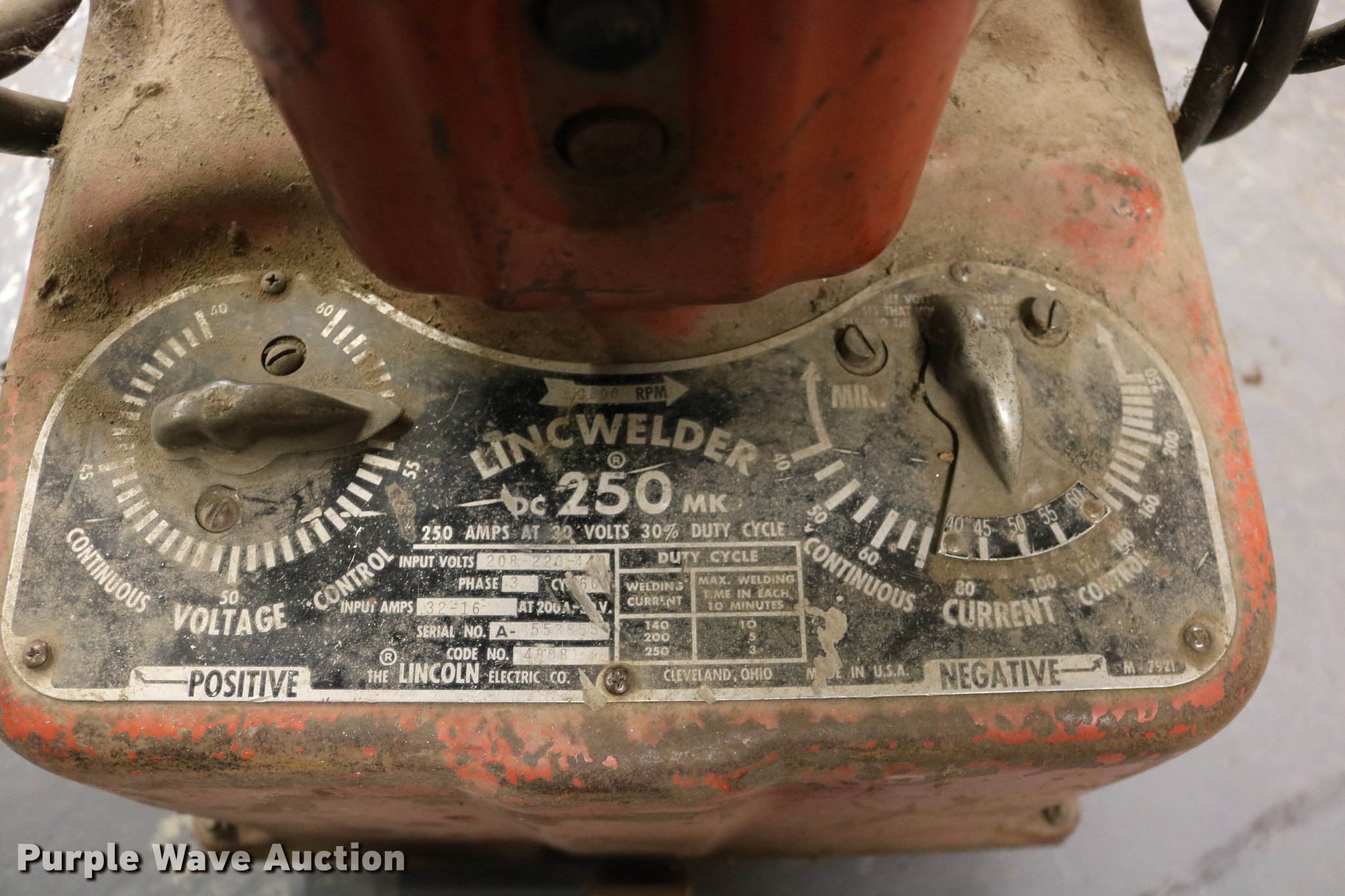 Purple Wave is selling a used Welder (Manual) in Kansas. This item is a Lincoln Lincwelder DC 250MK welder with the following: Three phase, No lead, Serial A-553855