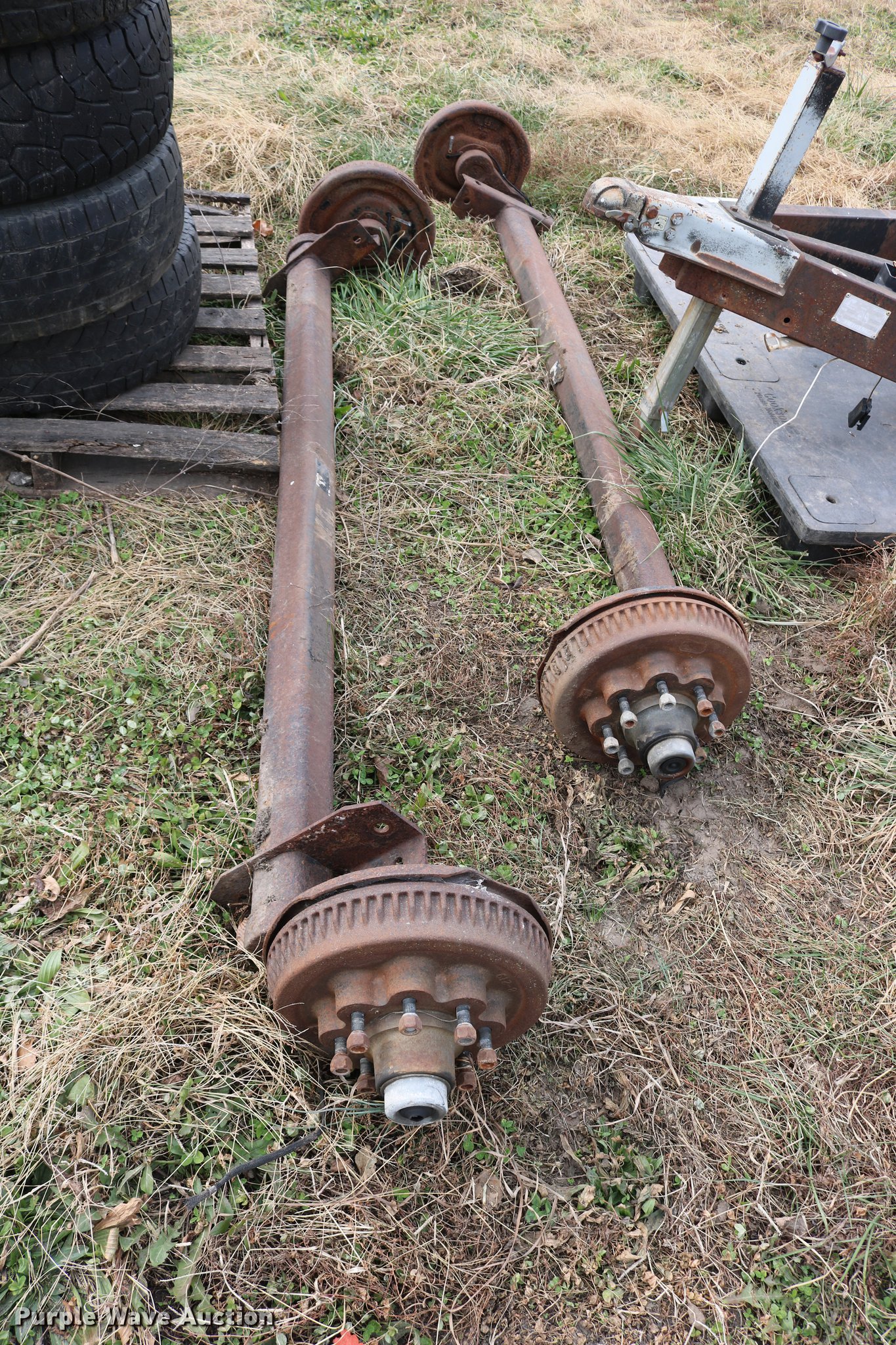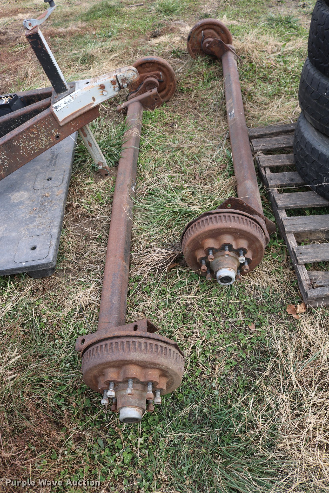 Pace. Trailer parts. Pace trailer tongue, Single leg landing gear, 2 5/16" ball hitch, (2) torsion axles 67.5" between brackets on axles, Eight lug, Leaf springs, Unknown operating condition. 1100 Orange St. Baldwin City, KS 66006