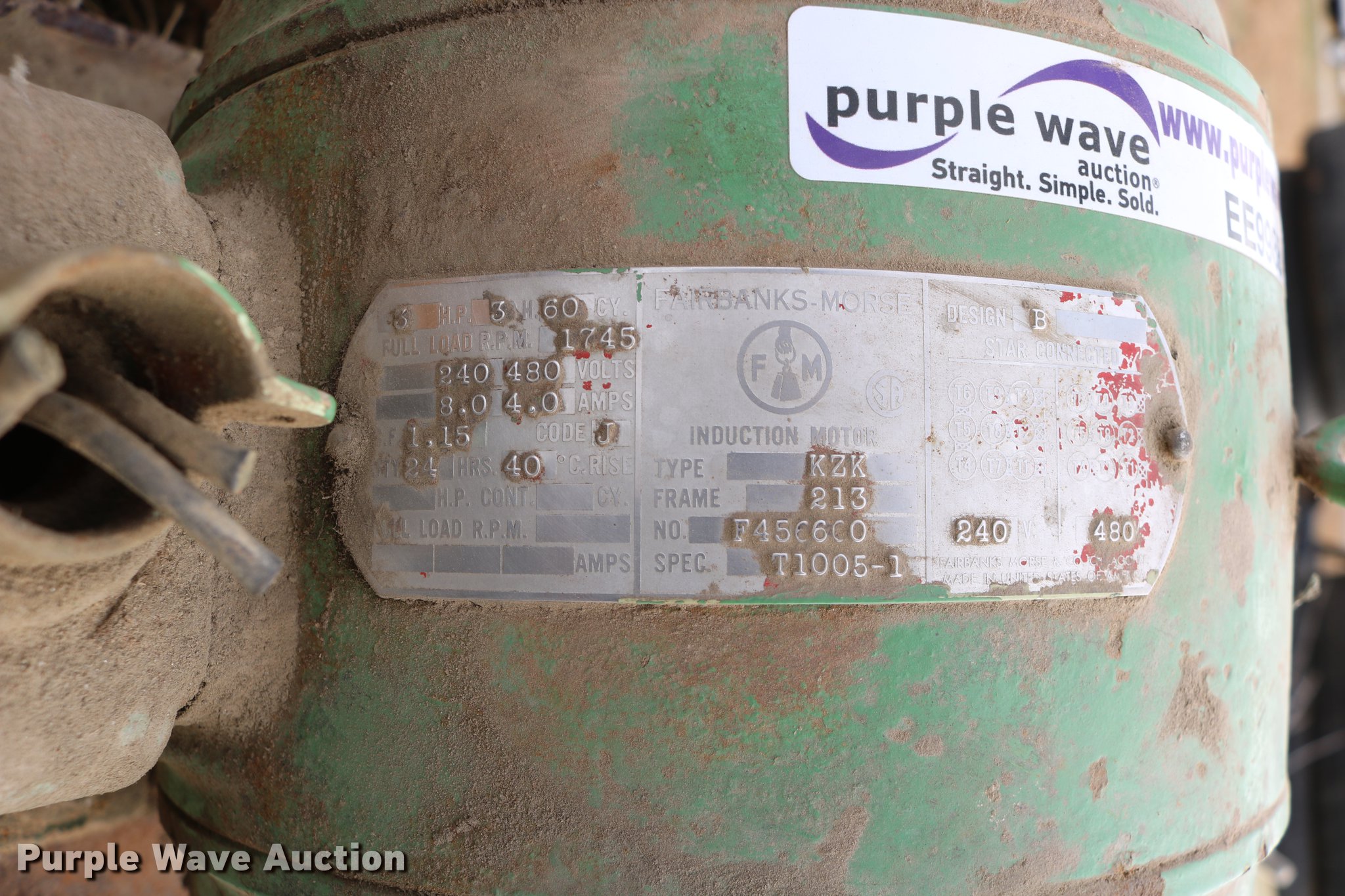 Purple Wave is selling a used Electric Motor in Kansas. This item is a Fairbanks Morse electric motor with the following: 3 HP, Three phase, Unknown operating condition, Stainless steel bolts
