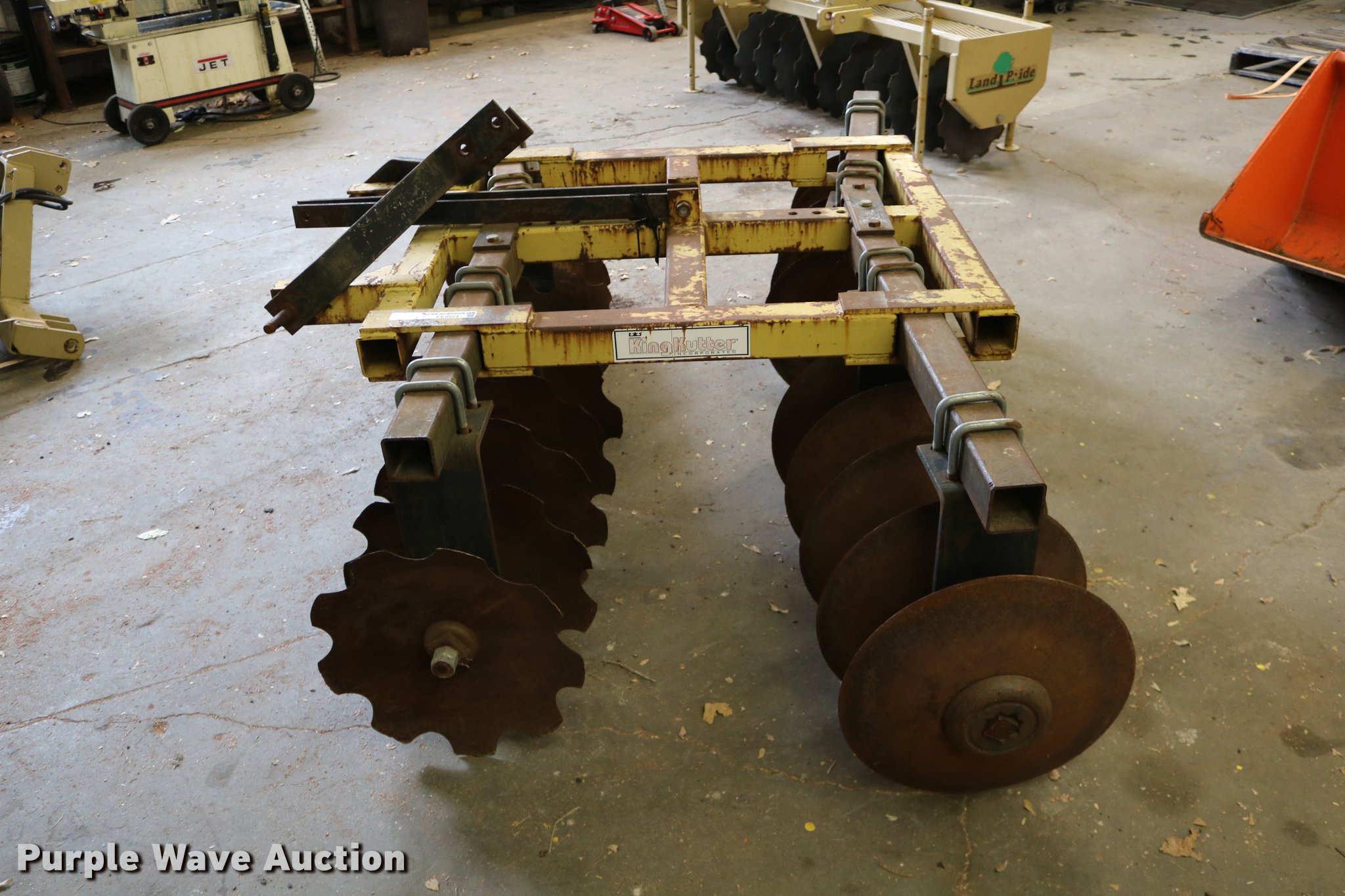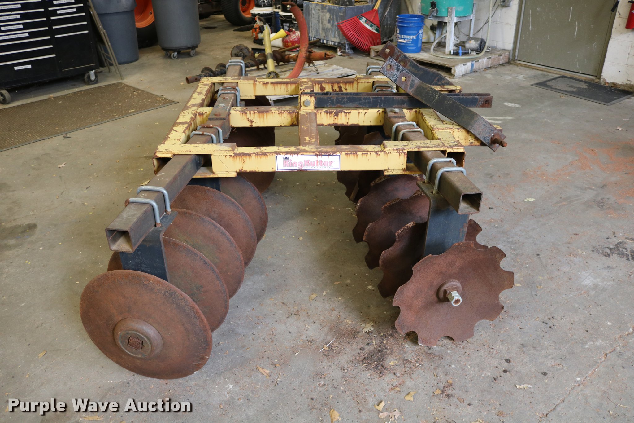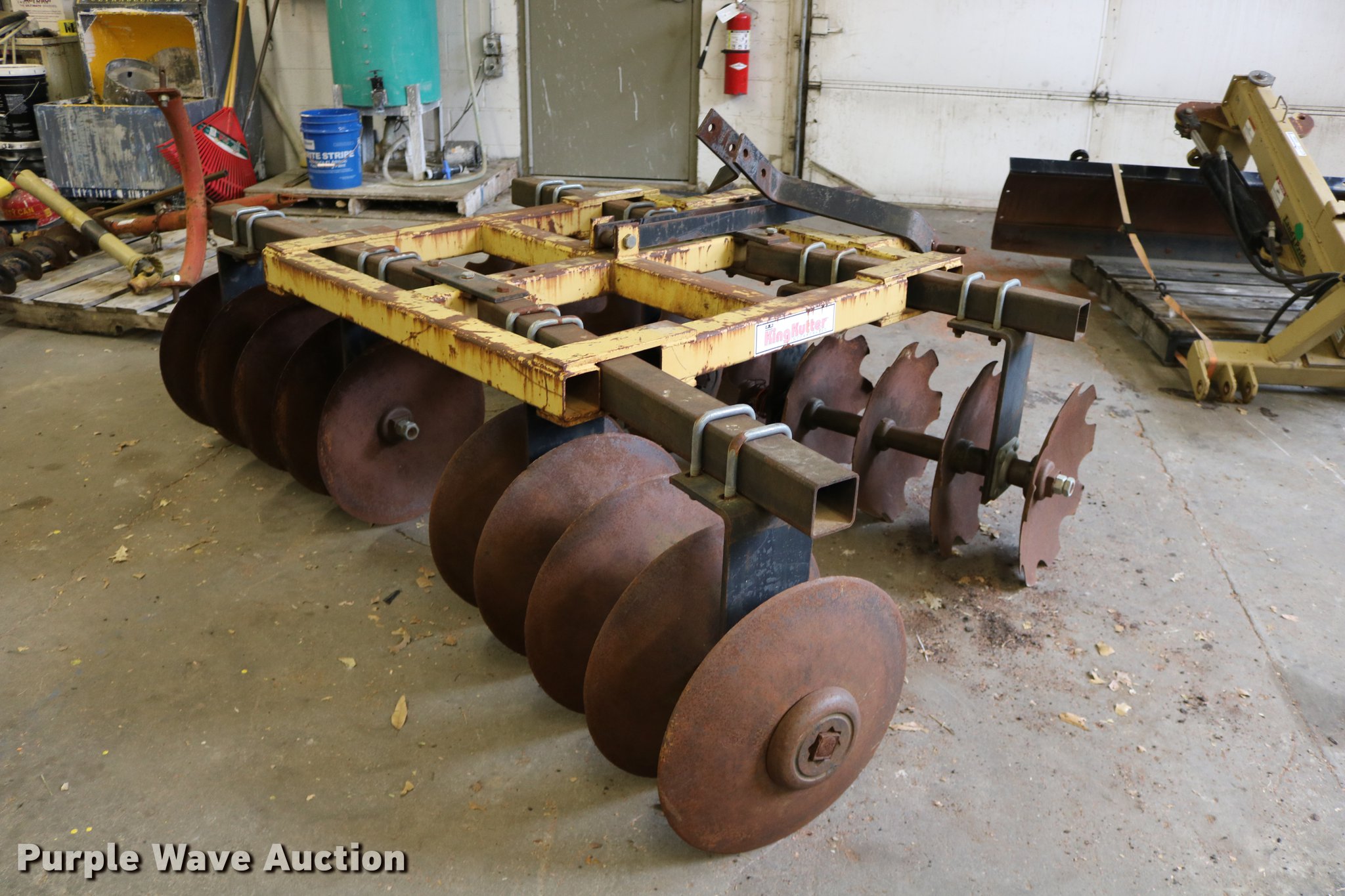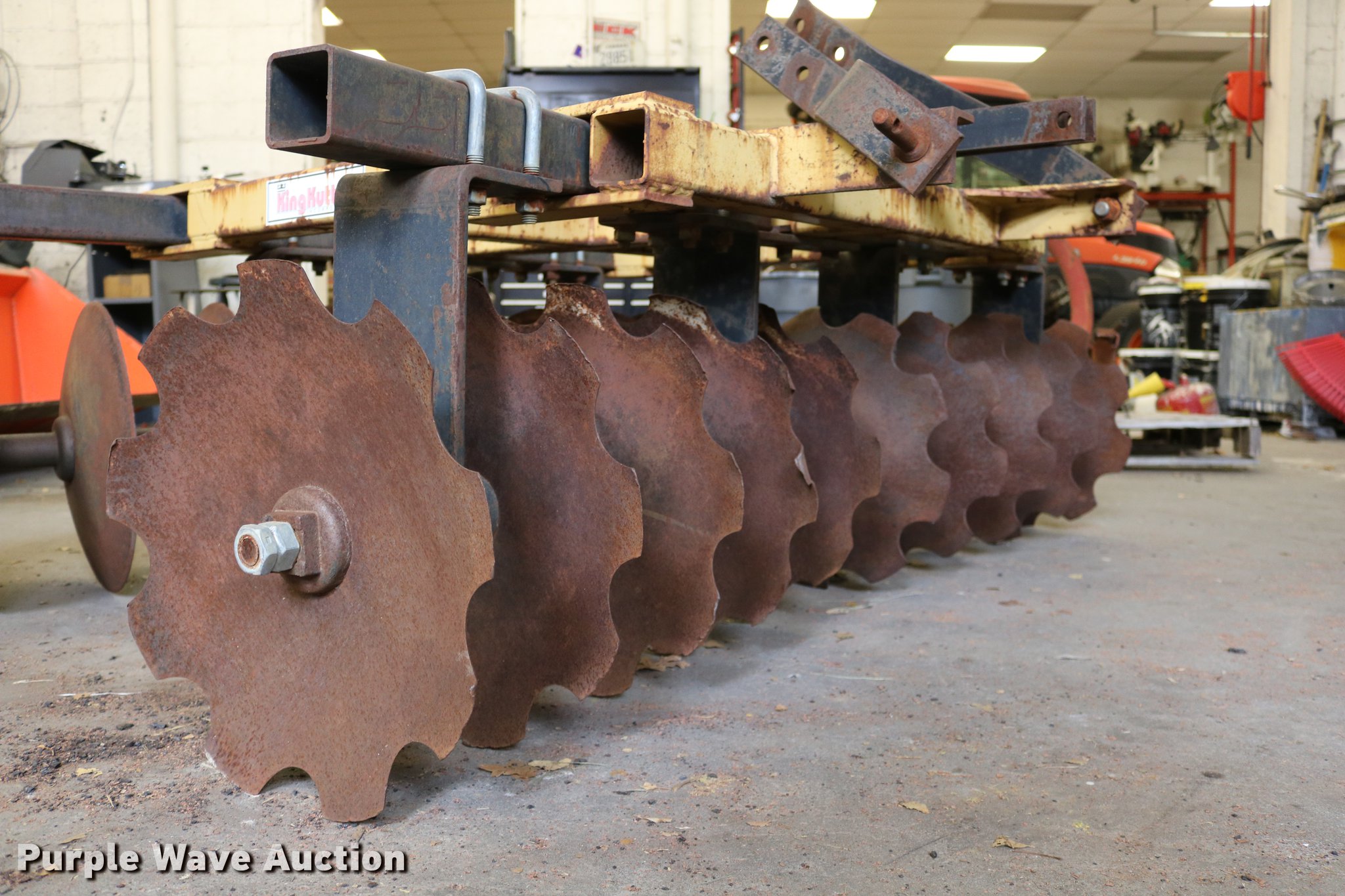 Purple Wave is selling a used Disk in Kansas. This item is a King Kutter disk with the following: 7'W, 17 3/4" front scalloped disks, 17 3/4" diameter rear disk blades, Three point