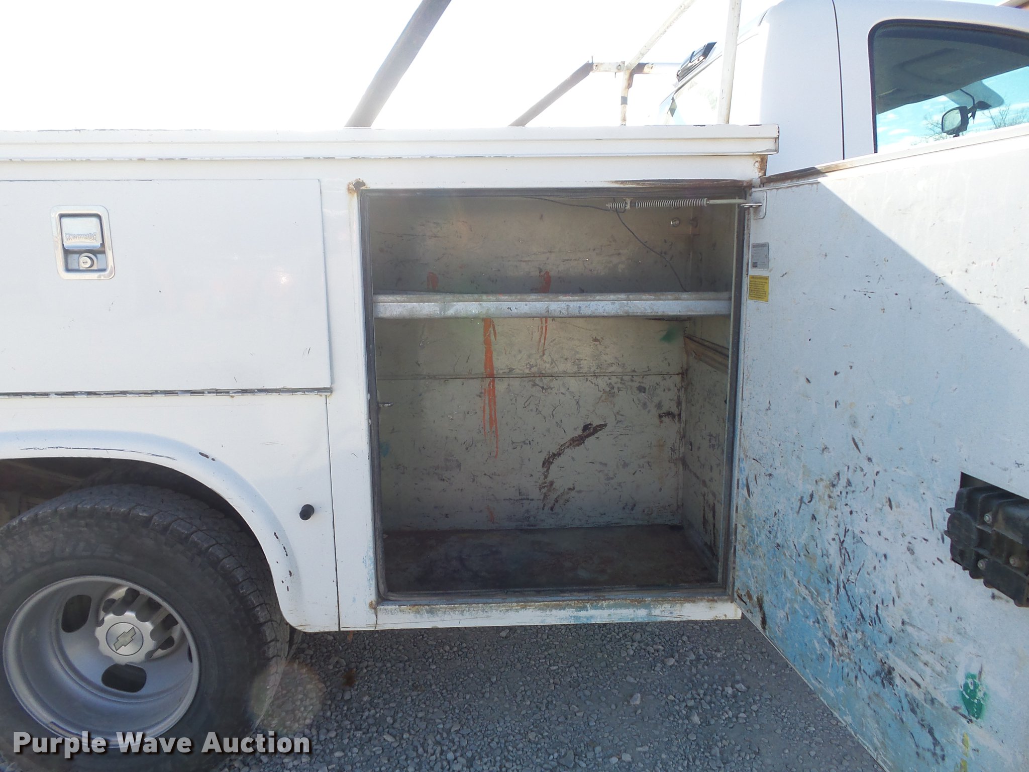 2007 Chevrolet 3500HD pickup truck. 374,407 miles on odometer, 6.6L V8 OHV 32V diesel engine, Automatic transmission, Four wheel drive, AC and heat, Tilt, Cruise, AM/FM/CD, Manual locks, windows and mirrors, Cloth interior, Knapheide 7108DFJ40 utility bed 9'L, Ladder rack, Trailer wiring, Receiver hitch, LT215/85R16 tires, Unit# 6. Illinois title. 1GBJK34687E535335. Haier Plumbing and Heating Inc.. Okawville, IL 62271