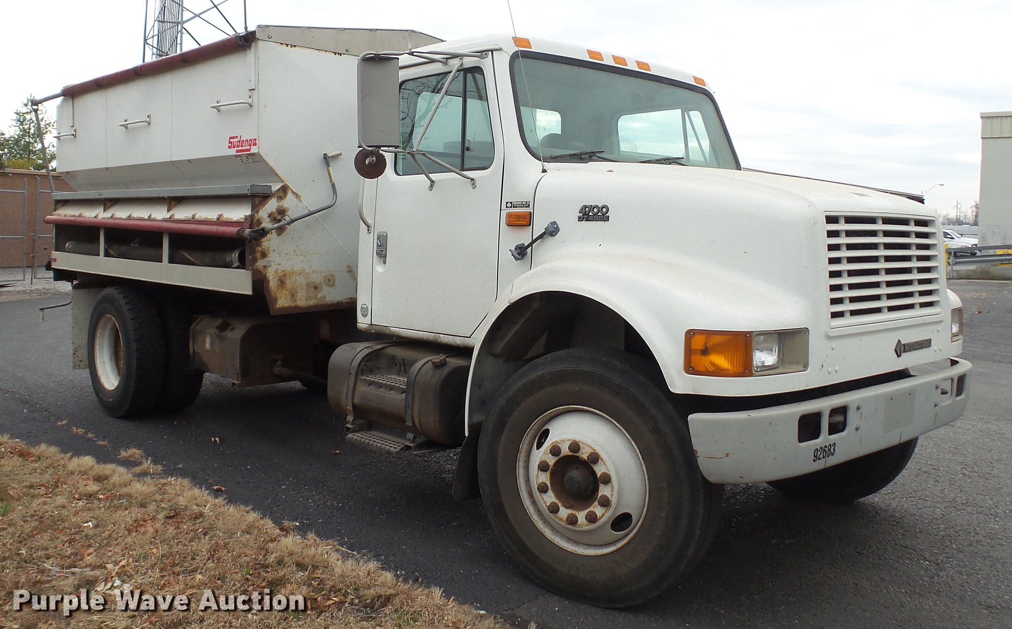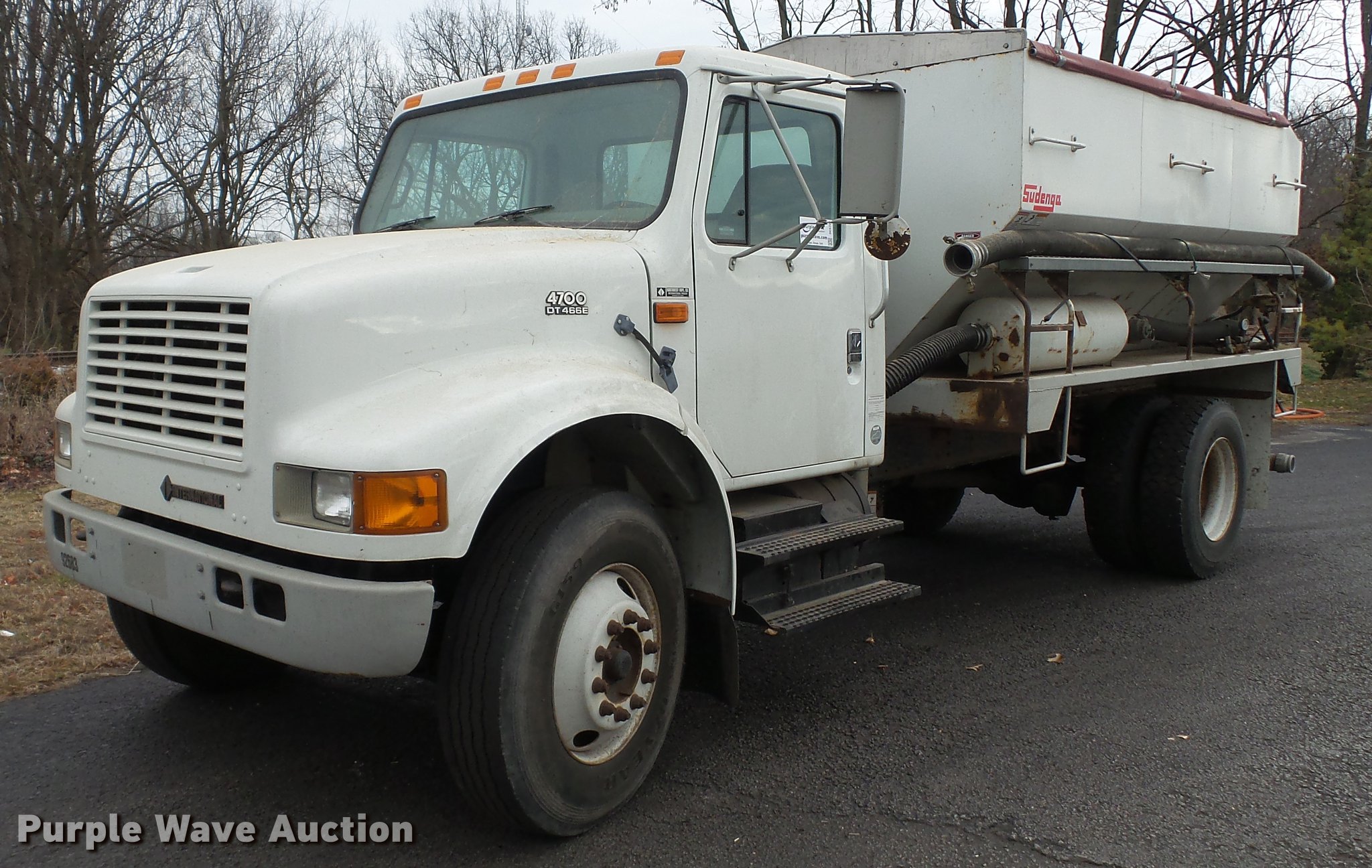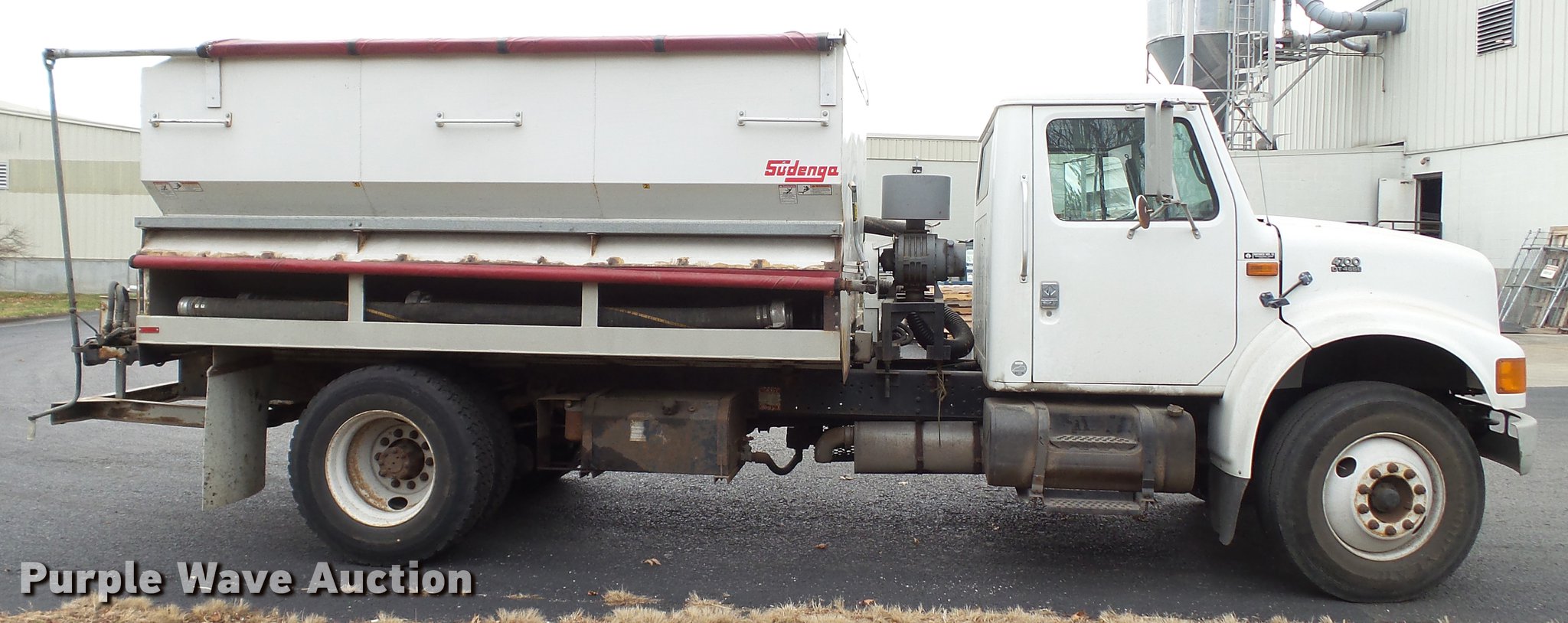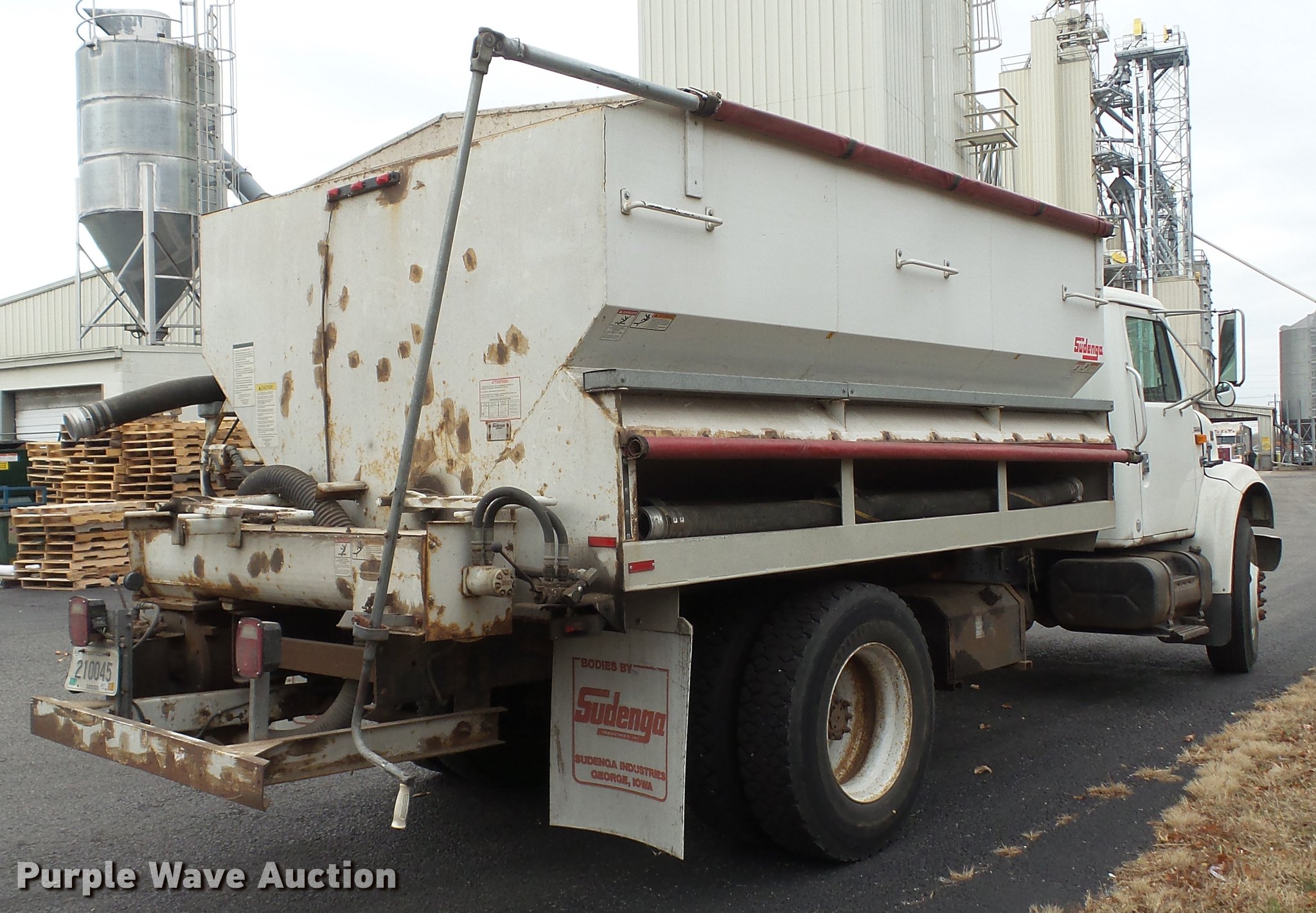 Purple Wave is selling a used Fertilizer or Feed Delivery Truck in Kentucky. This item is a 2000 International 4700 feed truck with the following: 28,115 miles on odometer, 4,231 hours on meter, International DT466 7.6L L6 turbo diesel engine, Seven speed manual transmission, Single axle, AC and heat, AM/FM, Air suspension seat, Block heater, Front tow hooks, PTO, Wet kit, Sudenga feeder bed, Model ST912P-00-08-99, 12'L x 8'W, Two bins, Manual roll tarp, Hose storage, Roll up cover, Hoses, Serial 9407, Wm. W. Meyer & Sons 12x12 pump, 4" outlet, Serial 2001014-1, Sutorbilt blower, Additional pump and blower, Unknown operating condition, Storage boxes, Single fuel tank, Spring suspension, Air brakes, Goodyear 11R22.5 tires