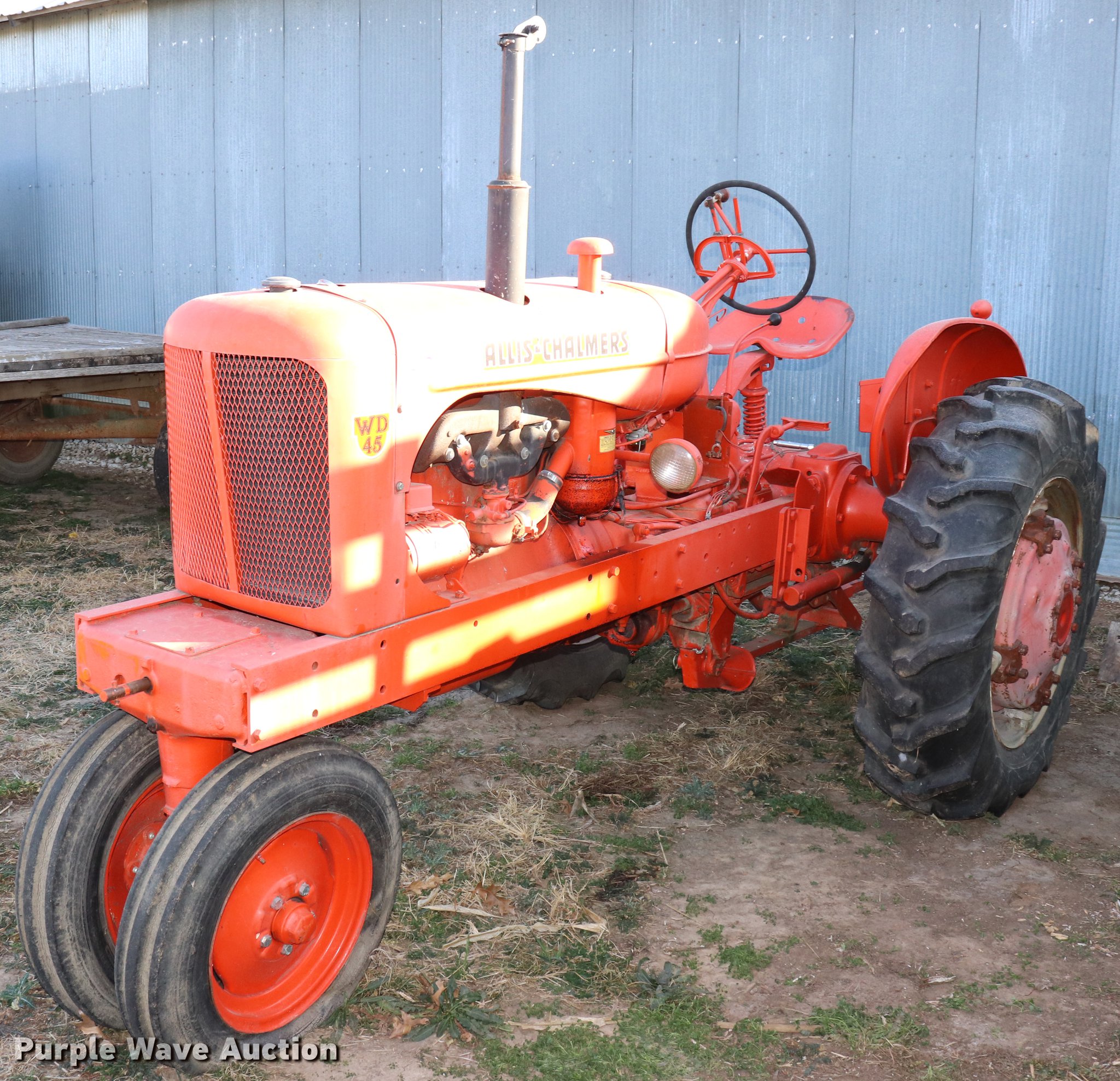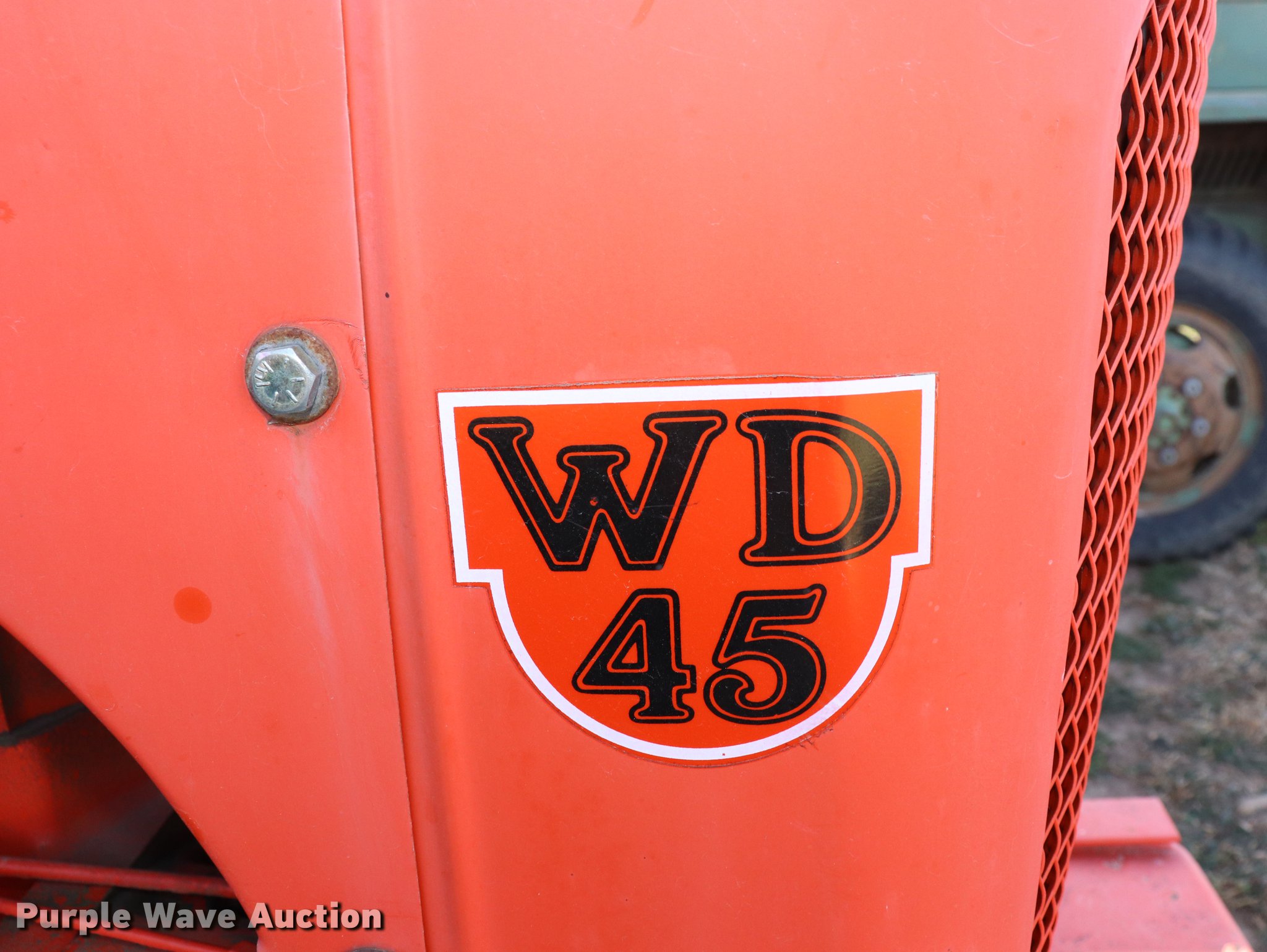 Purple Wave is selling a used Tractor in Kansas. This item is a Allis Chalmers WD45 tractor with the following: Four cylinder gas engine, Manual transmission, 4F-1R gears, Suspension seat, Front work lights, Three point, 540 PTO, 5.50-16SL front tires, 13.6-28 rear tires, Low front tires, No battery, Serial 899835