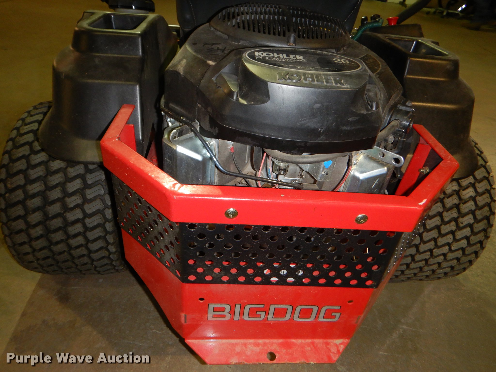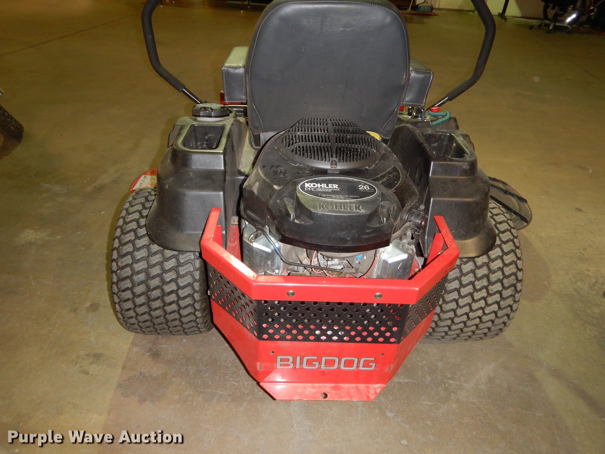 Purple Wave is selling a used Lawn Mower in Kansas. This item is a 2015 Big Dog Alpha MP 934661 ZTR lawn mower with the following: 20 hours on meter, 60" cut, Kohler Pro 7000 series gas engine, 26 HP, 13x8.50-8 front tires, 20x12.00-10 rear tires, Needs carburetor work, Hard to start, Dead battery, Serial 15115697