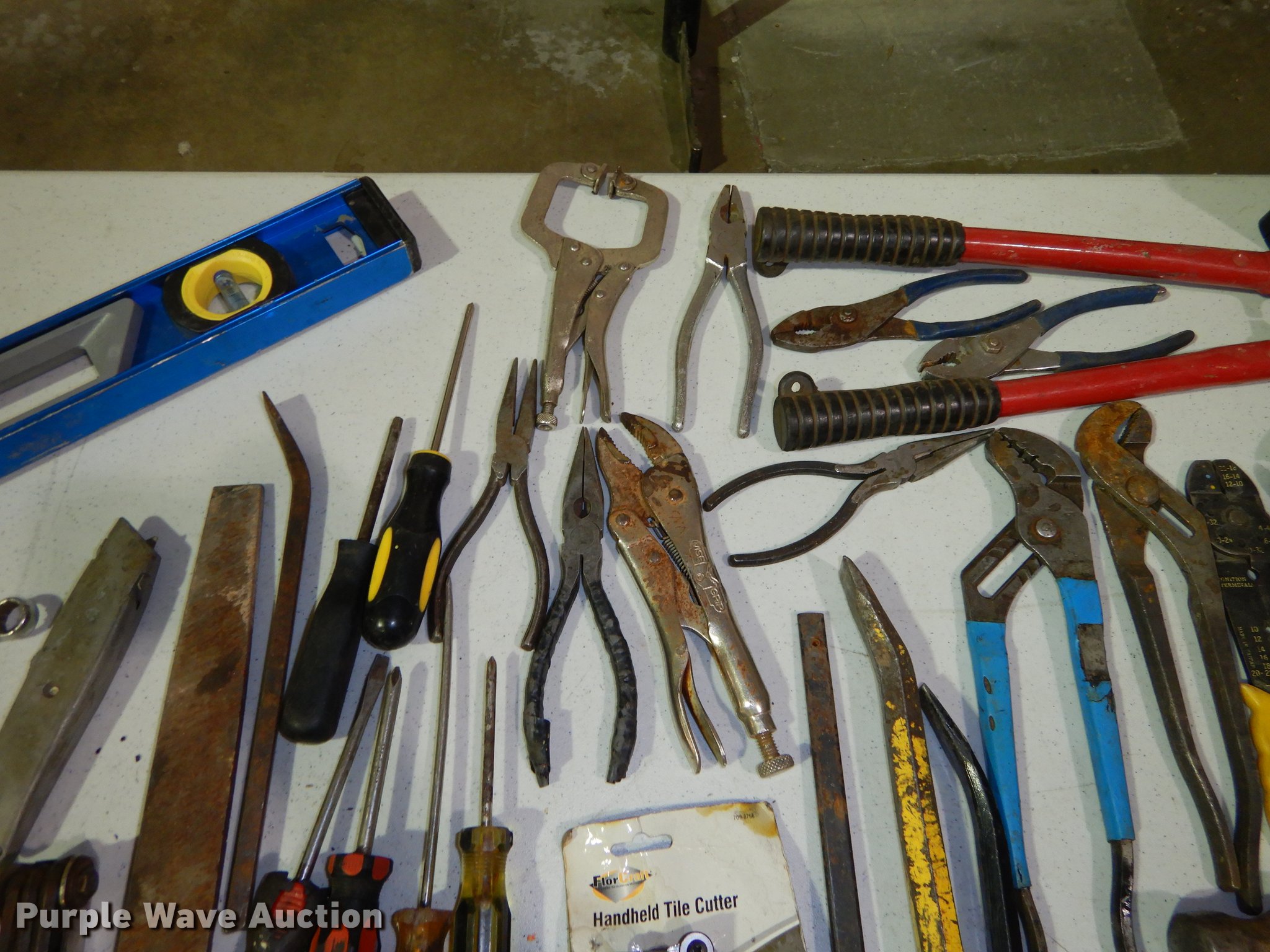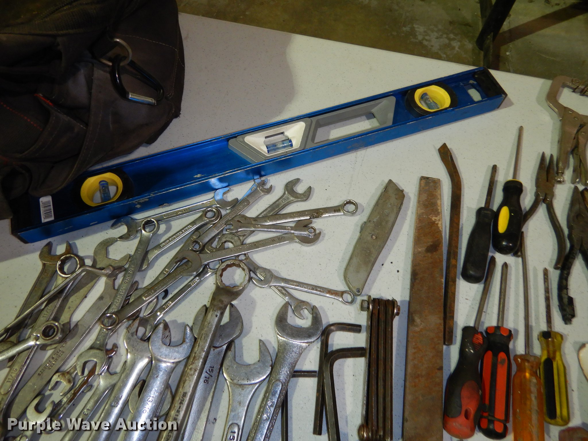 Purple Wave is selling a used Tools in Kansas. This item is a Tools with the following: 58" x 20" toolbox, One latch broken, Wrenches, Hammers, Sockets, Ratchets, Screw drivers and more