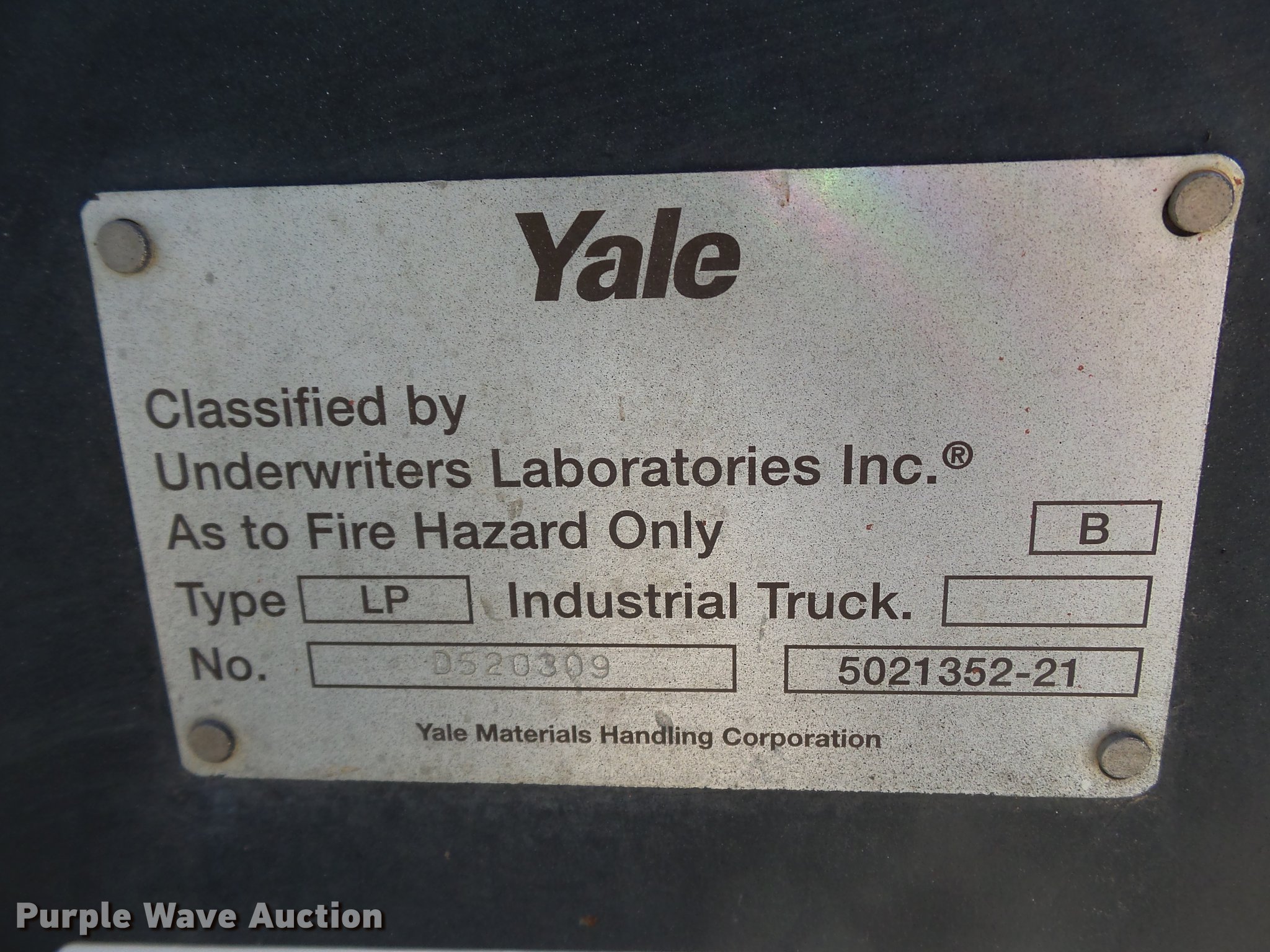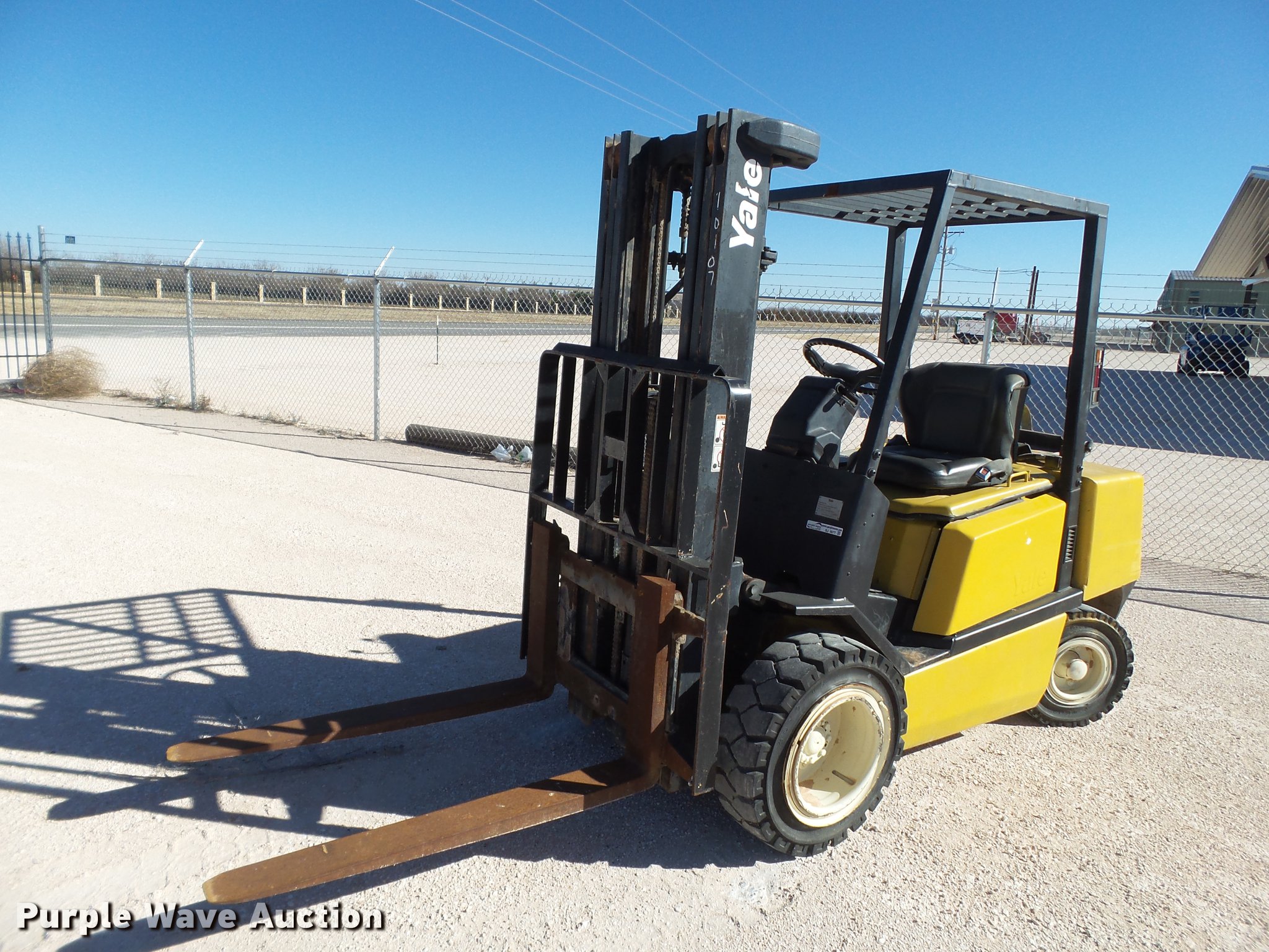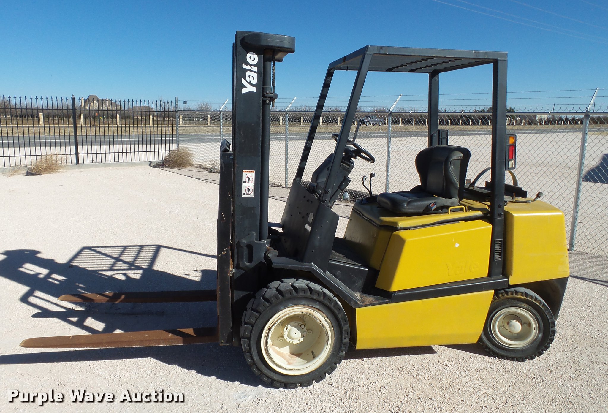 Purple Wave is selling a used Cushion Tire or Pneumatic Forklift in Texas. This item is a Yale forklift with the following: Yale four cylinder propane engine, OROPS, 3,000 lbs max lift capacity, 170" max lift height, Side shift, Mast shift, 40" fork length, Backup alarm, 28x9-15 front tires, 6.50-10 rear tires, Serial D520309