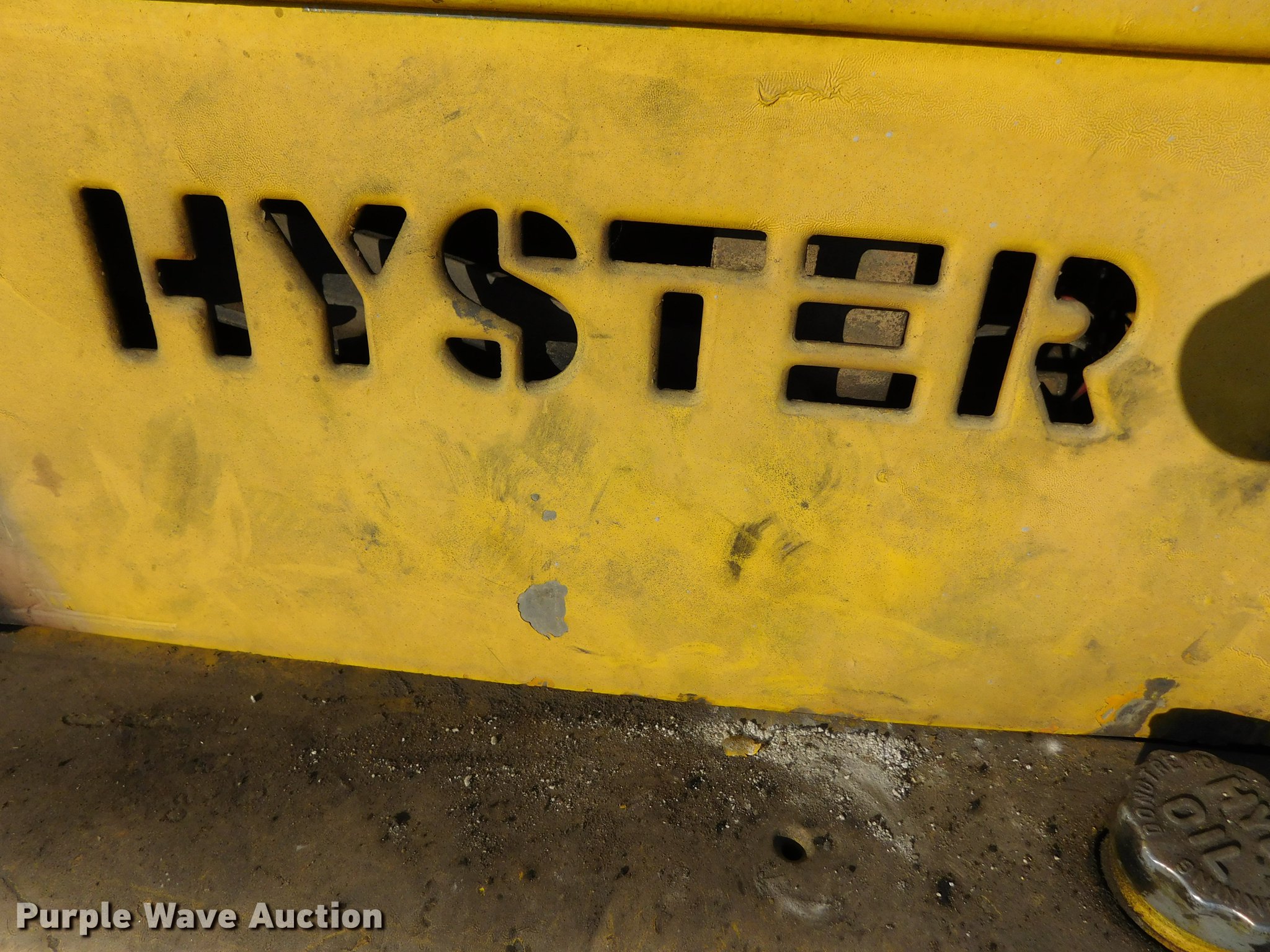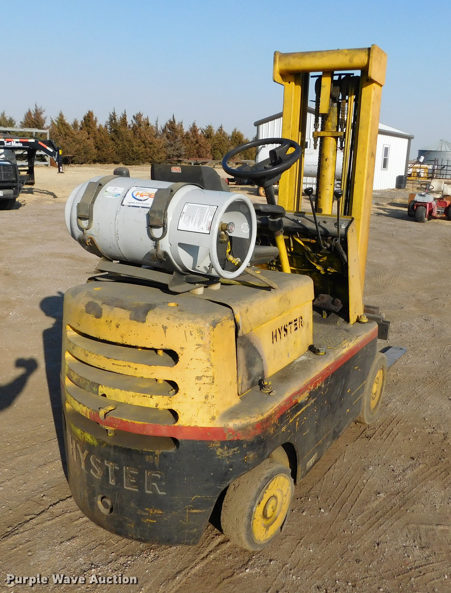 Purple Wave is selling a used Strt. Mast Rough Terr. Forklift in Kansas. This item is a Hyster forklift with the following: Four cylinder propane engine, 1F-1R gears, Two mast stages, Side shift, Mast tilt, 42" fork length, Solid tires, Serial 3788