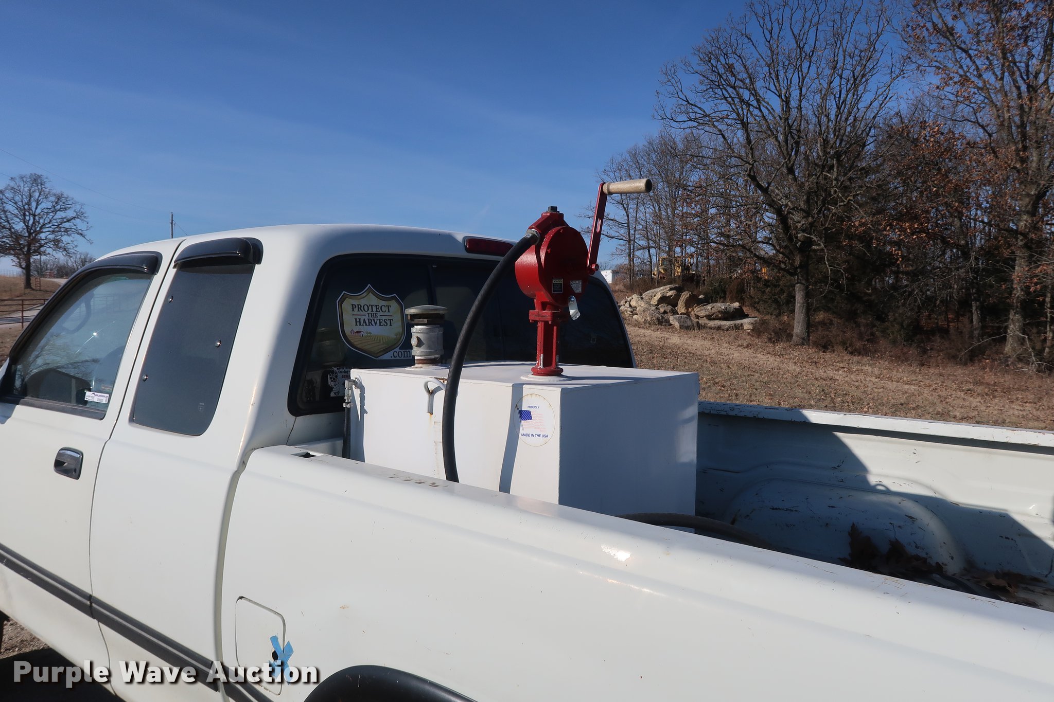 1996 Toyota T100 SR5 XtraCab pickup truck. 220,540 miles on odometer, 3.4L V6 DOHC 24V gas engine, Five speed manual transmission, Four wheel drive, AC and heat, AM/FM/CD, Power windows, locks, and mirrors, Cloth interior, Auxiliary fuel tank Currently plumbed to engine, Receiver hitch, Trailer wiring, 33x12.50R15 tires, Factory fuel tank needs replaced, Cracked windshield. Missouri title. JT4UN24D4T0023815. Lucas Cattle Company. Cross Timbers, MO 65326