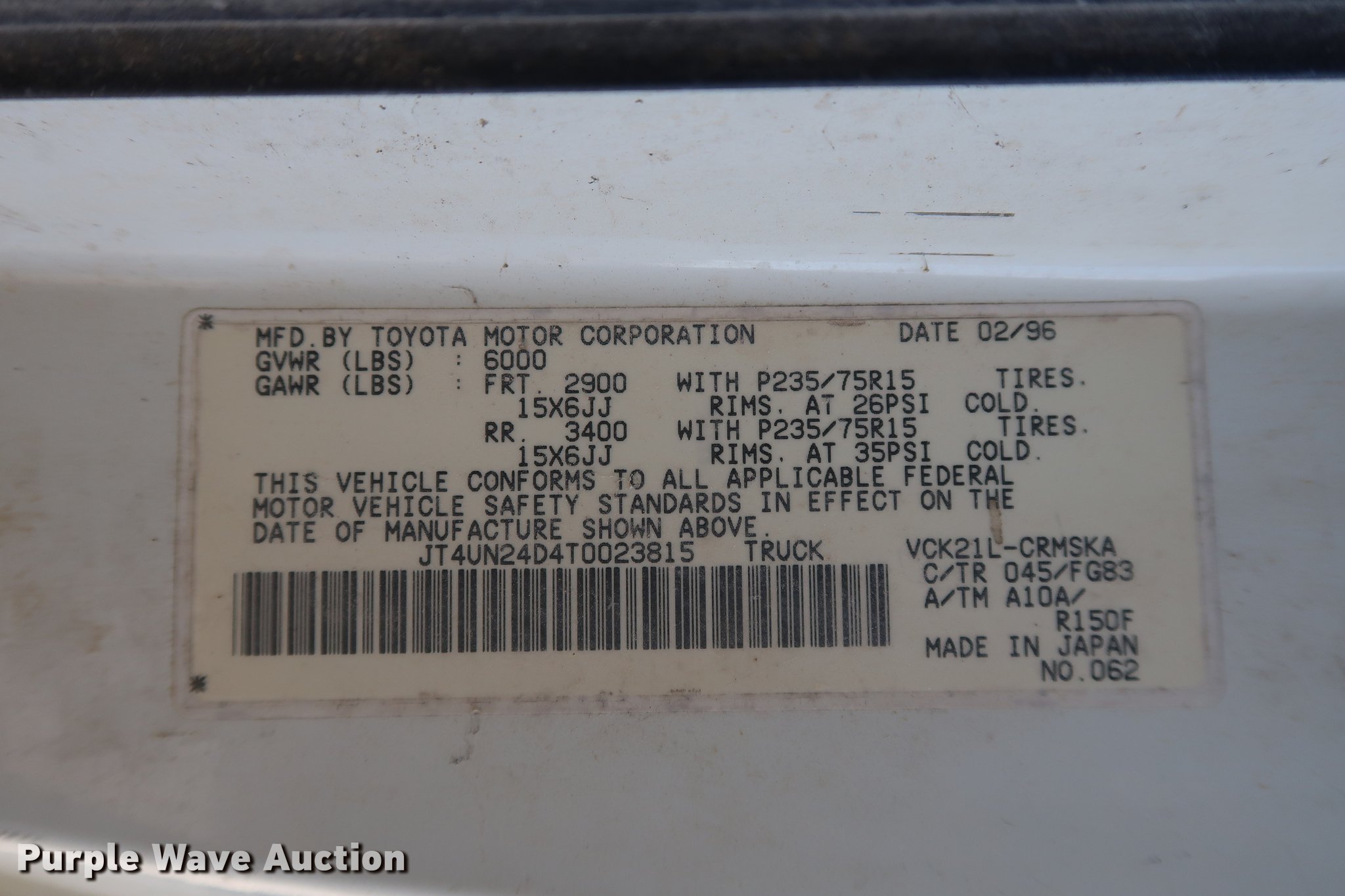 Take a look at this used 1996 Toyota T100 SR5 XtraCab pickup truck being sold on January 24th, 2018 in the SOLD! January 24 Vehicles and Equipment Auction made by Toyota. Take a look at all of the item information below or take a look at similar auctions for Pickups and Vans.